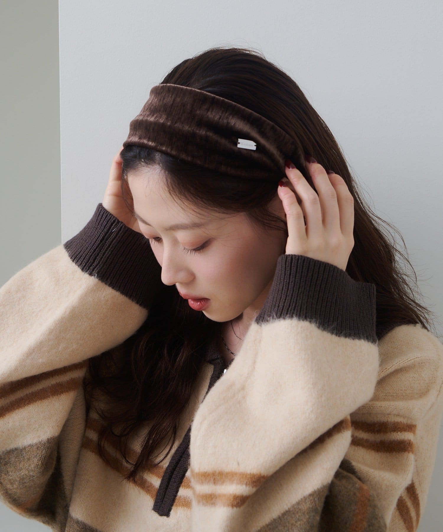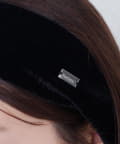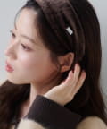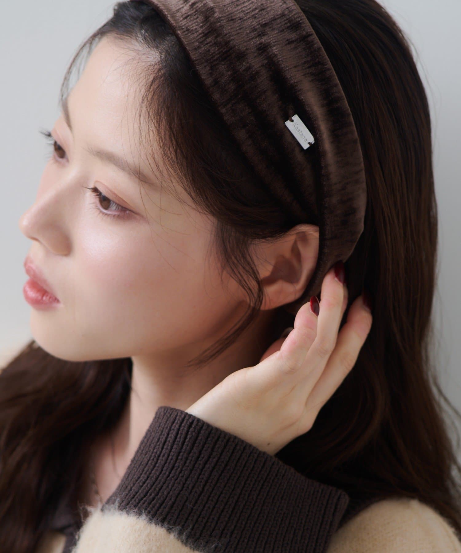 サイドのメタルプレートツヤと抜け感で、顔まわりを華やかに仕上げるベロアヘアバンドがさりげないアクセントに。