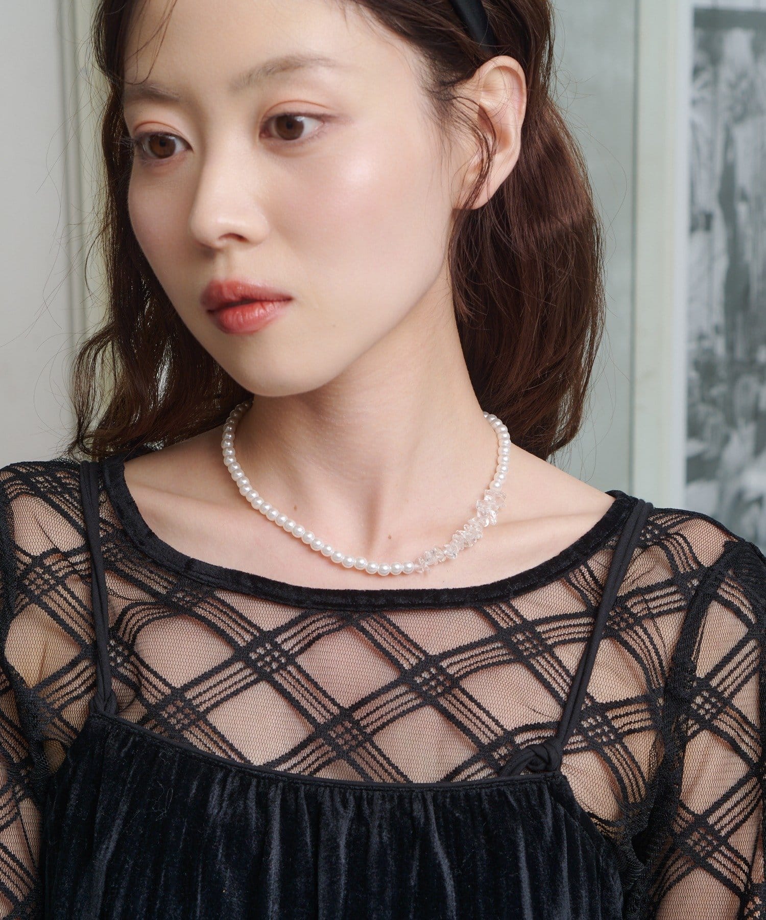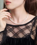 上品な艶感を放つパールに、ランダムカットのクリアストーンをミックスした、洗練されたデザインのネックレス。