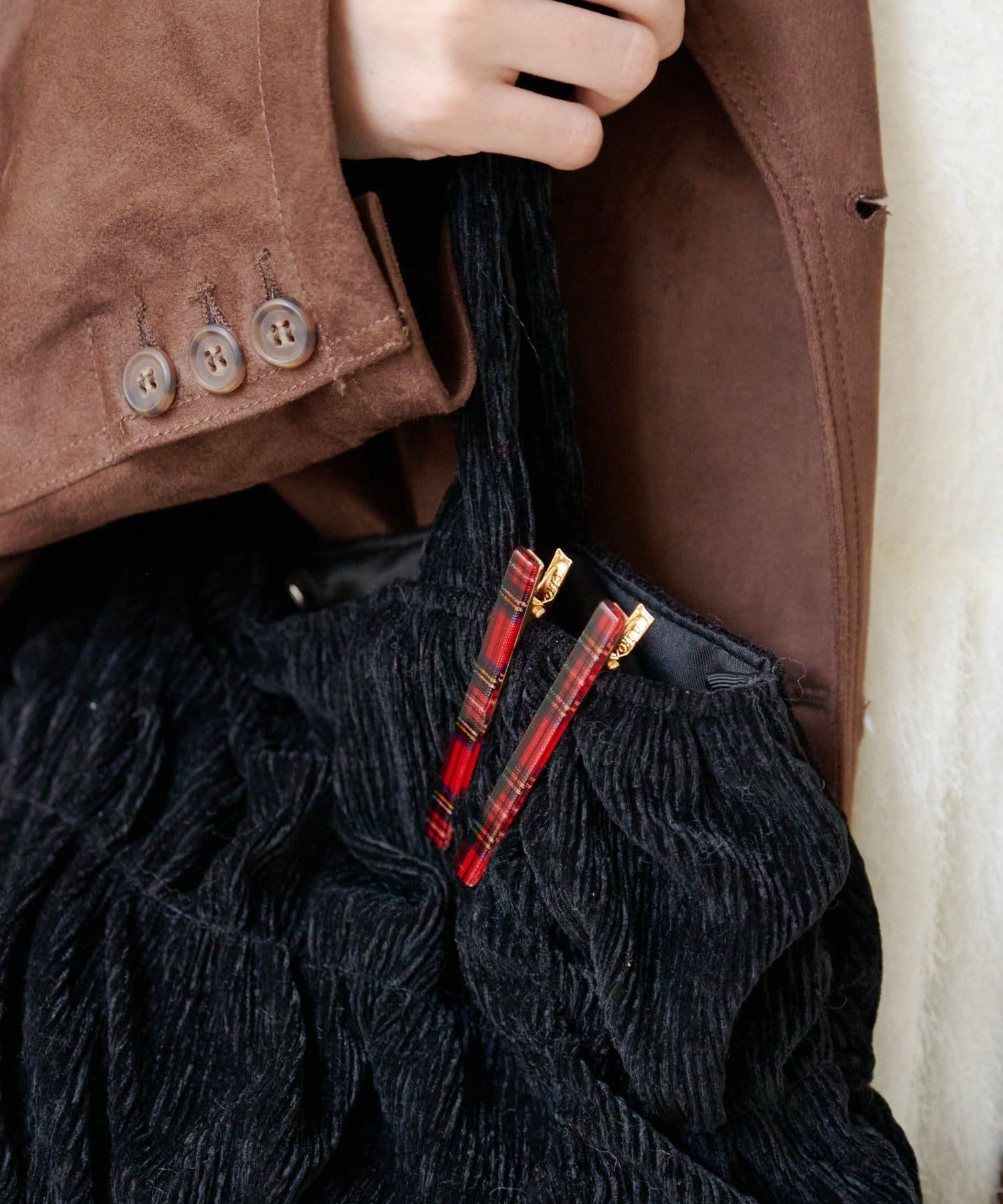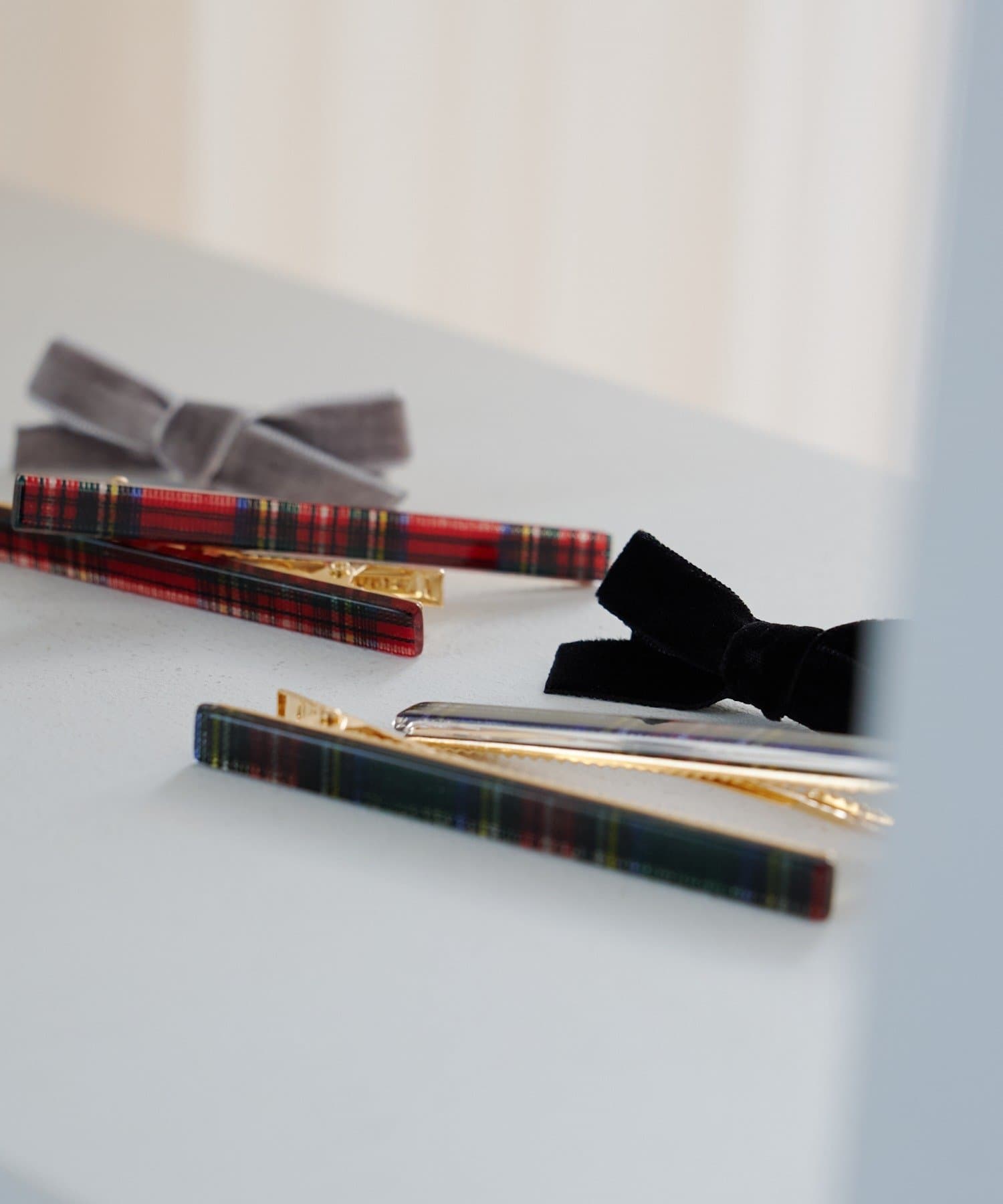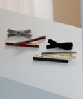 ベロア素材を使用したリボンピンと、細身のシルエットにチェックをあしらったスティックピンのセットです。