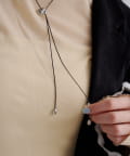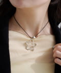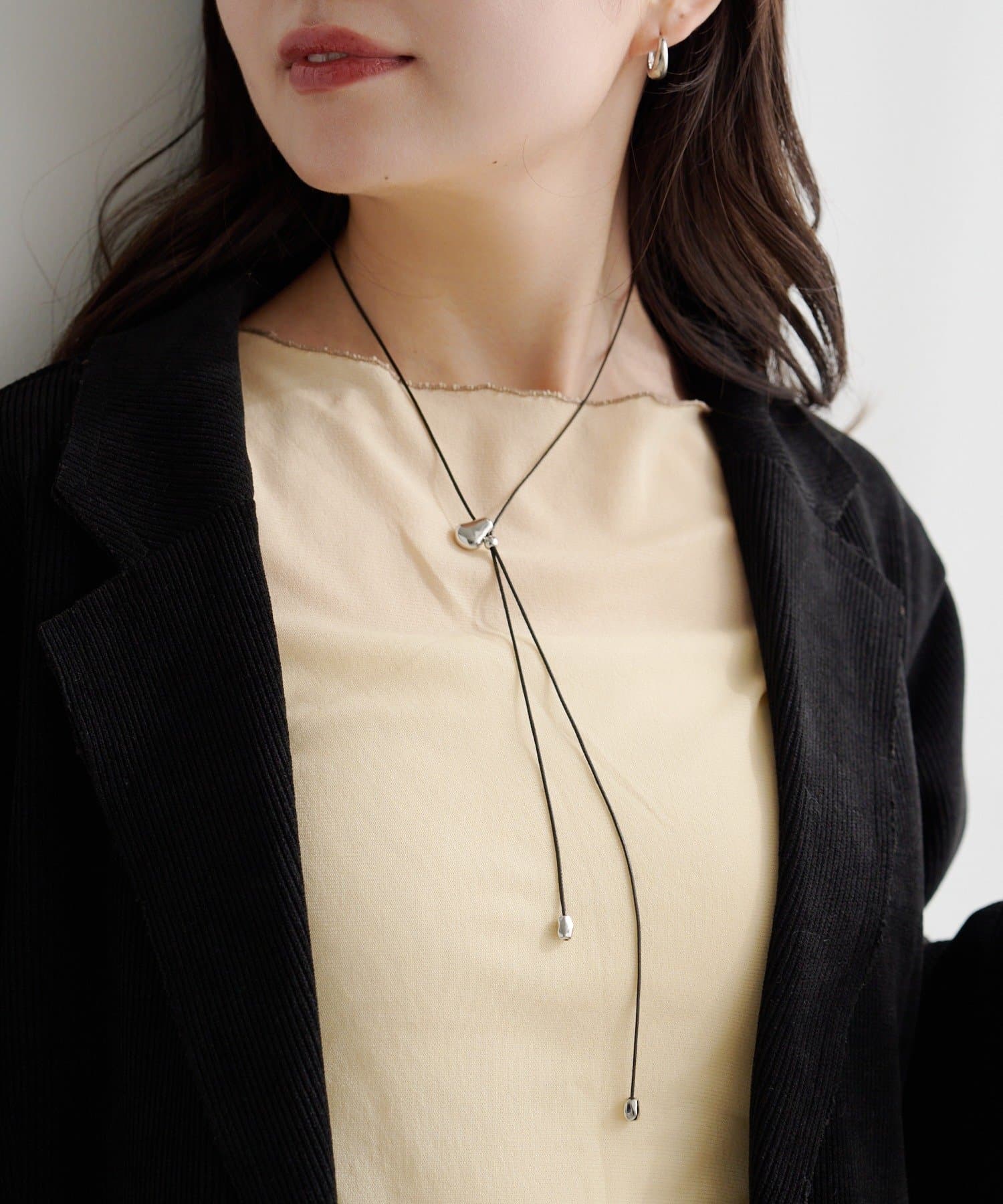 コード部分を引いて長さを調整でき、フラワーペンダントとして短くつけるスタイルと、ループタイ風にさらりと垂らすスタイルの2WAYで楽しめるのがポイント。