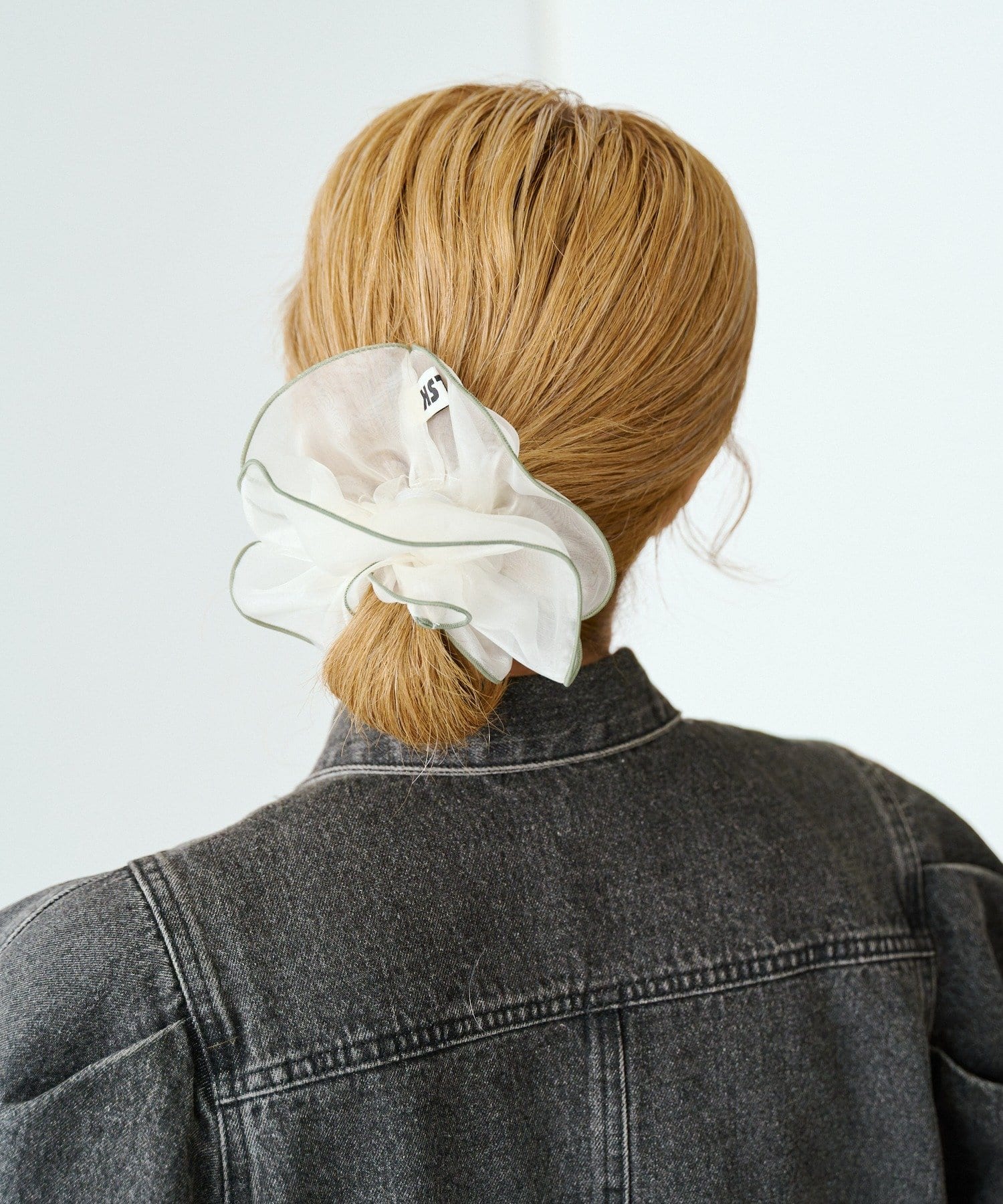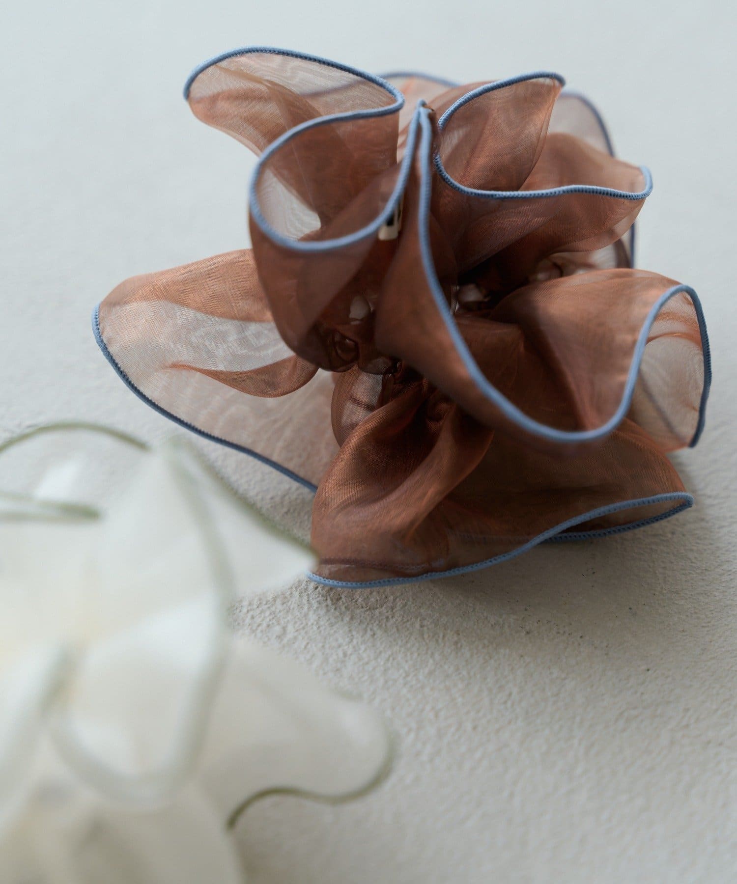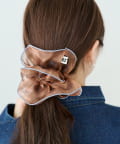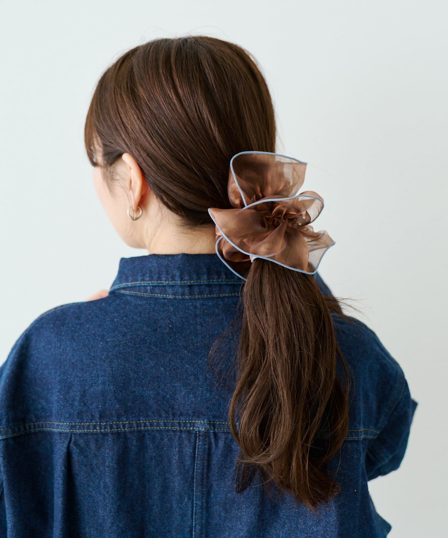ほんのり透け感のあるシアー素材に、配色のパイピングがアクセントになったシュシュ。