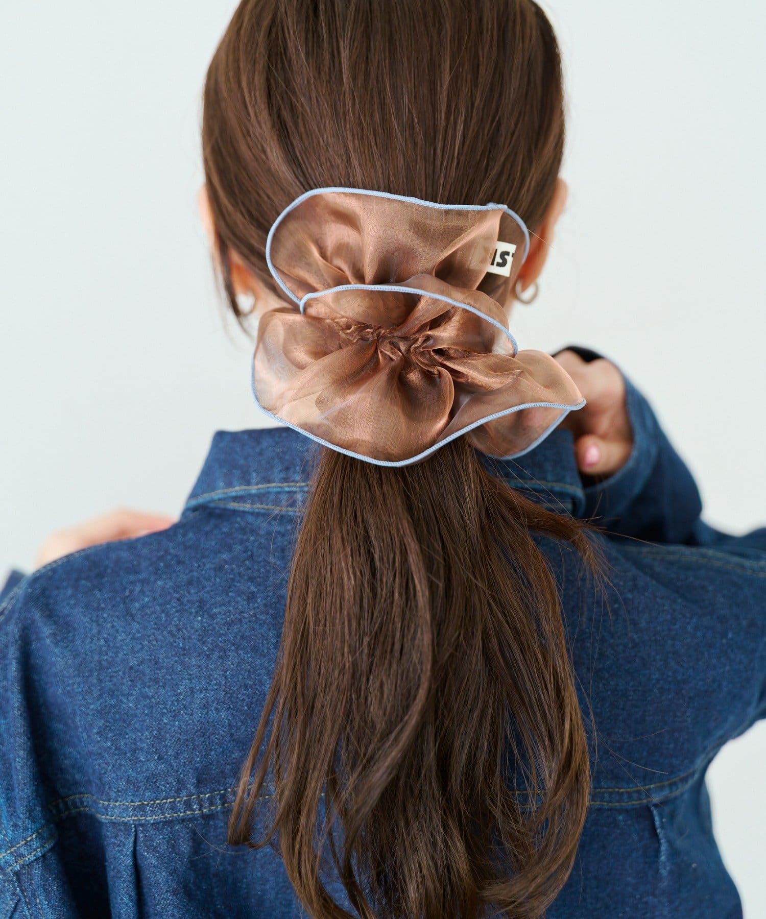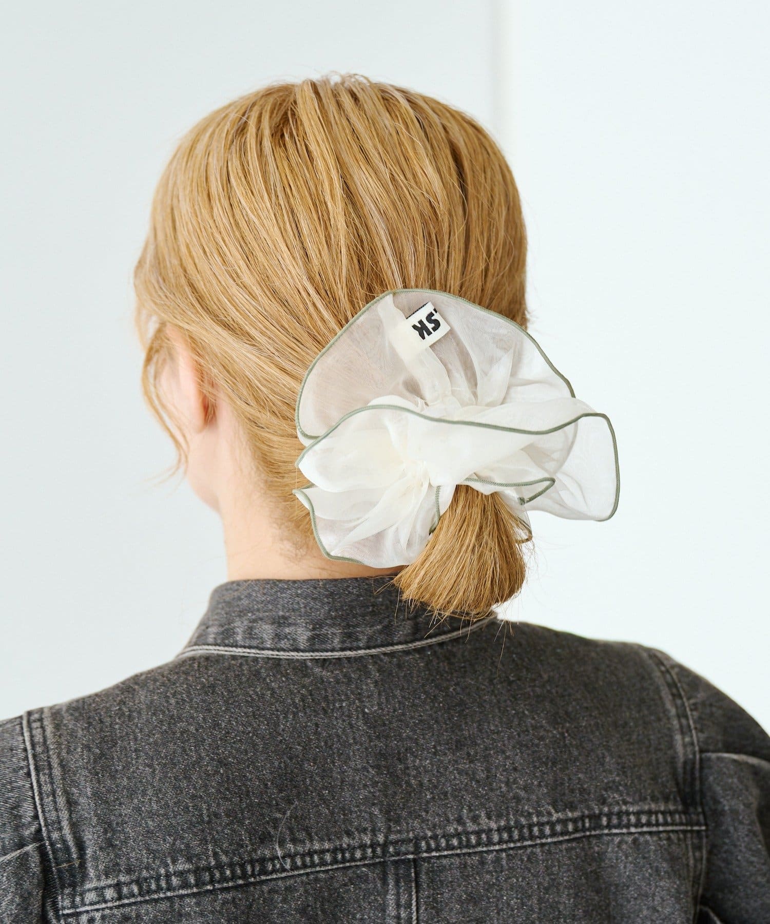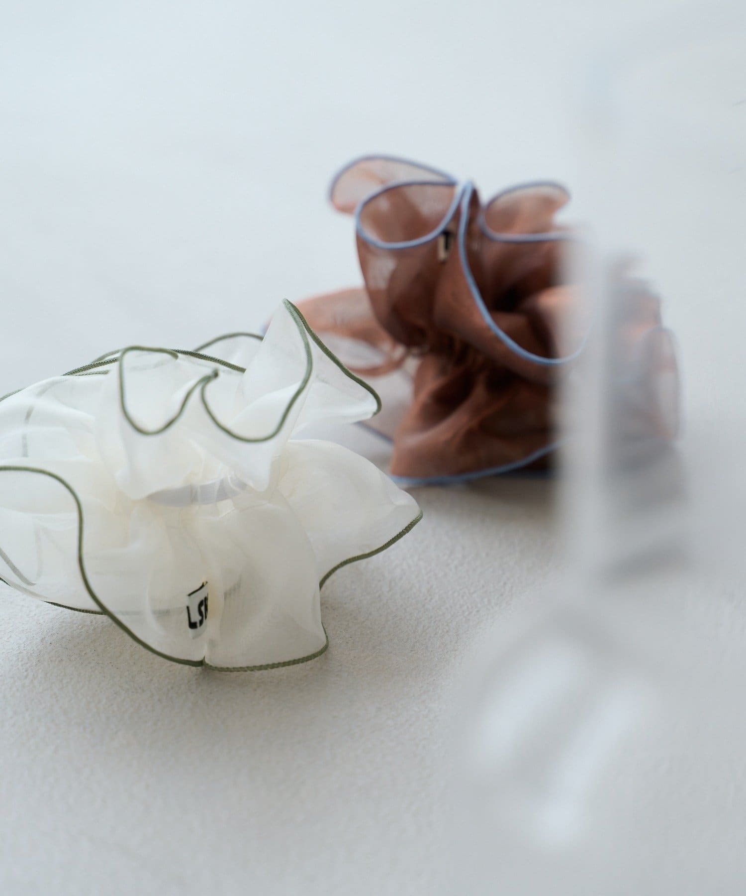 ほんのり透け感のあるシアー素材に、配色のパイピングがアクセントになったシュシュ。