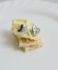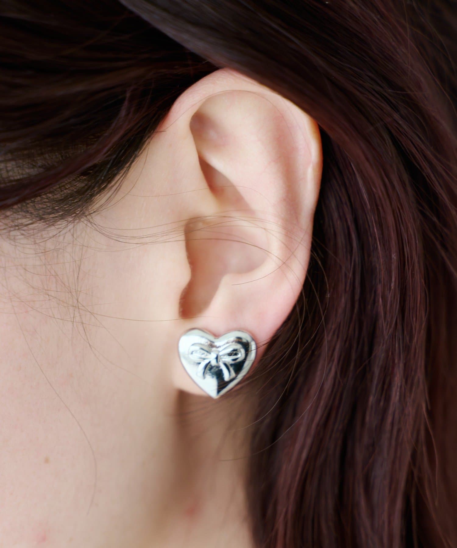 ころんとした立体ハートに、さりげないリボンモチーフをあしらったフェミニンなイヤリング。