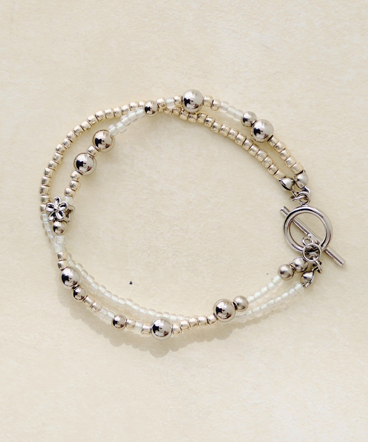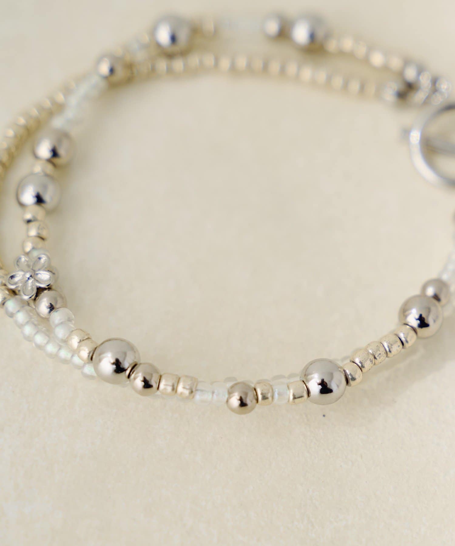 繊細な極細ビーズを主役にした、華奢見えデザインの二連ブレスレット。