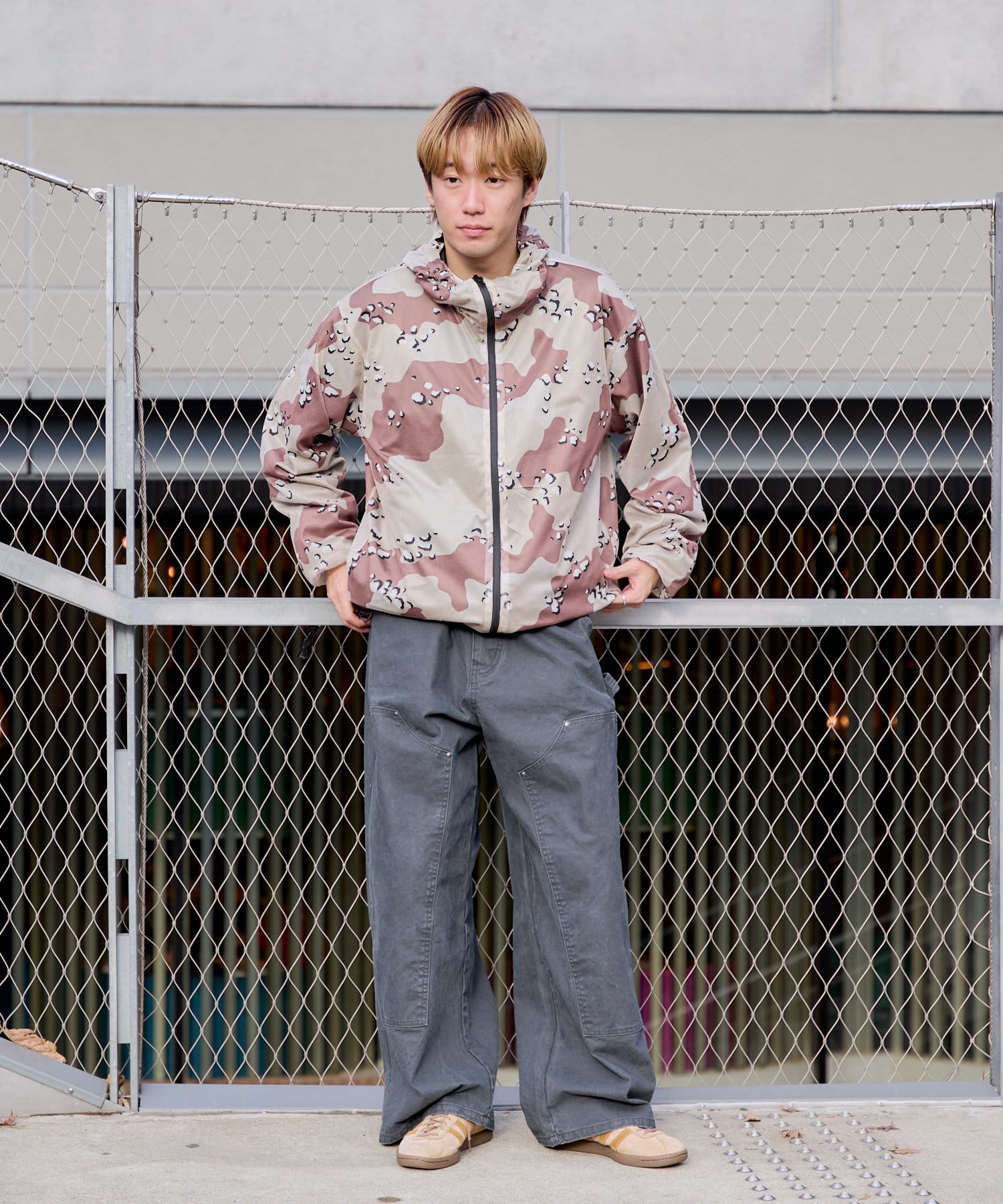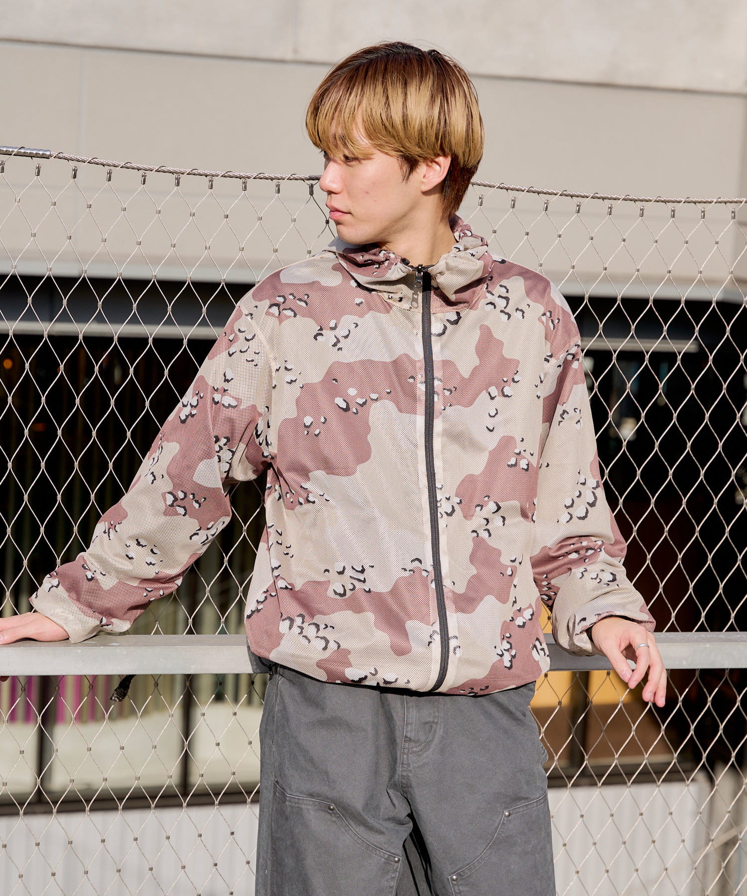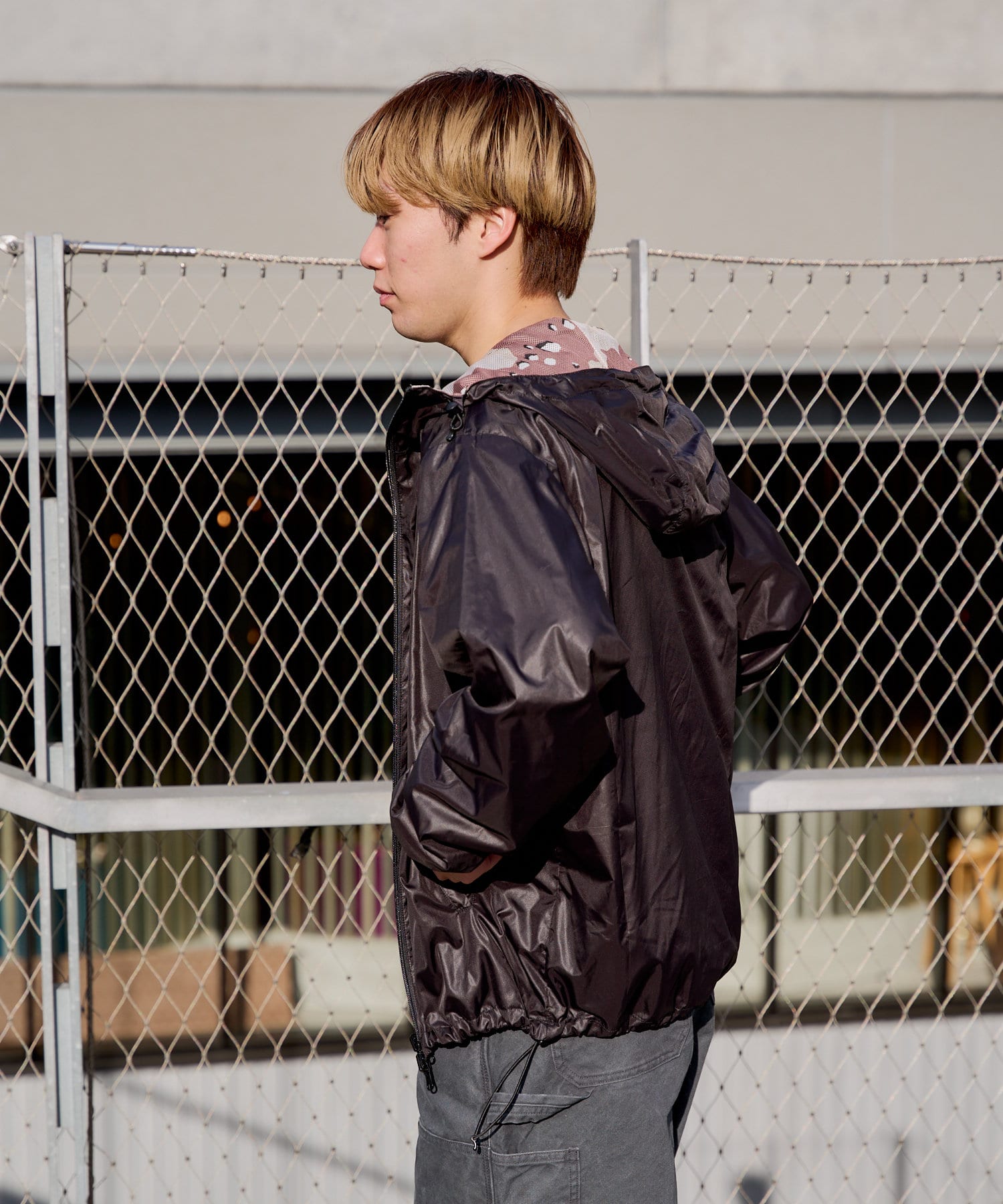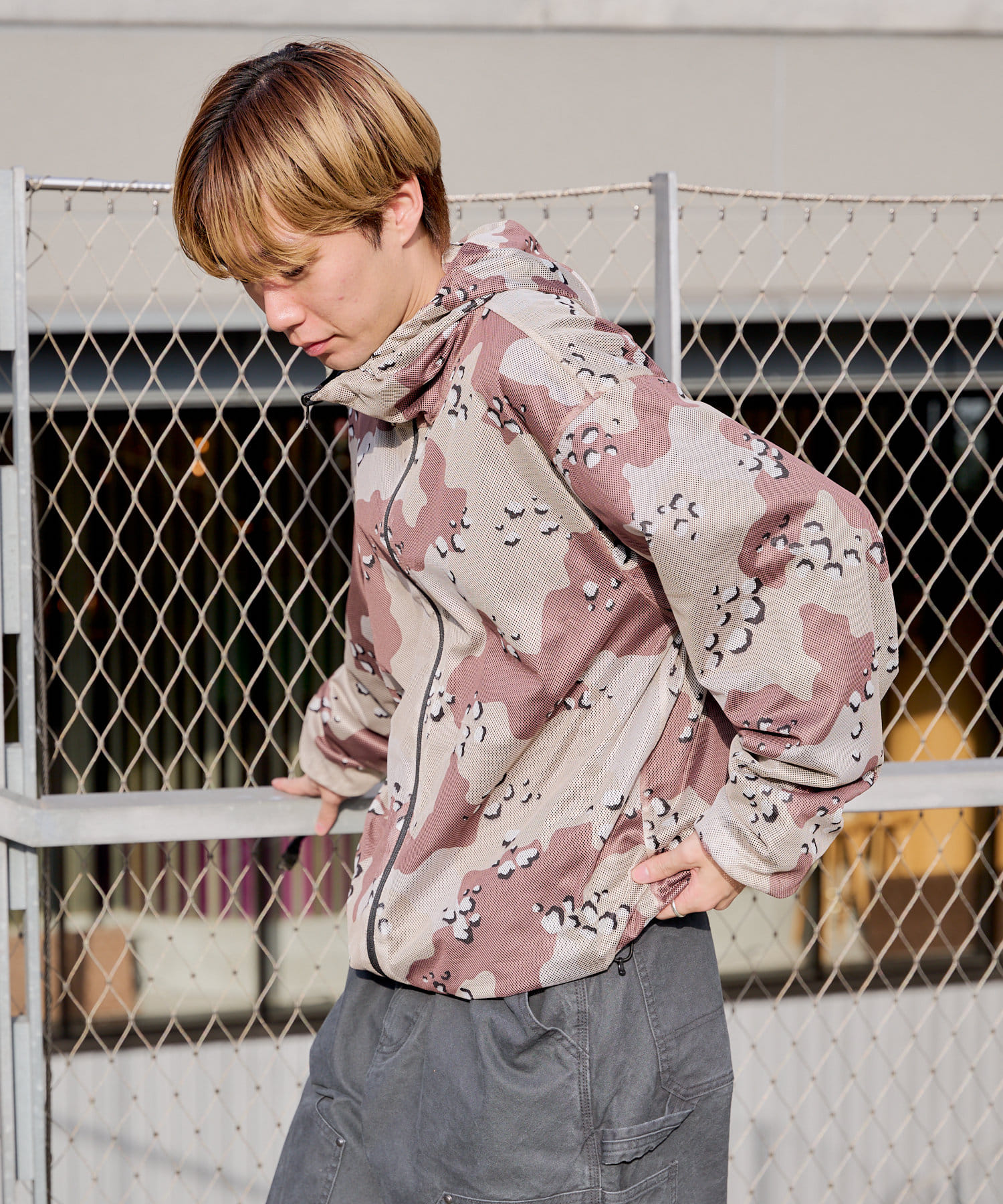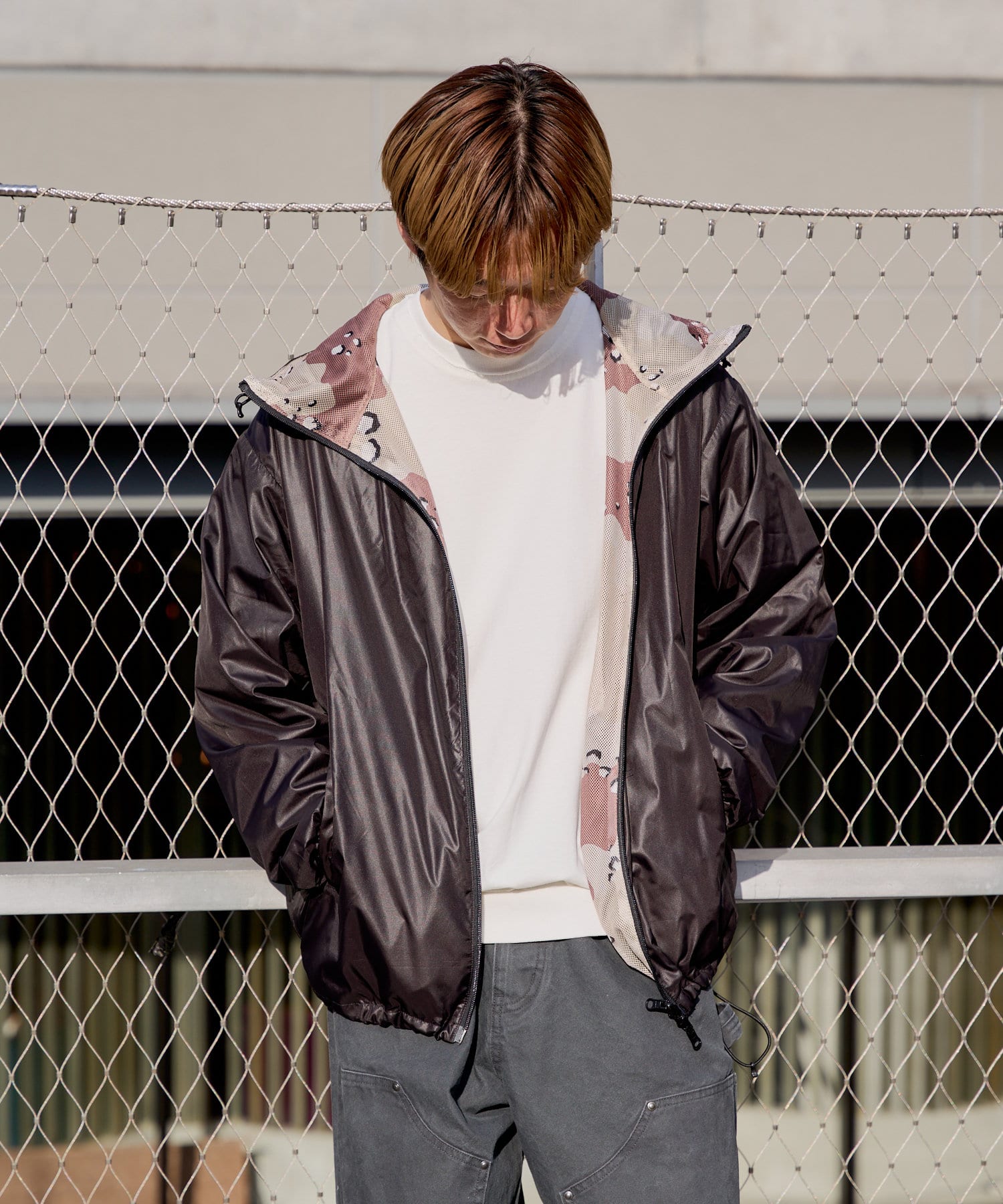 90年代アウトドアやハンティングアイテムのような雰囲気のある配色と迷彩柄が特徴的なメッシュ/ナイロンリバーシブルジップパーカーです。