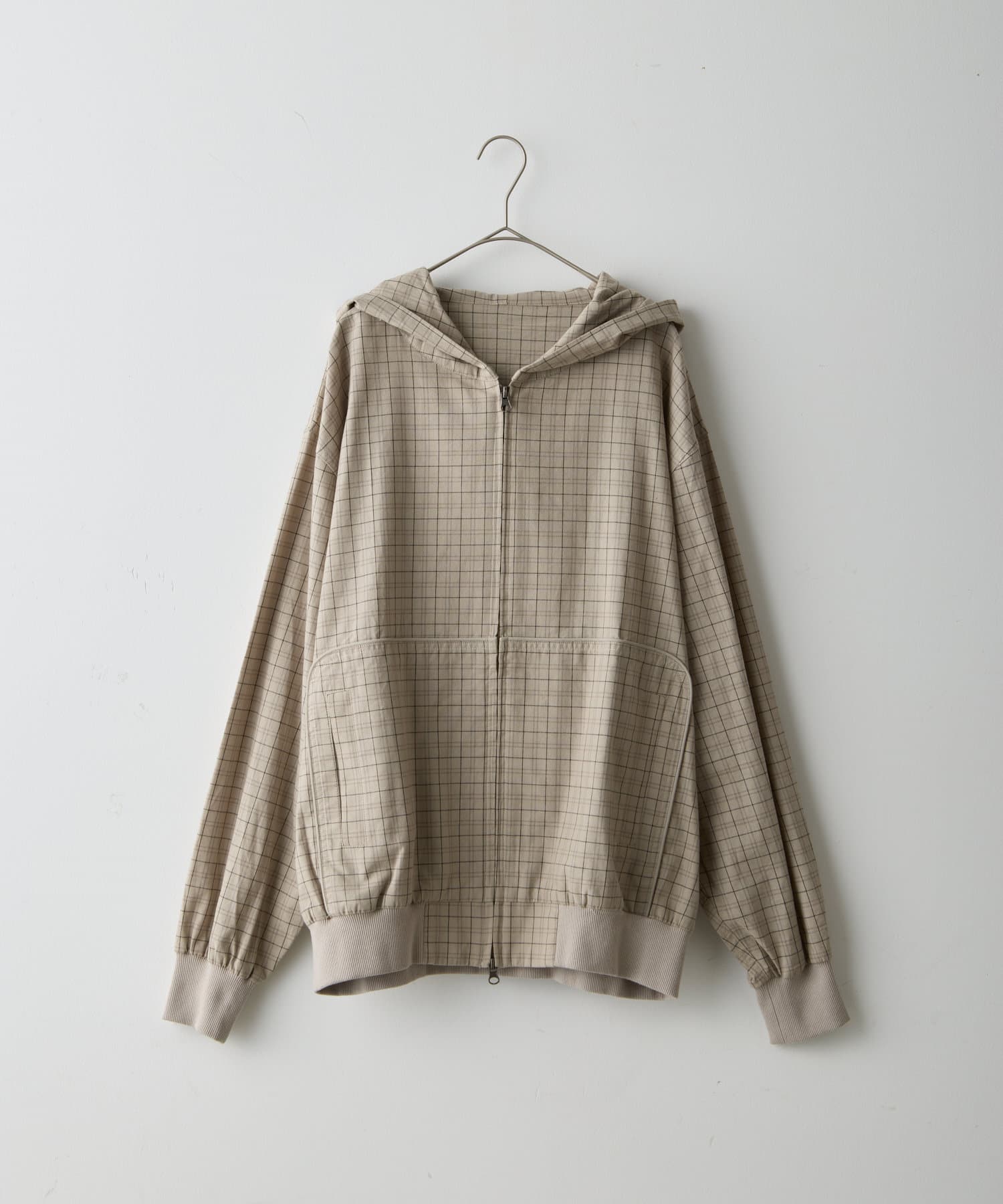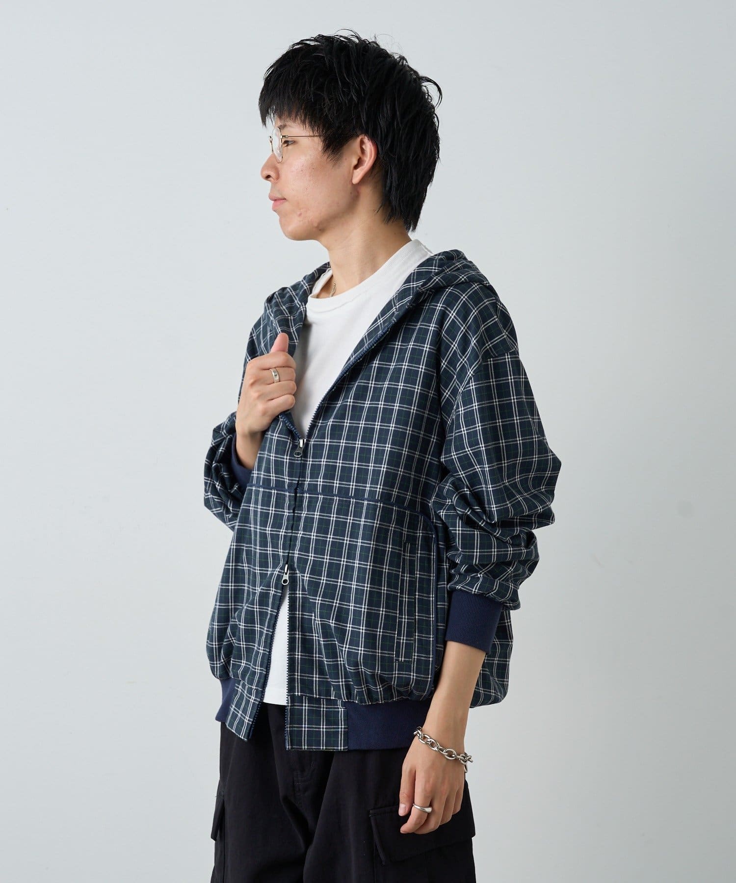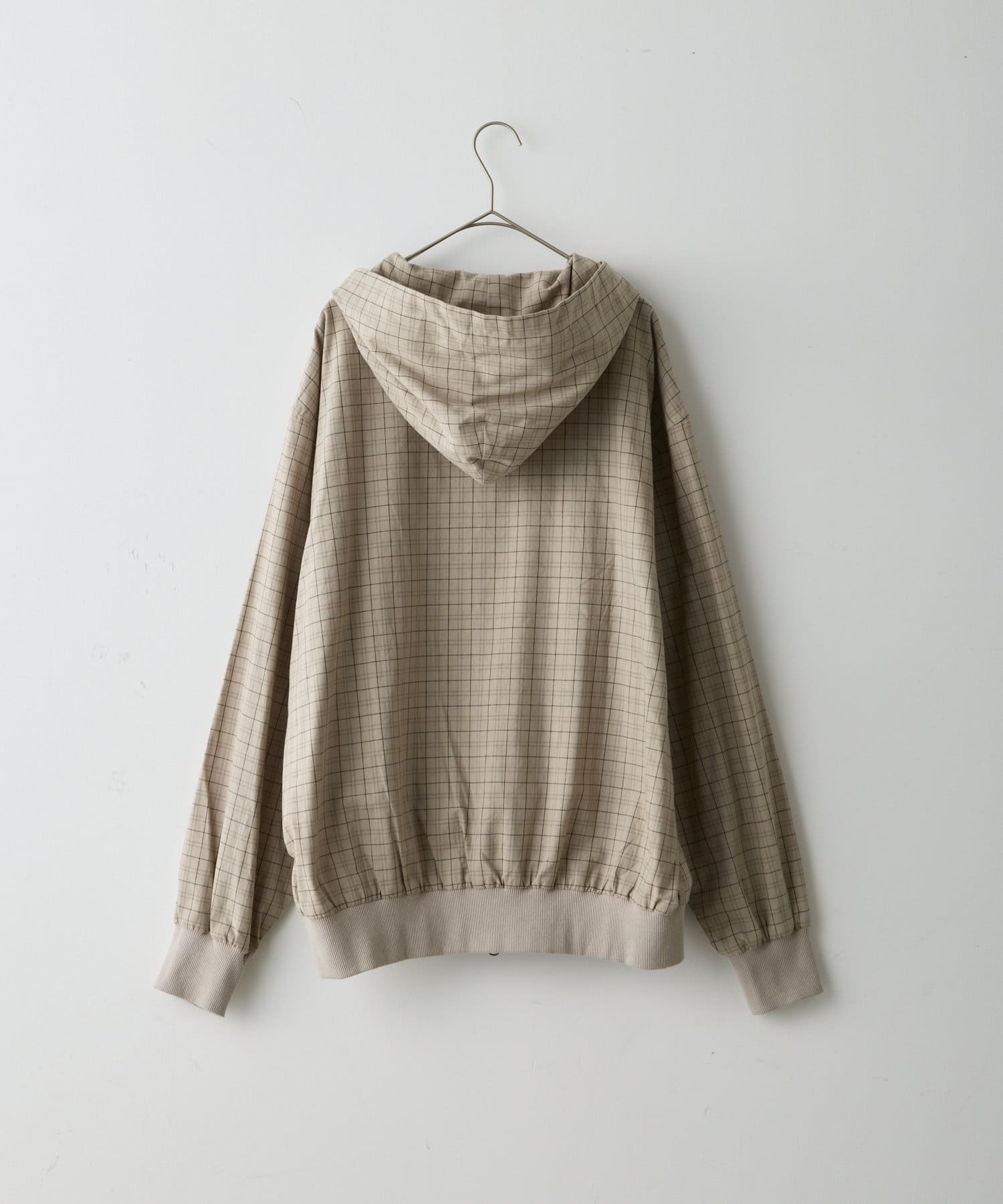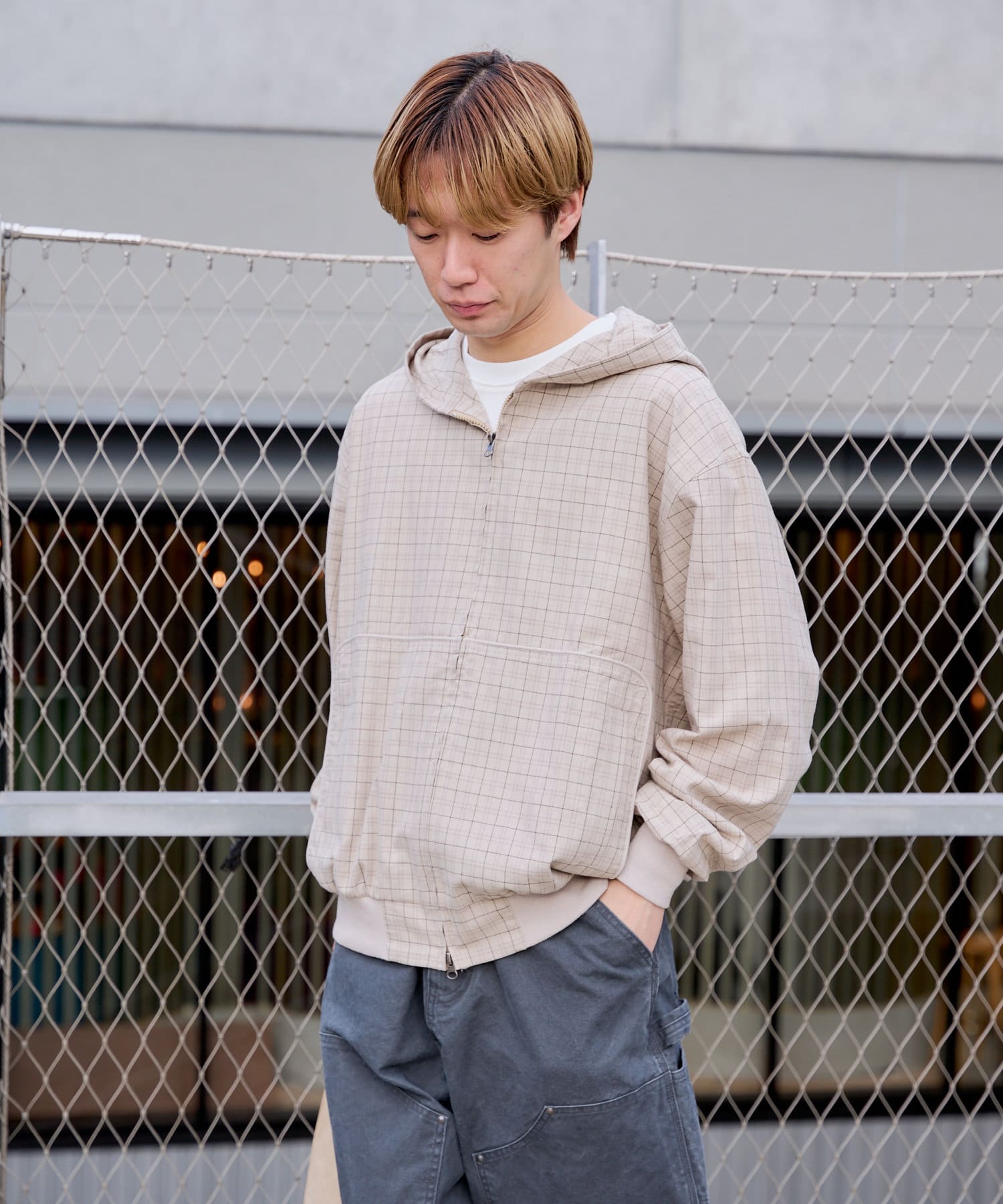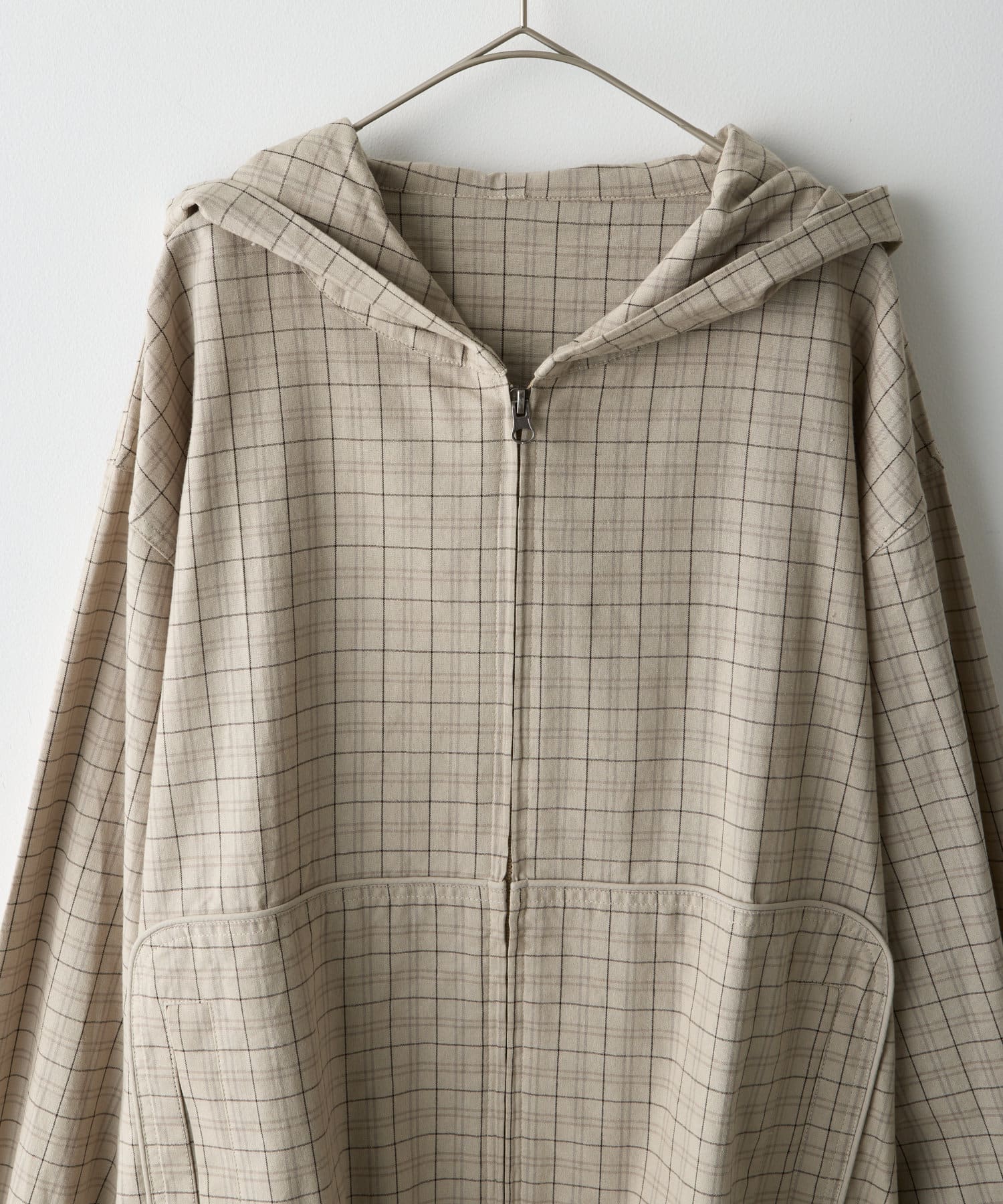 ヴィンテージのビーチパーカーをサンプルベースに、薄手のシャツ生地を使用したチェックジップフーディーシャツです。