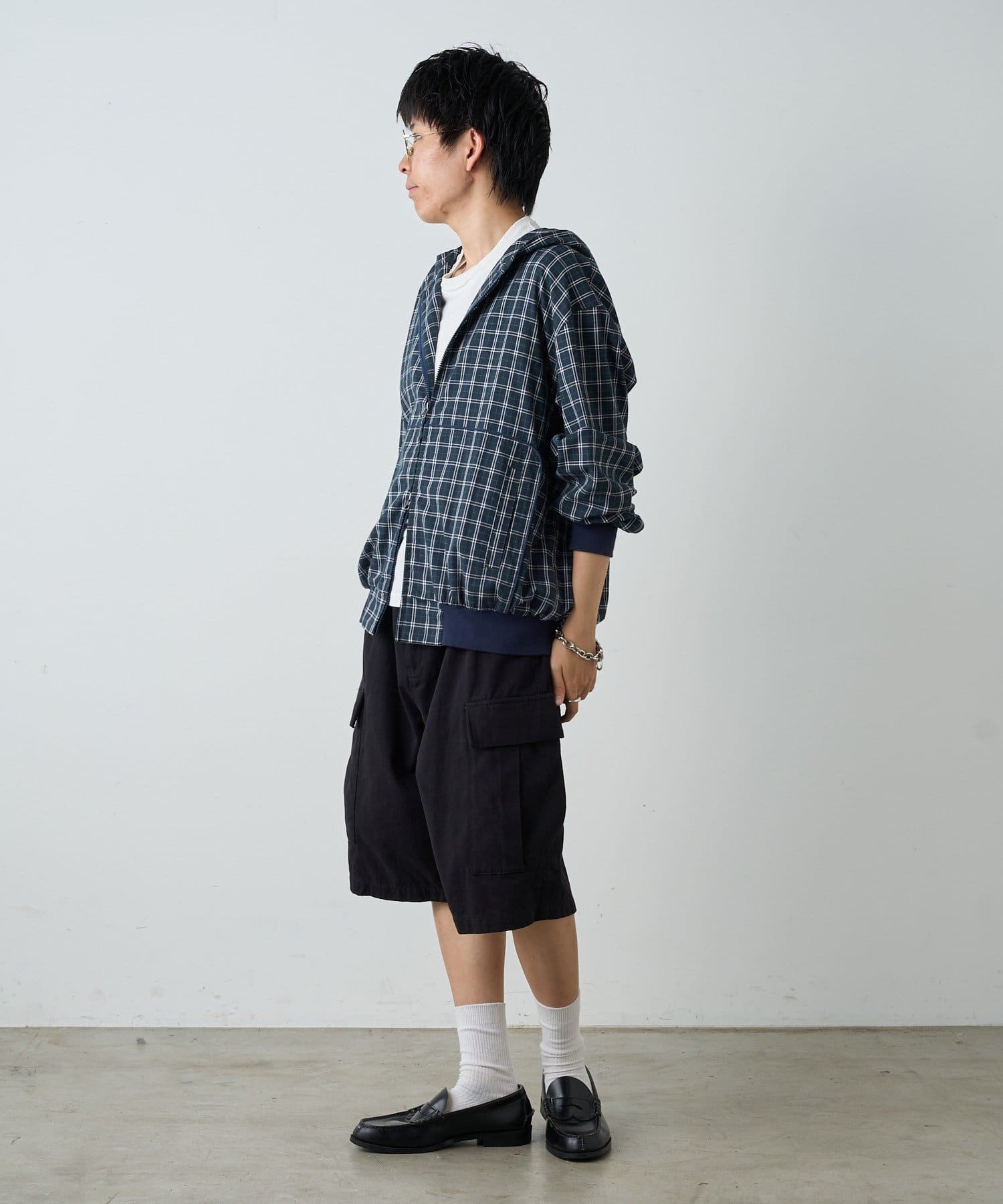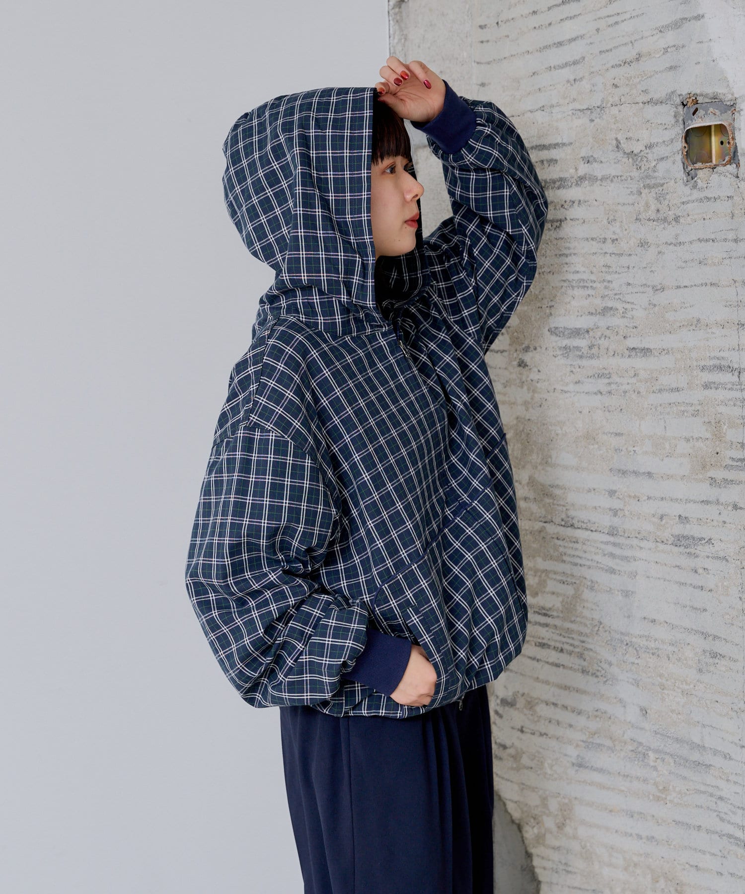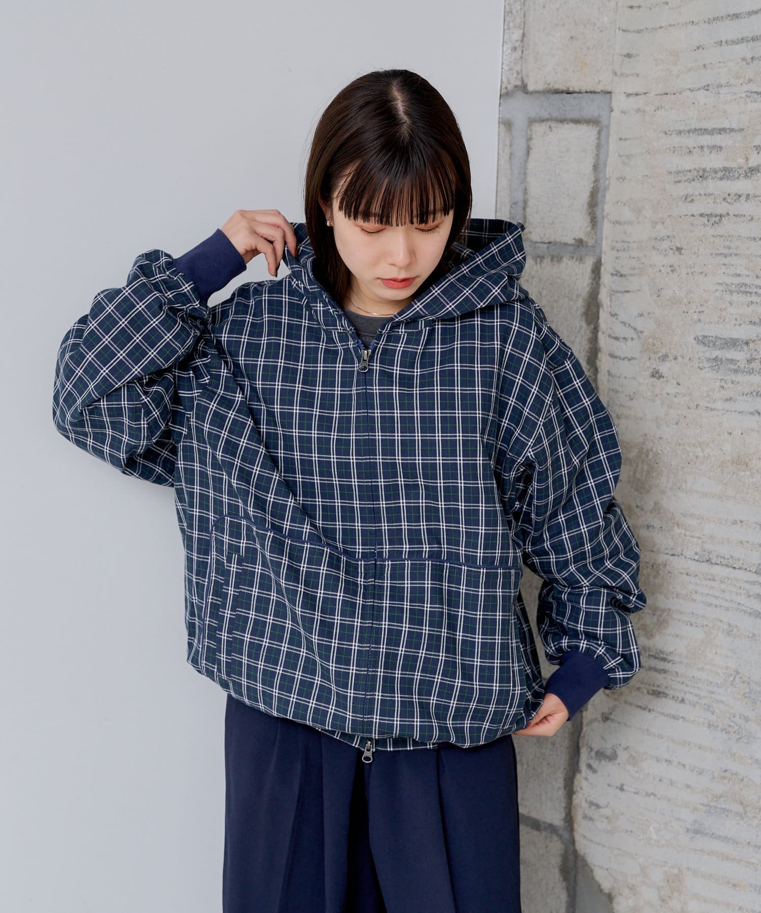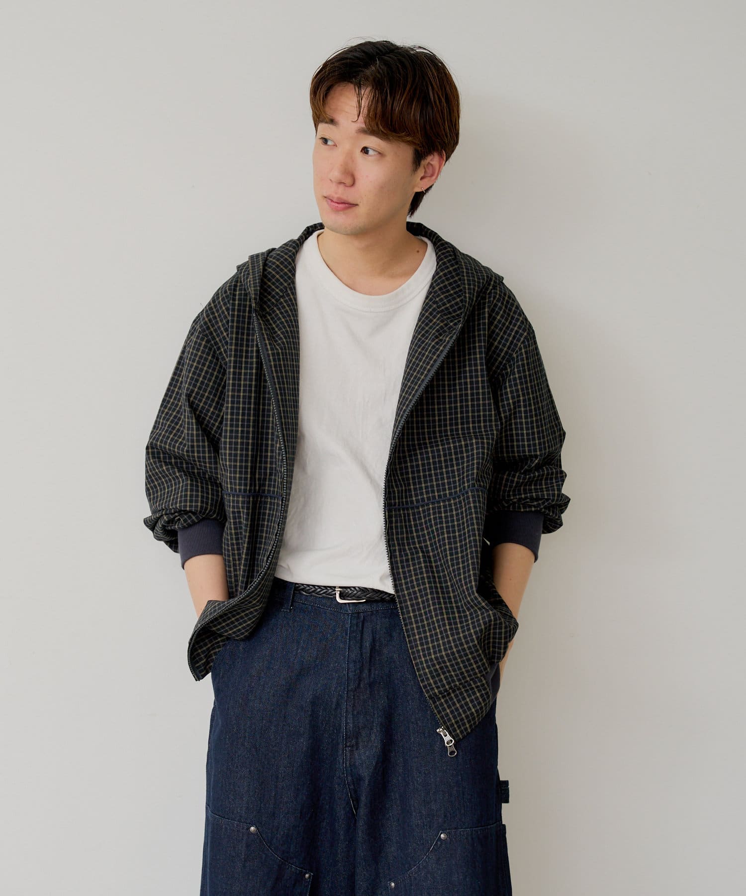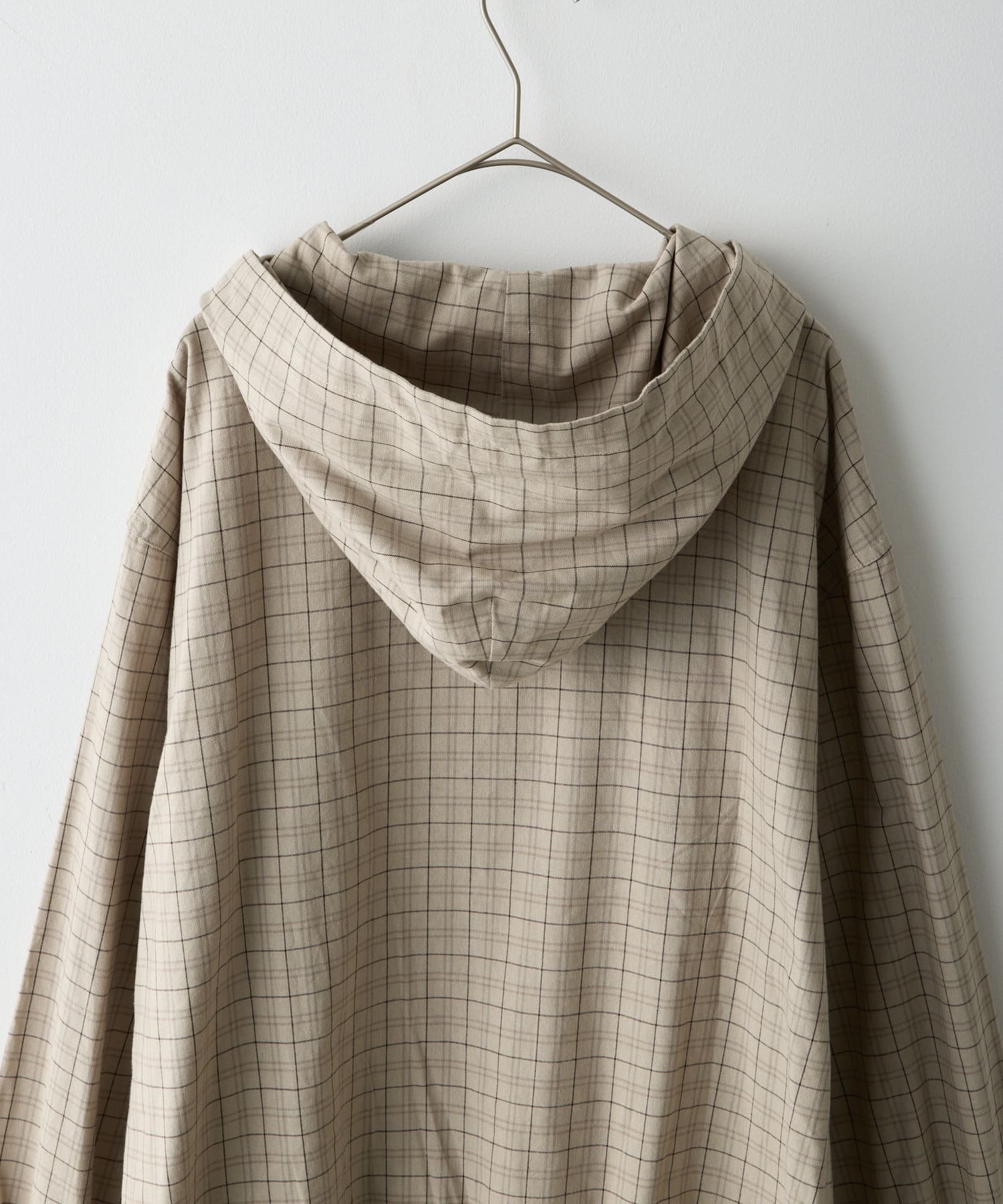 ヴィンテージのビーチパーカーをサンプルベースに、薄手のシャツ生地を使用したチェックジップフーディーシャツです。
