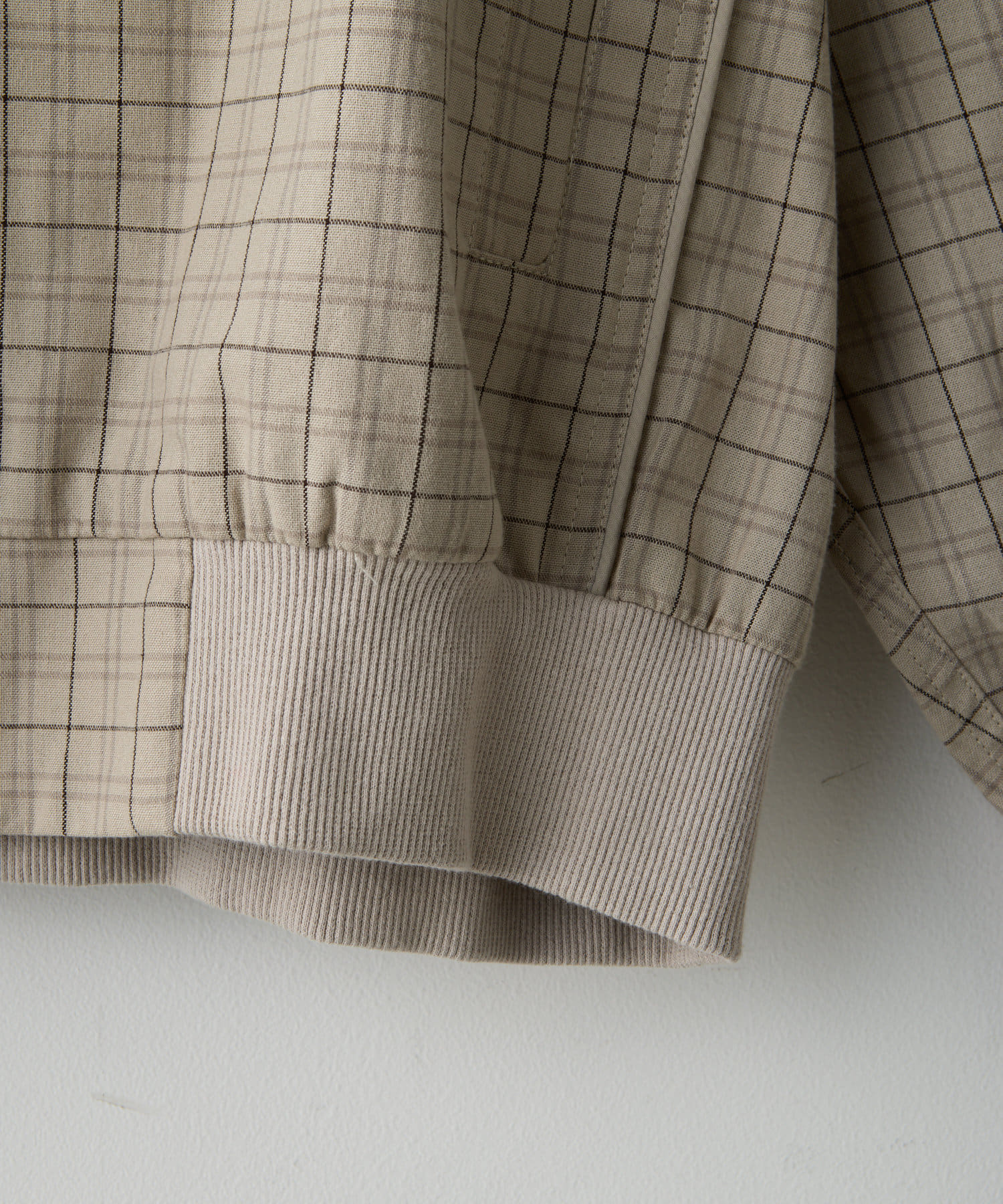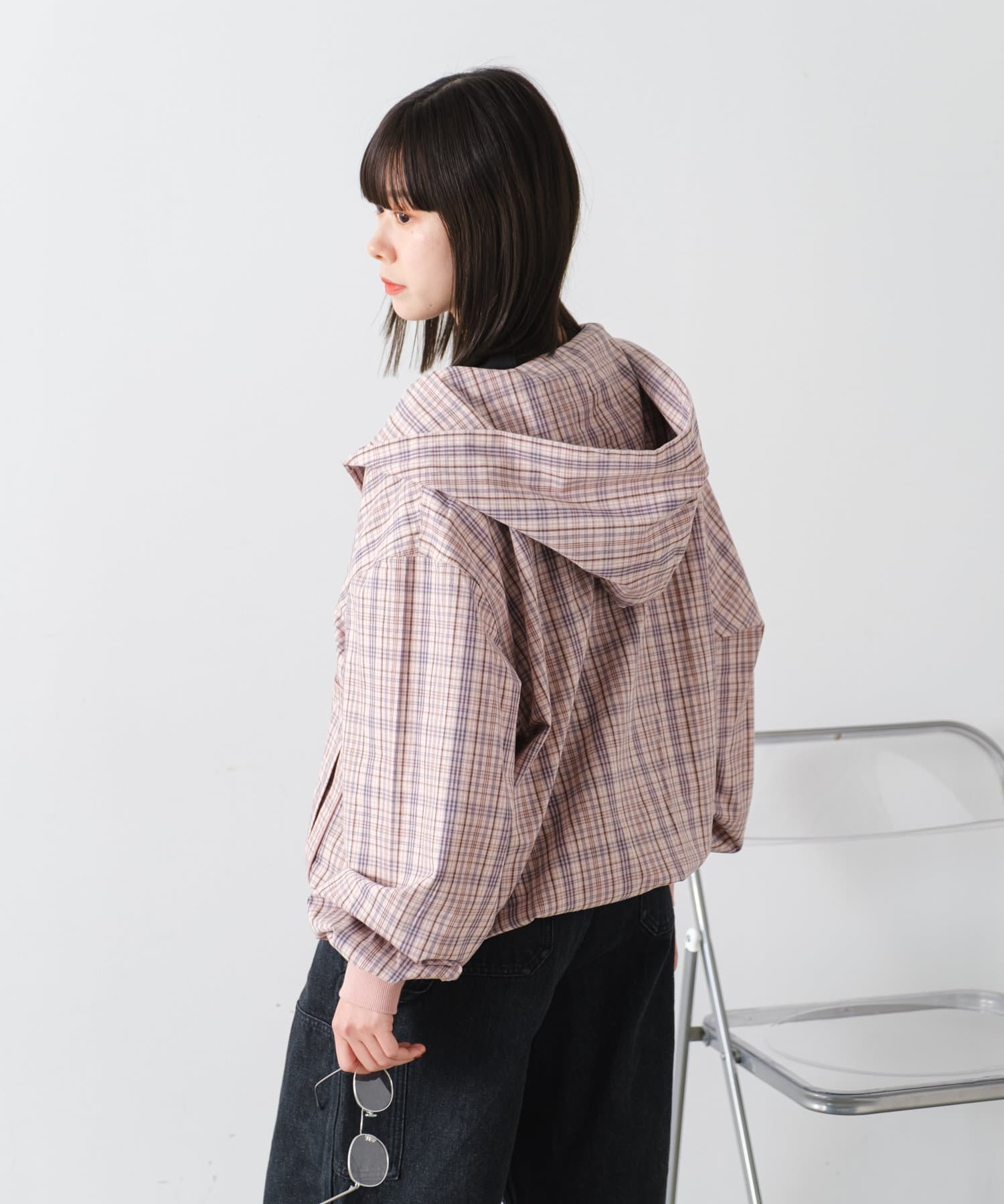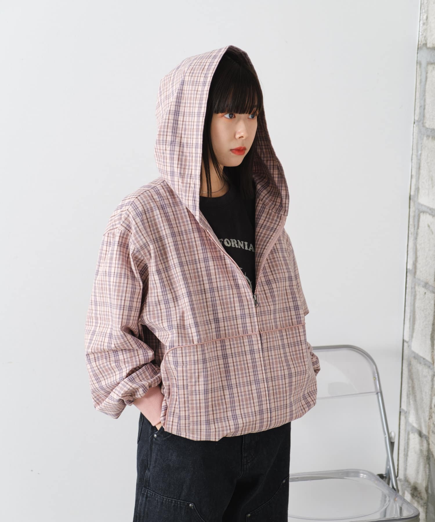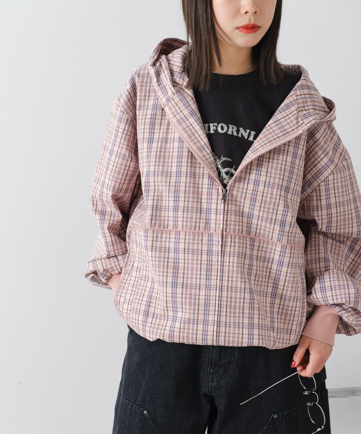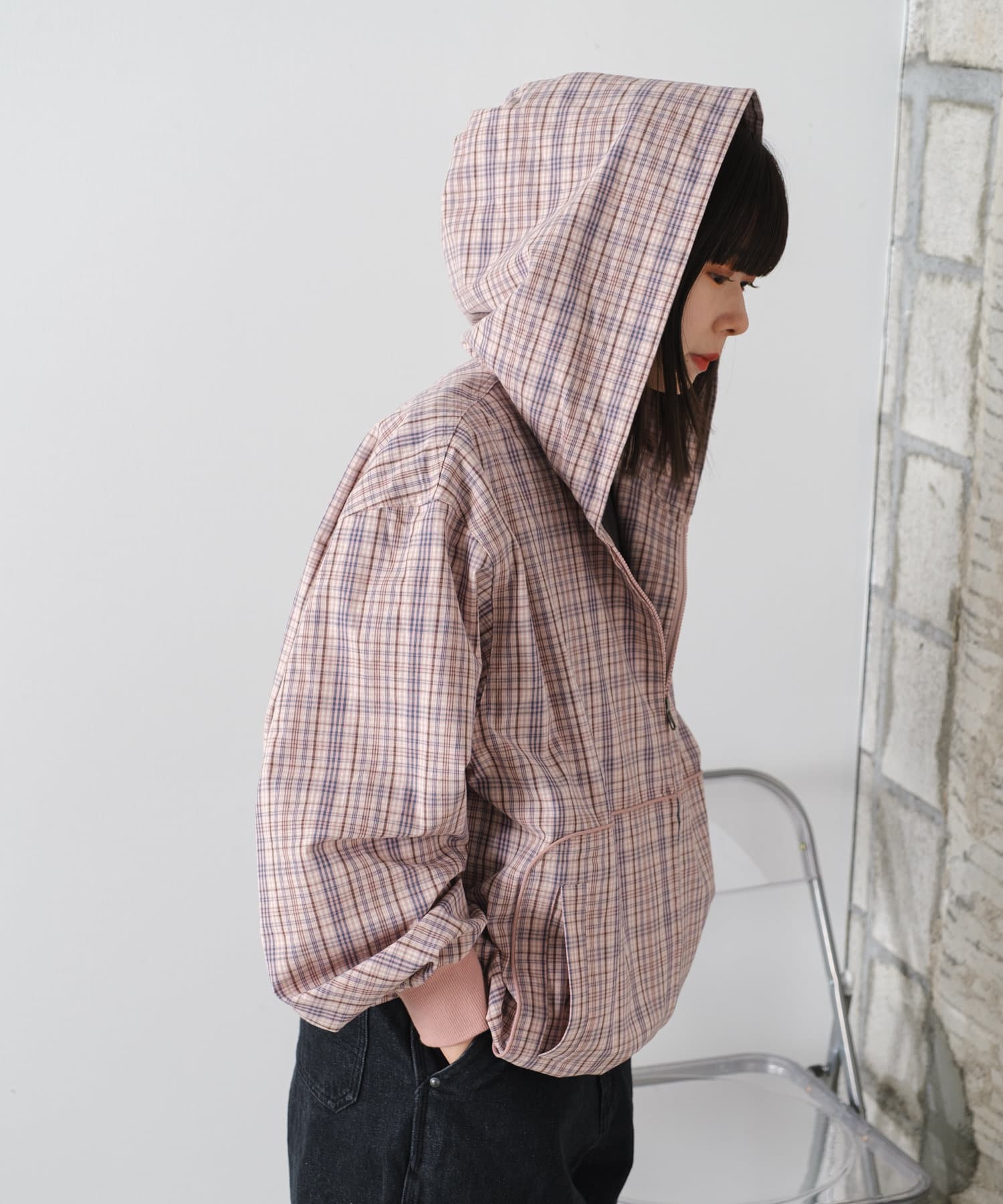 ヴィンテージのビーチパーカーをサンプルベースに、薄手のシャツ生地を使用したチェックジップフーディーシャツです。