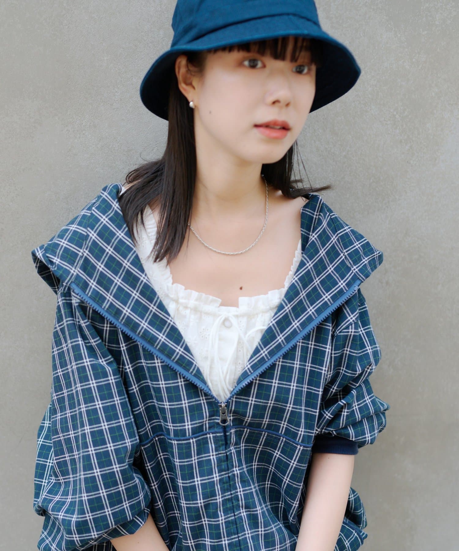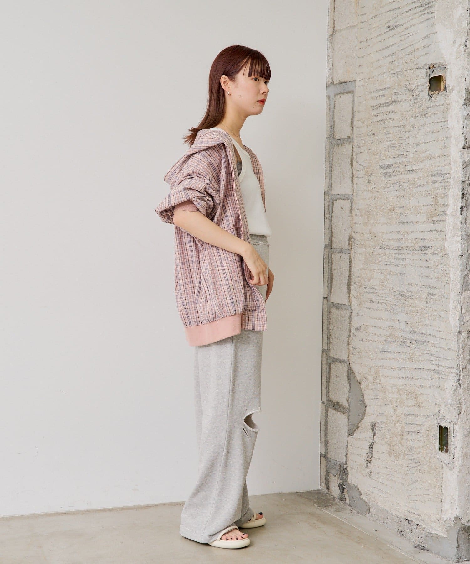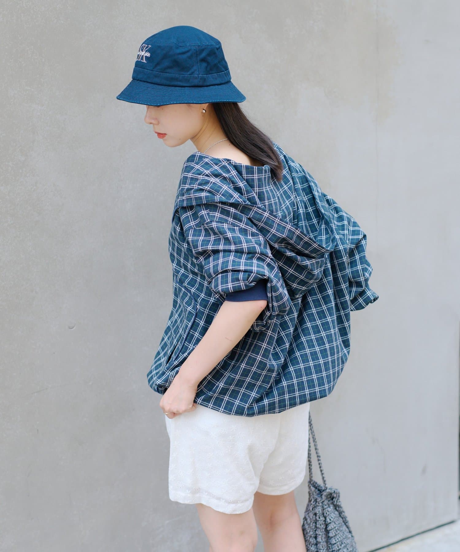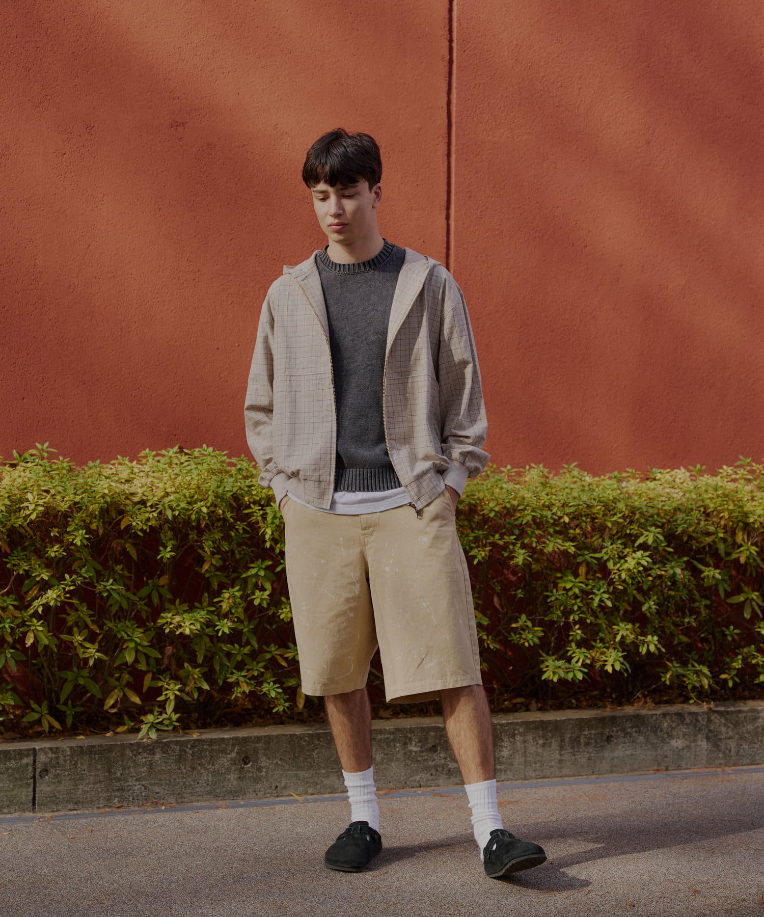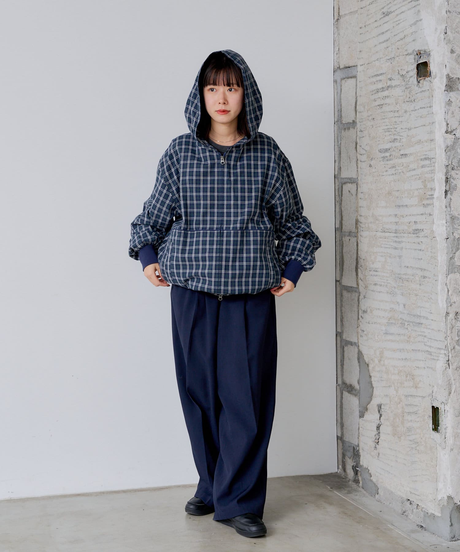 ヴィンテージのビーチパーカーをサンプルベースに、薄手のシャツ生地を使用したチェックジップフーディーシャツです。