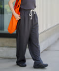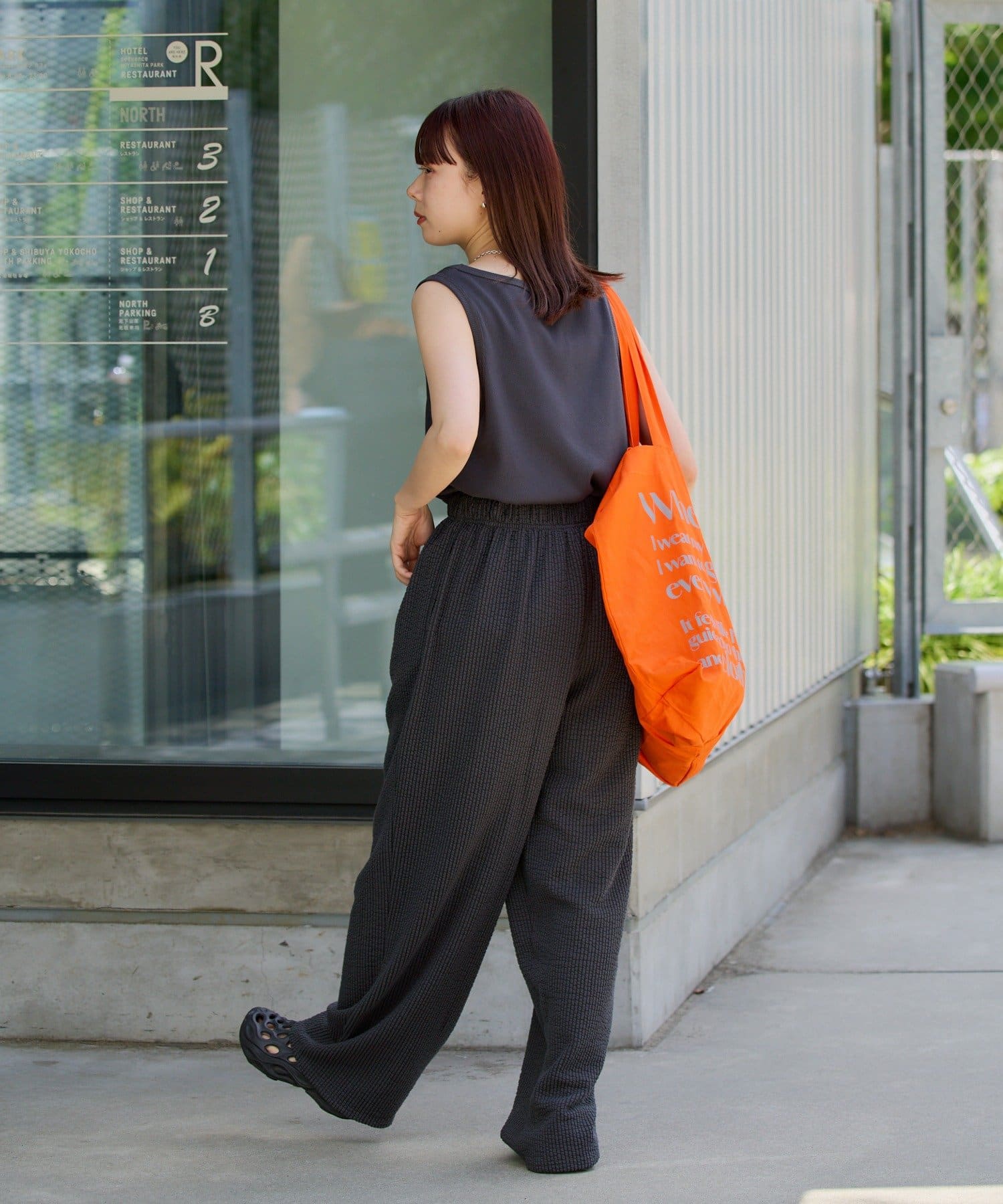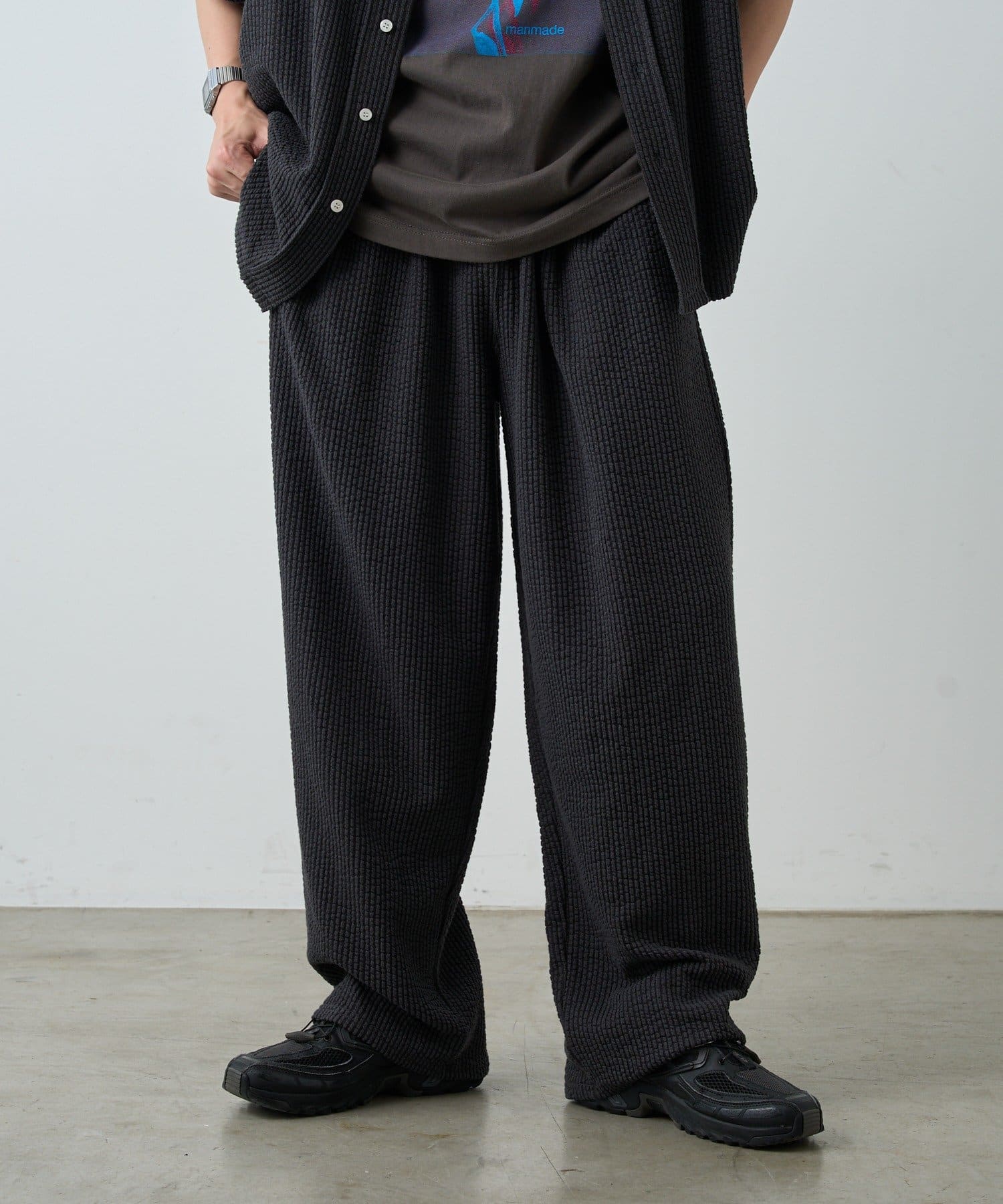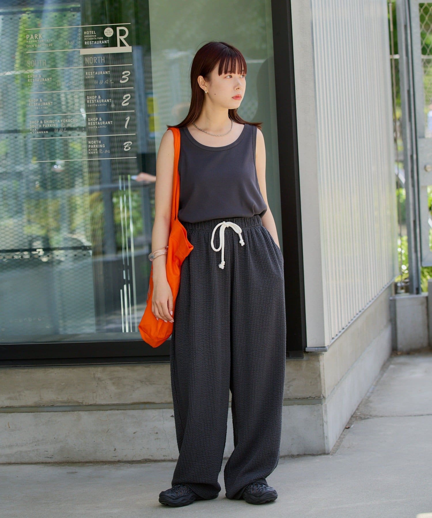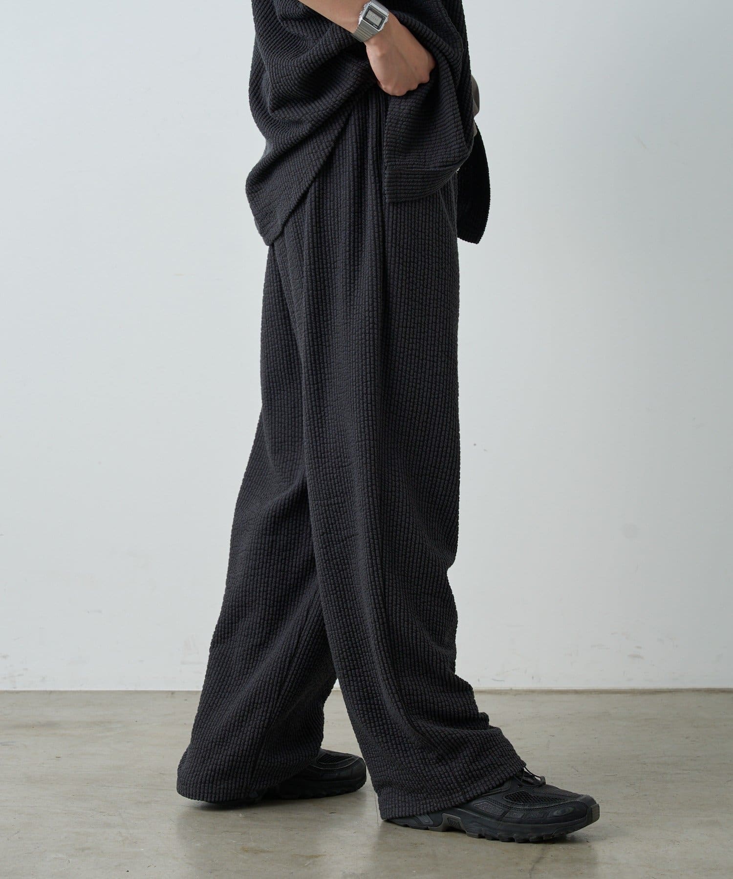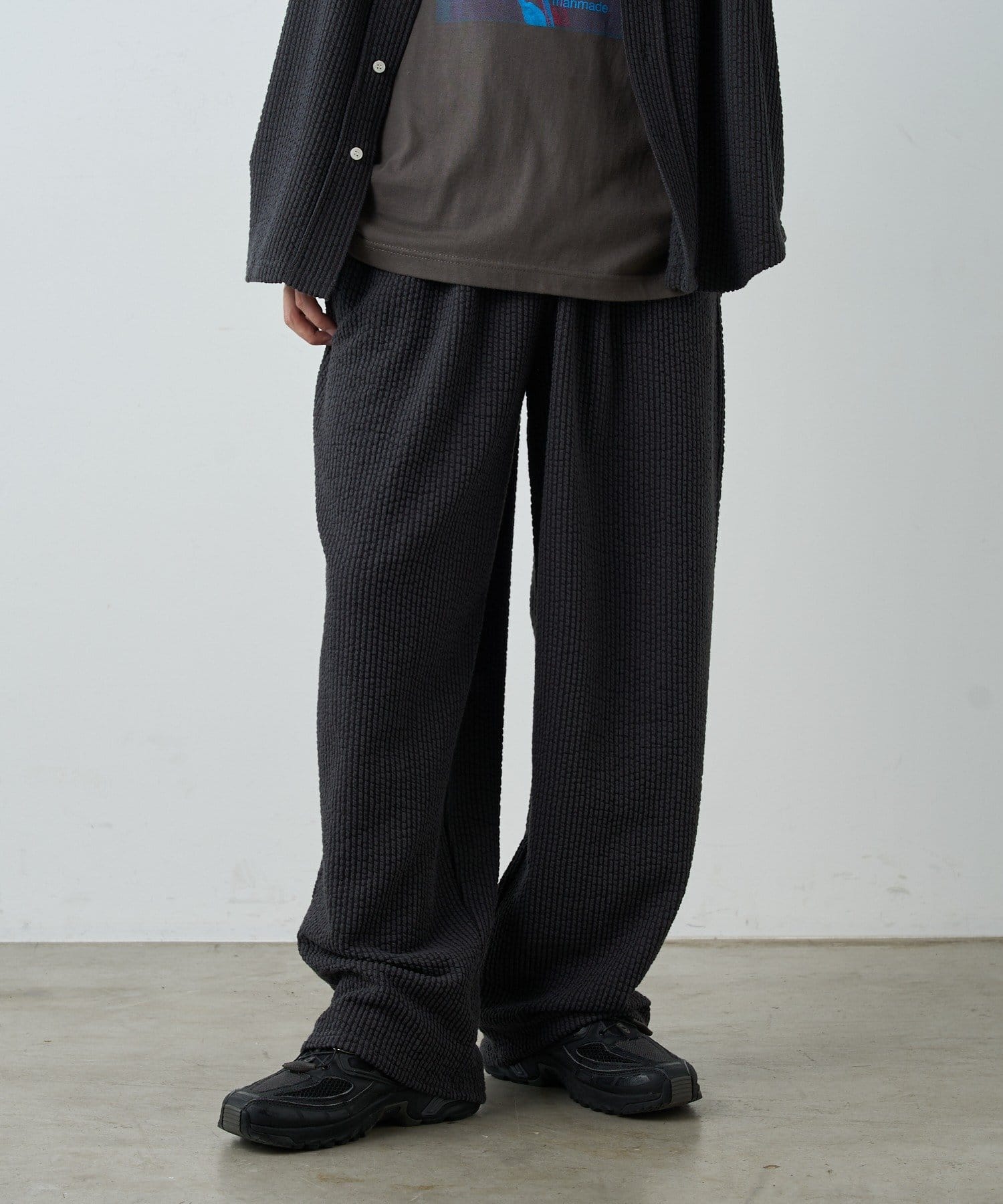 元々はパジャマやカジュアルウェアによく使用されていますが、フォーマル感のあるデザインにシアサッカーを使うことで抜け感やカジュアル感のある仕上がりに。シーンに合わせたスタイリングが楽しめるイージーパンツです。