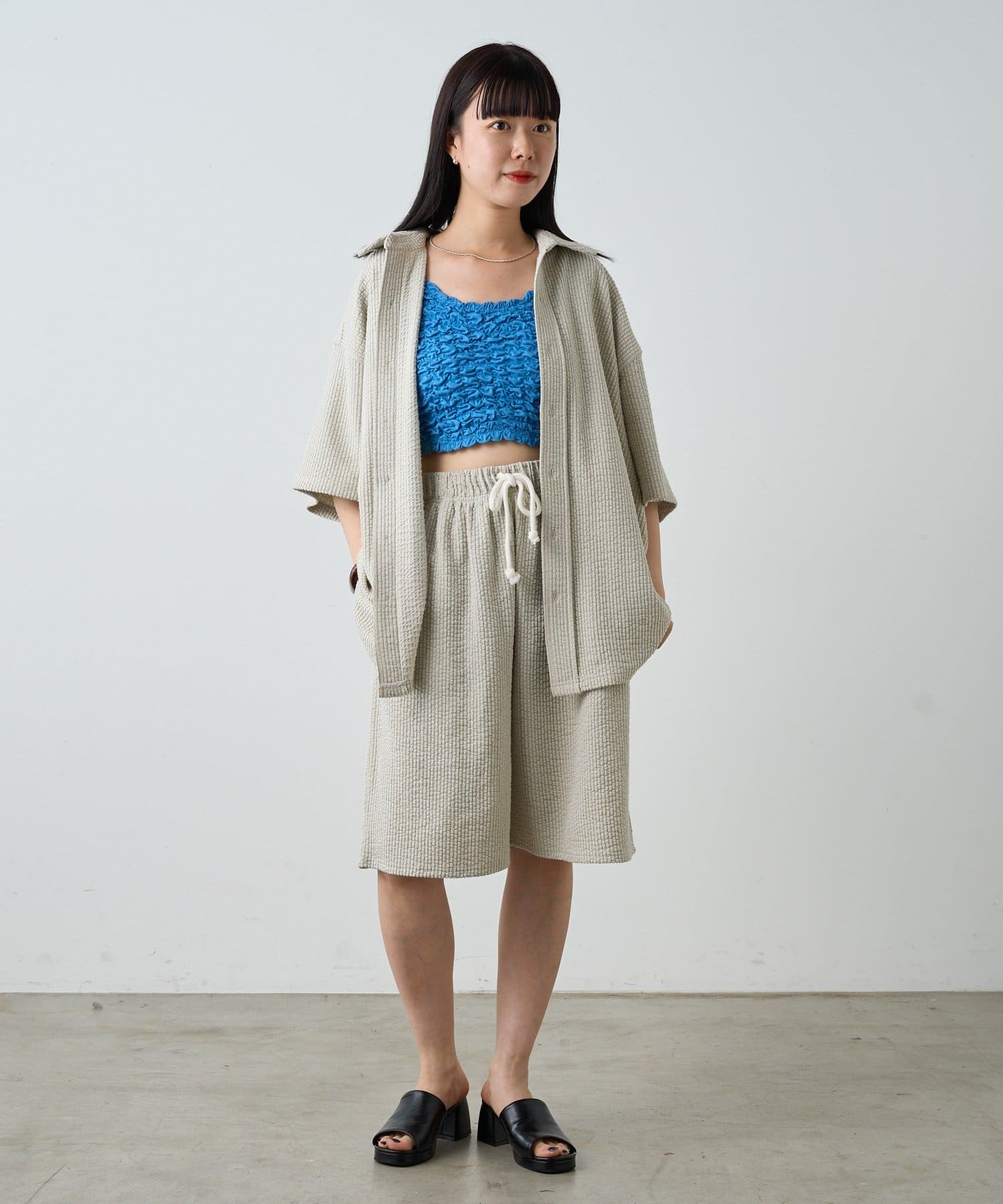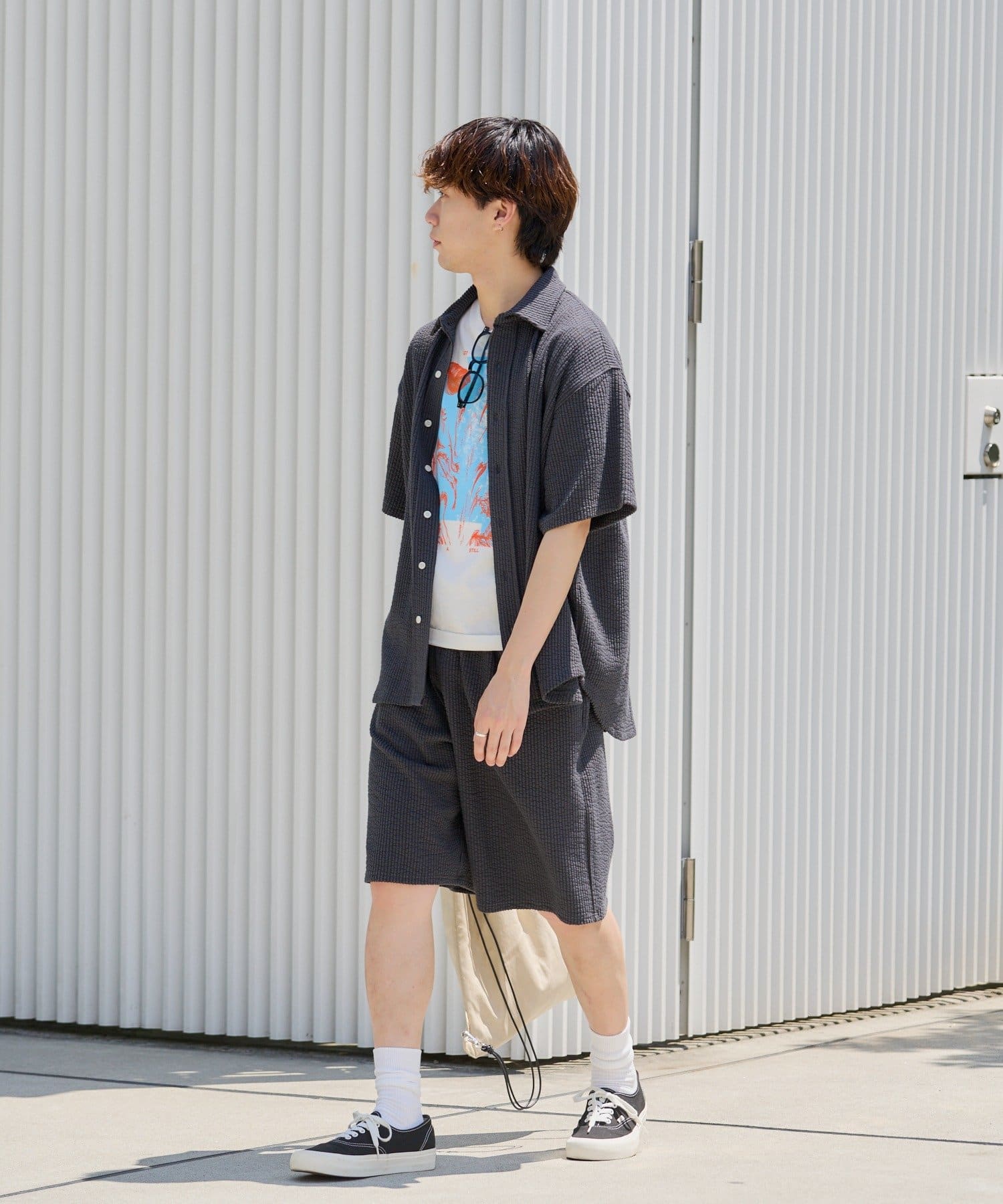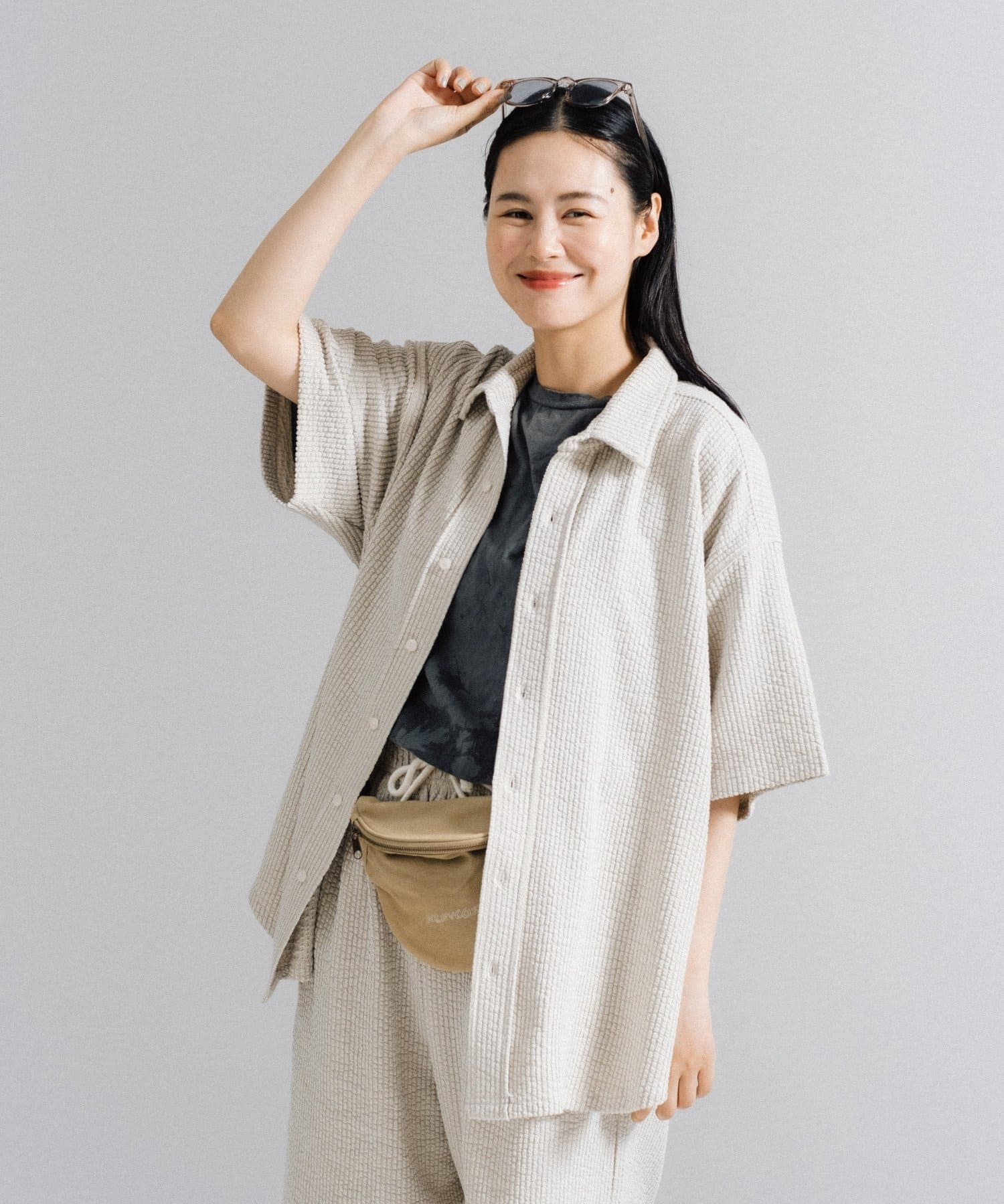 同生地を使用したストレッチシアサッカーイージーパンツ、ストレッチシアサッカーイージーショーツも用意しているのでセットアップとしてのコーディネイトもオススメです。