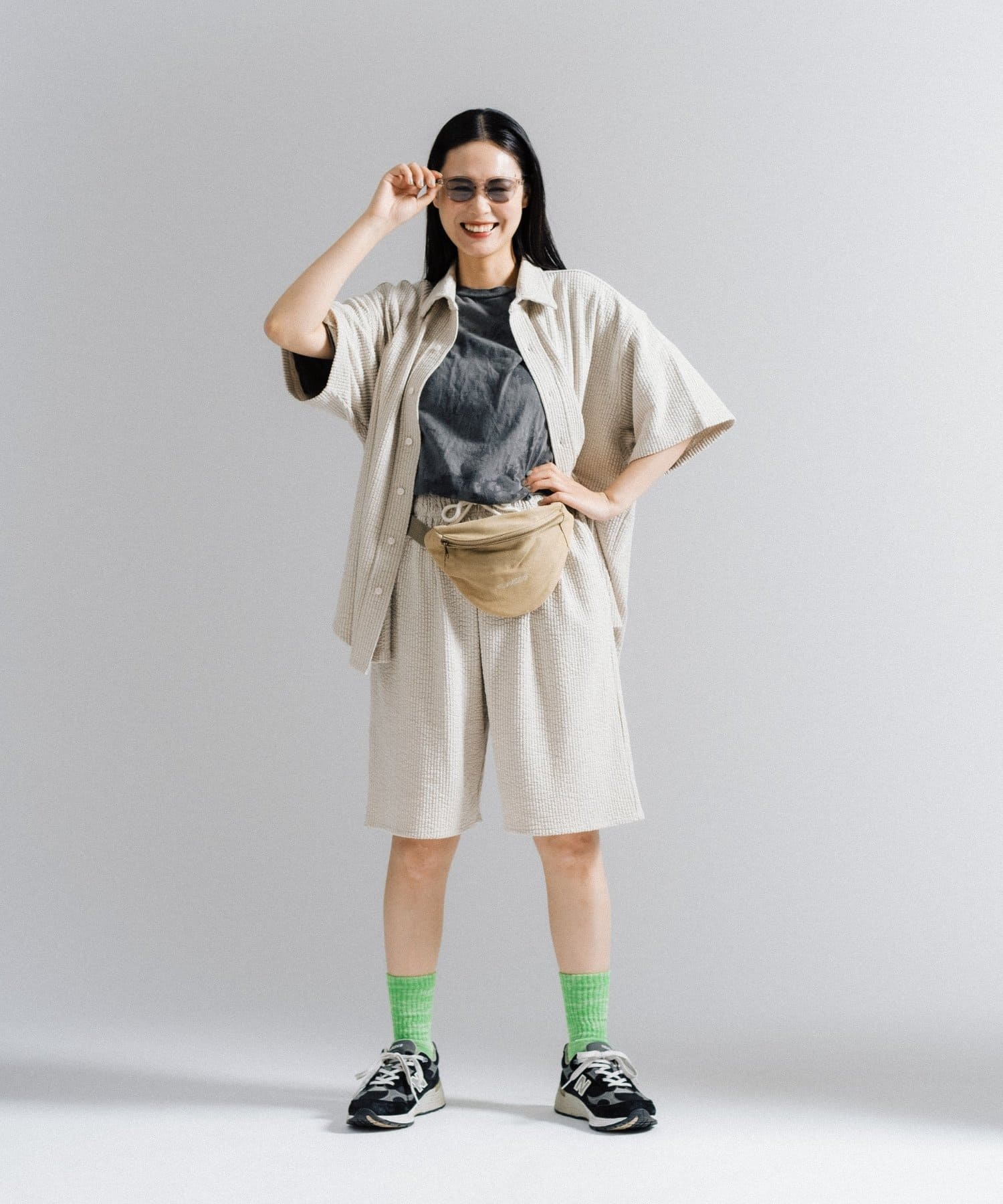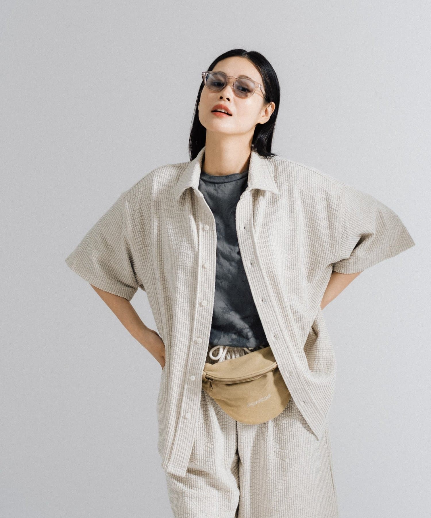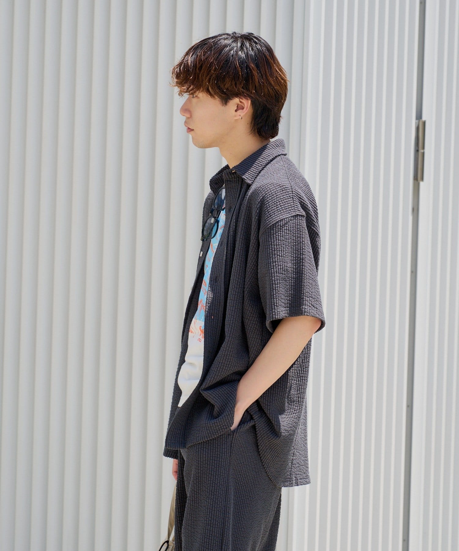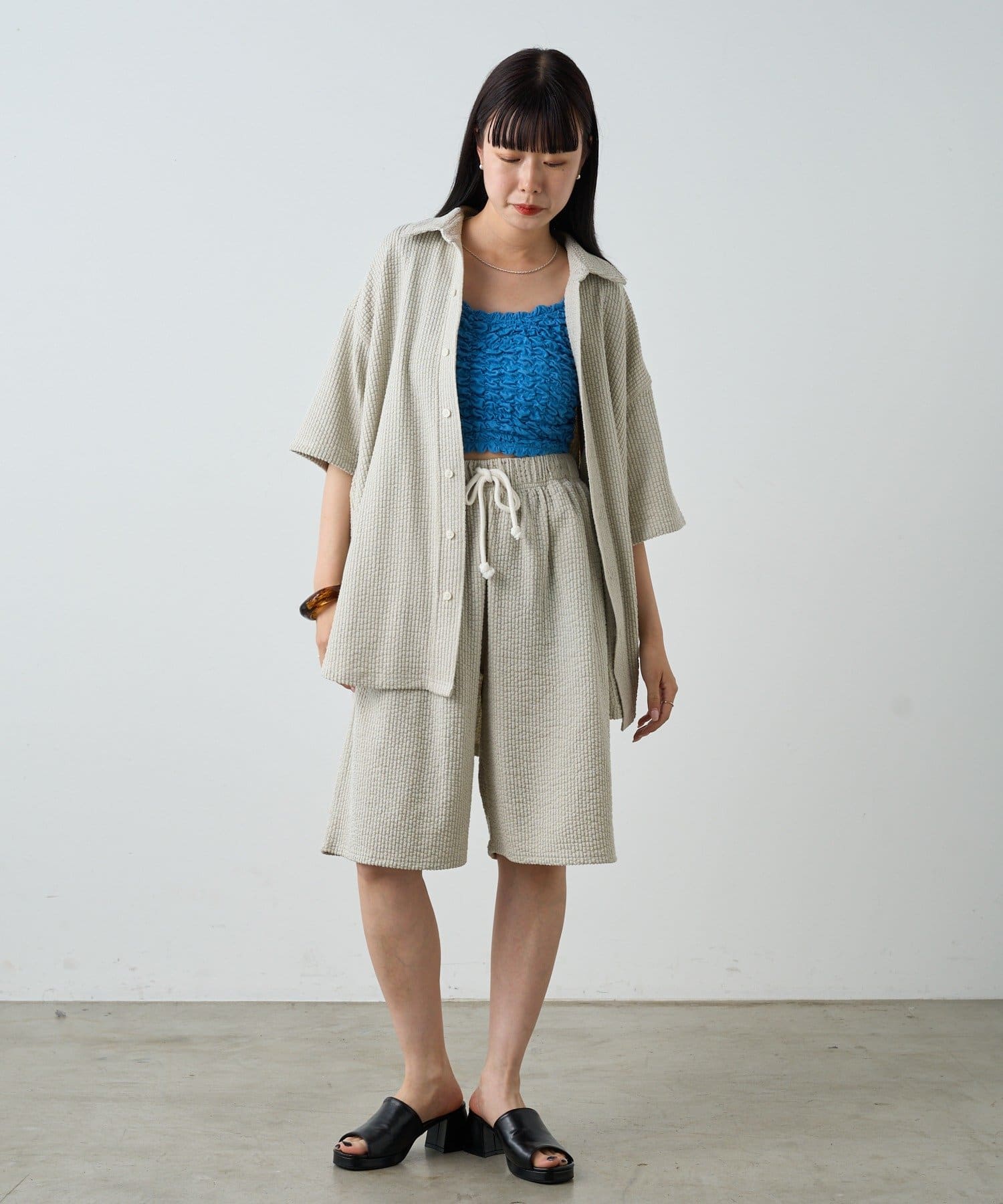 同生地を使用したストレッチシアサッカーイージーパンツ、ストレッチシアサッカーイージーショーツも用意しているのでセットアップとしてのコーディネイトもオススメです。