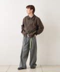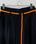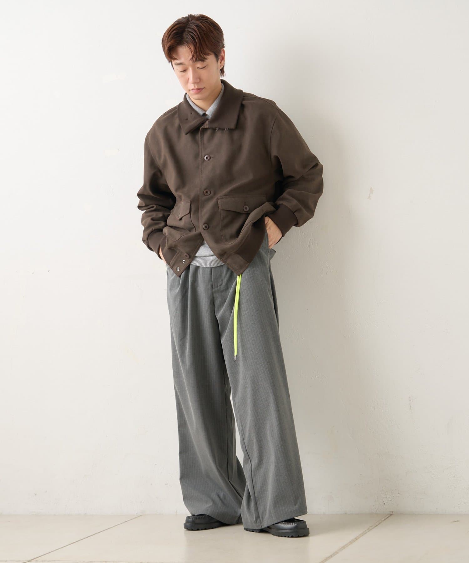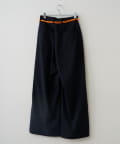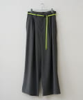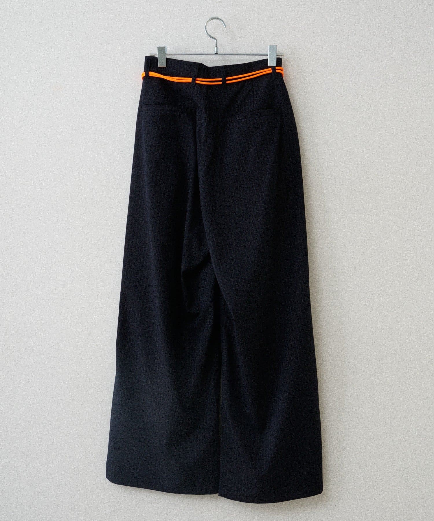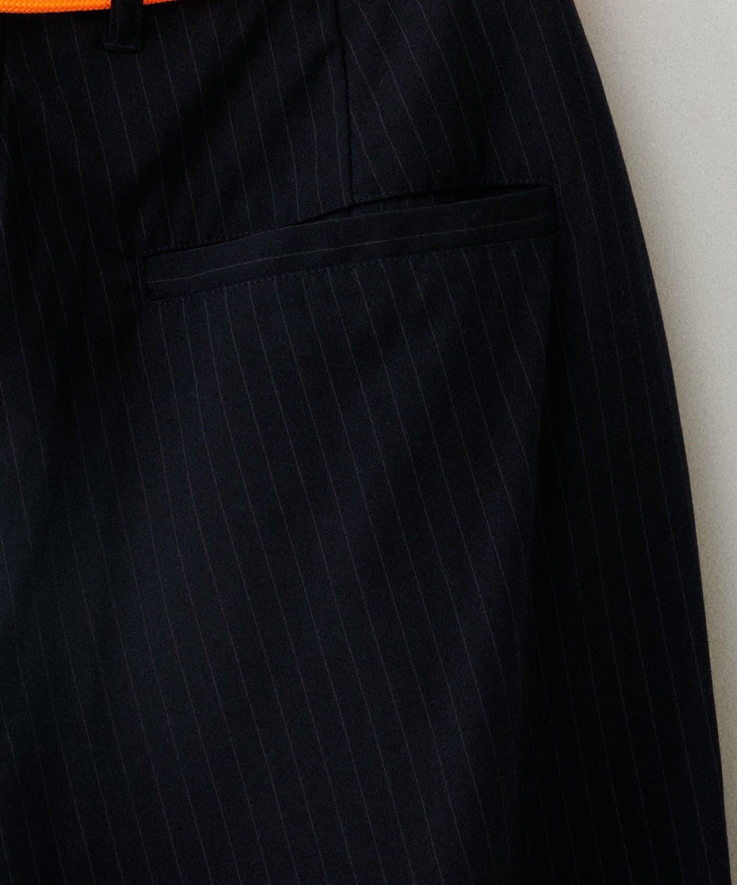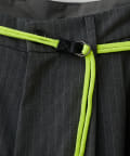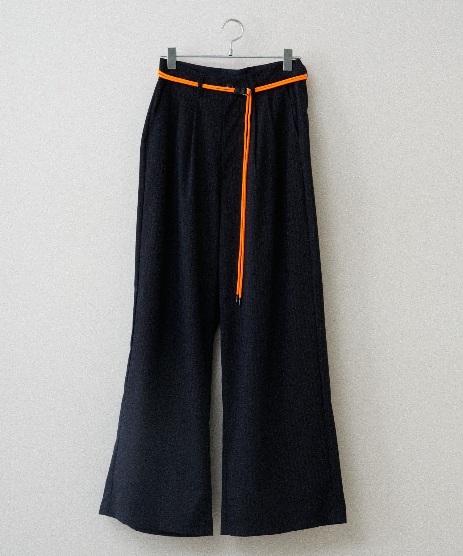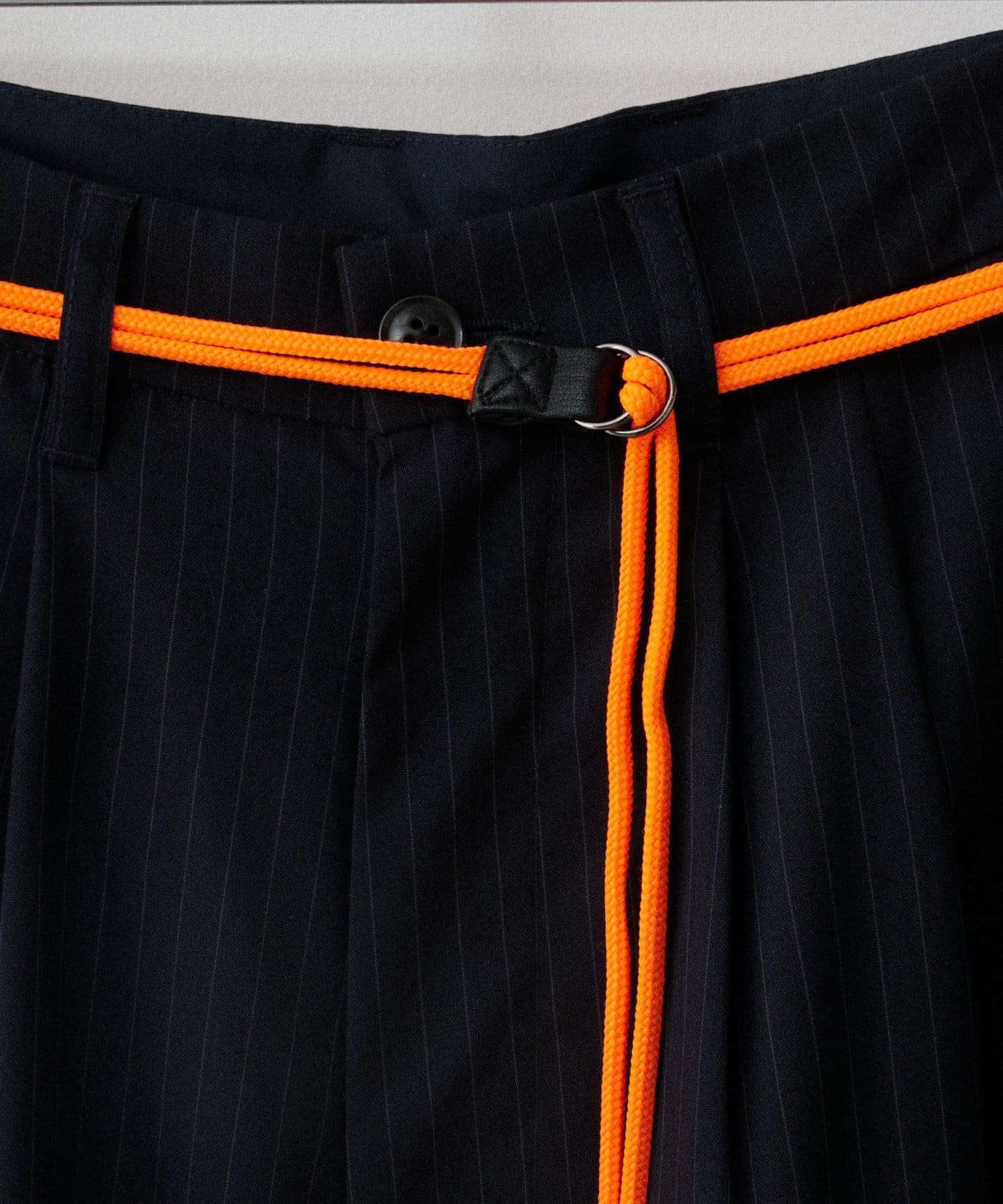 クラシックなピンストライプにストリート要素が漂うネオンカラーのコード紐を組み合わせたワイドスラックス。