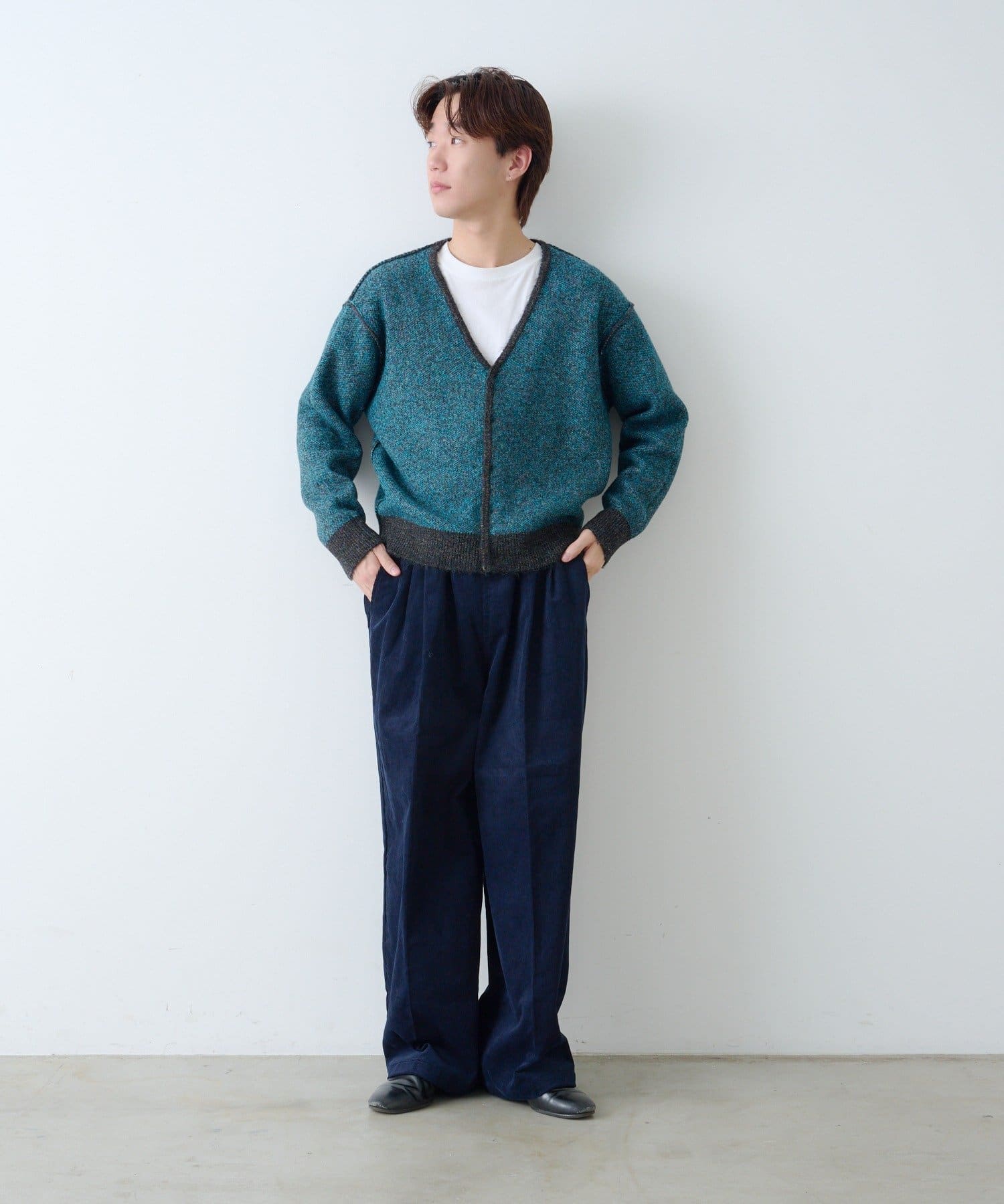 製品仕上げで表側に起毛加工を行っており品のある見た目とウォーム感を出しています。