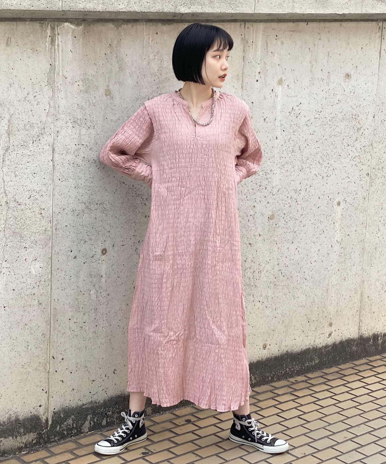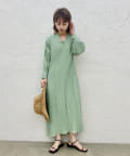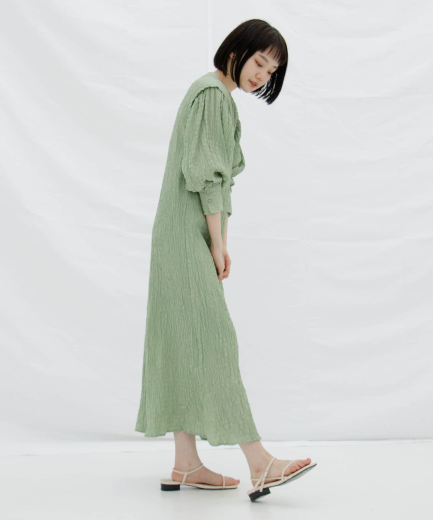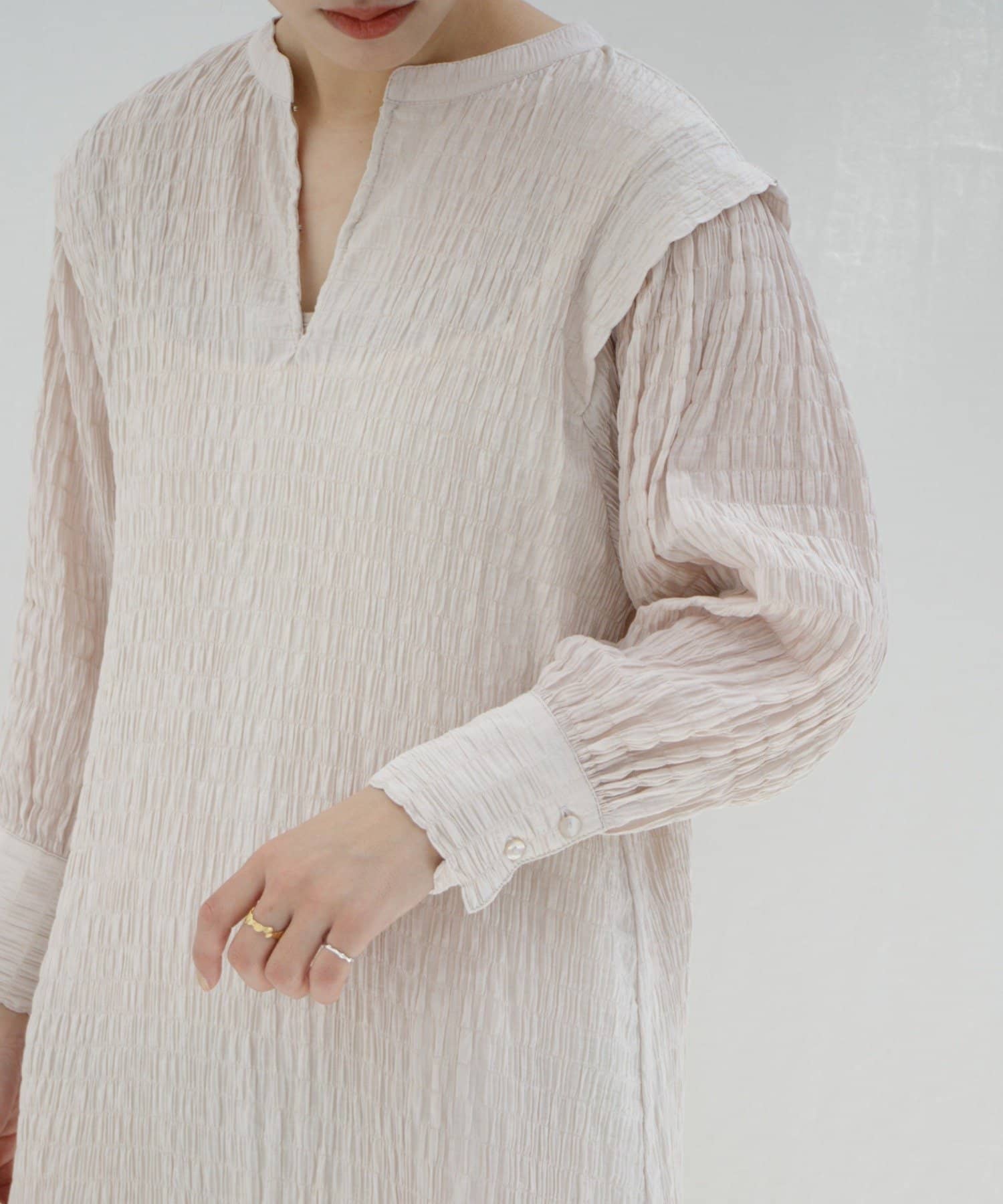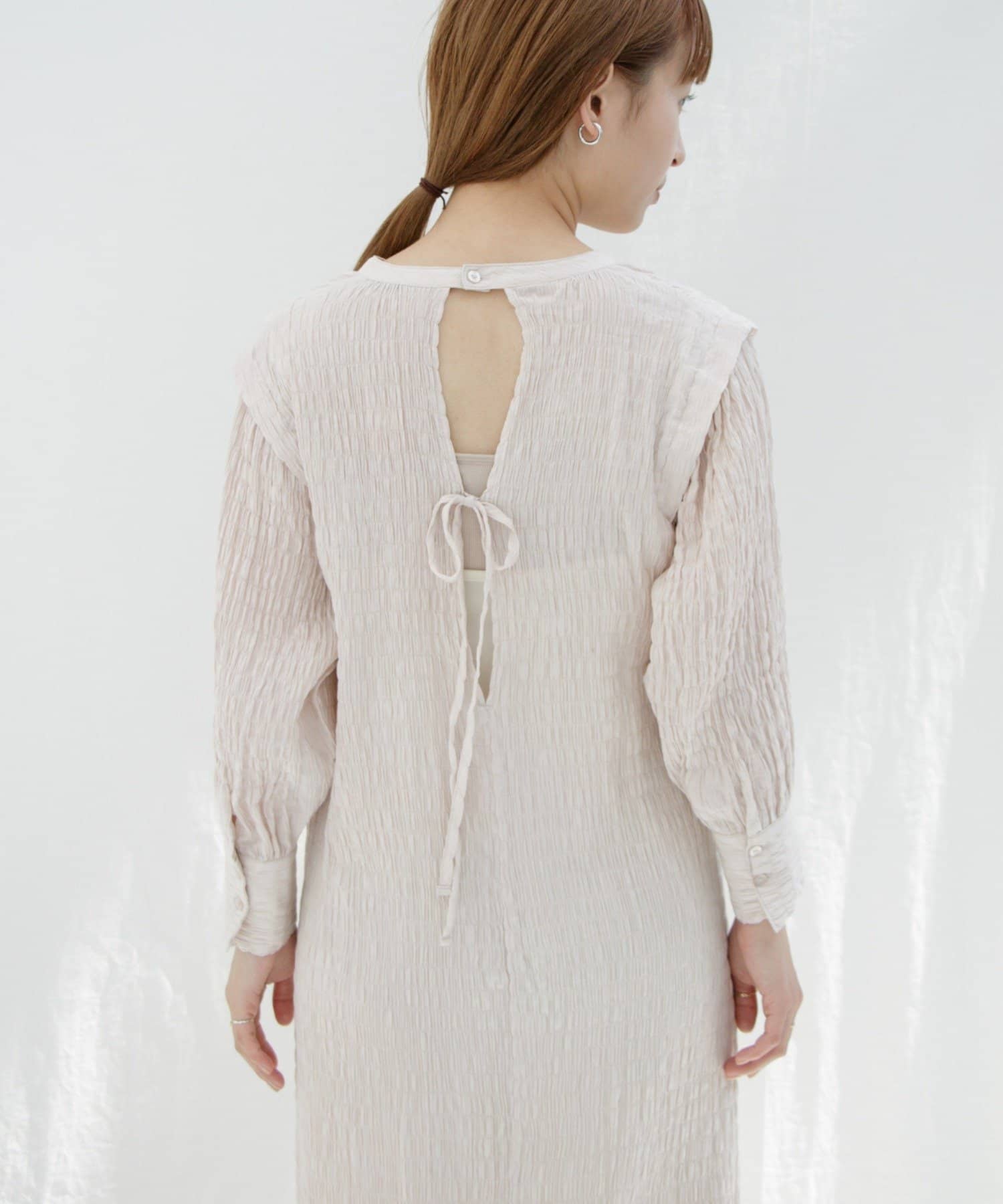 シャーリングの素材感と透け感が春夏にうってつけのワンピース。