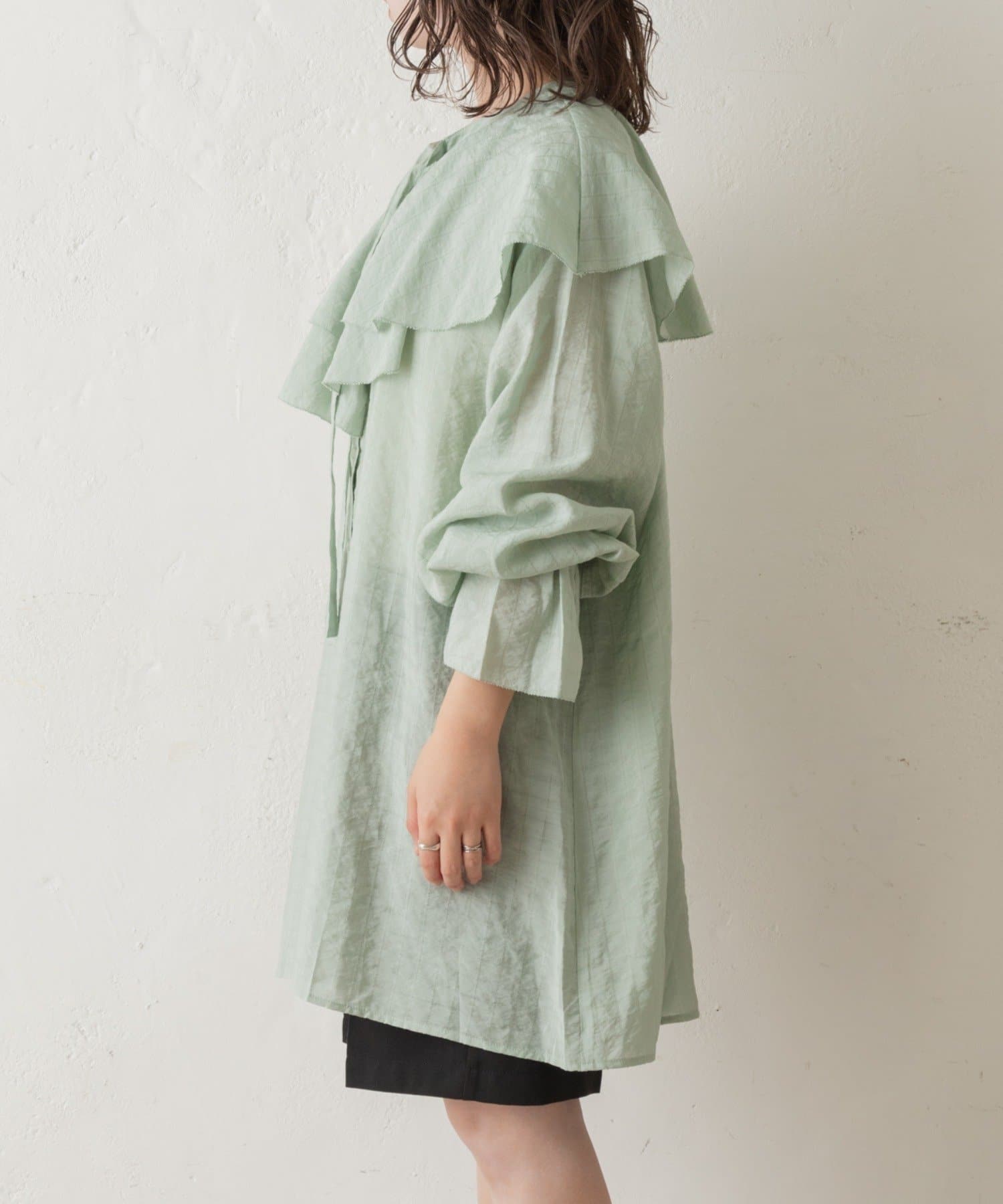 襟のフリルが大きくて可愛いなと袖も可愛いです!インナーに色物を合わせてきたいです!