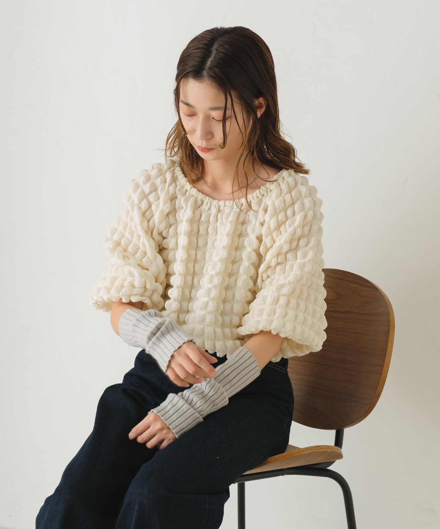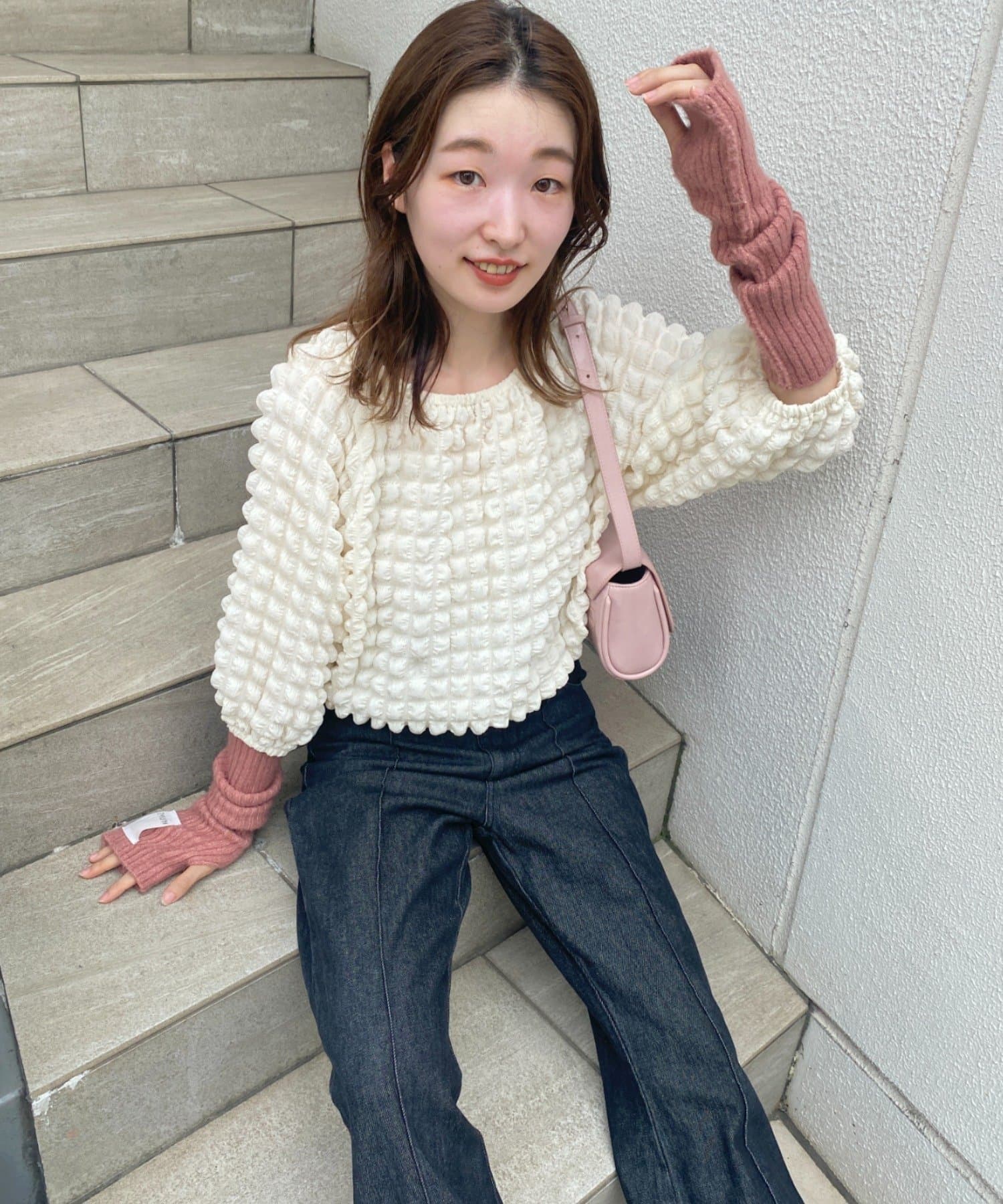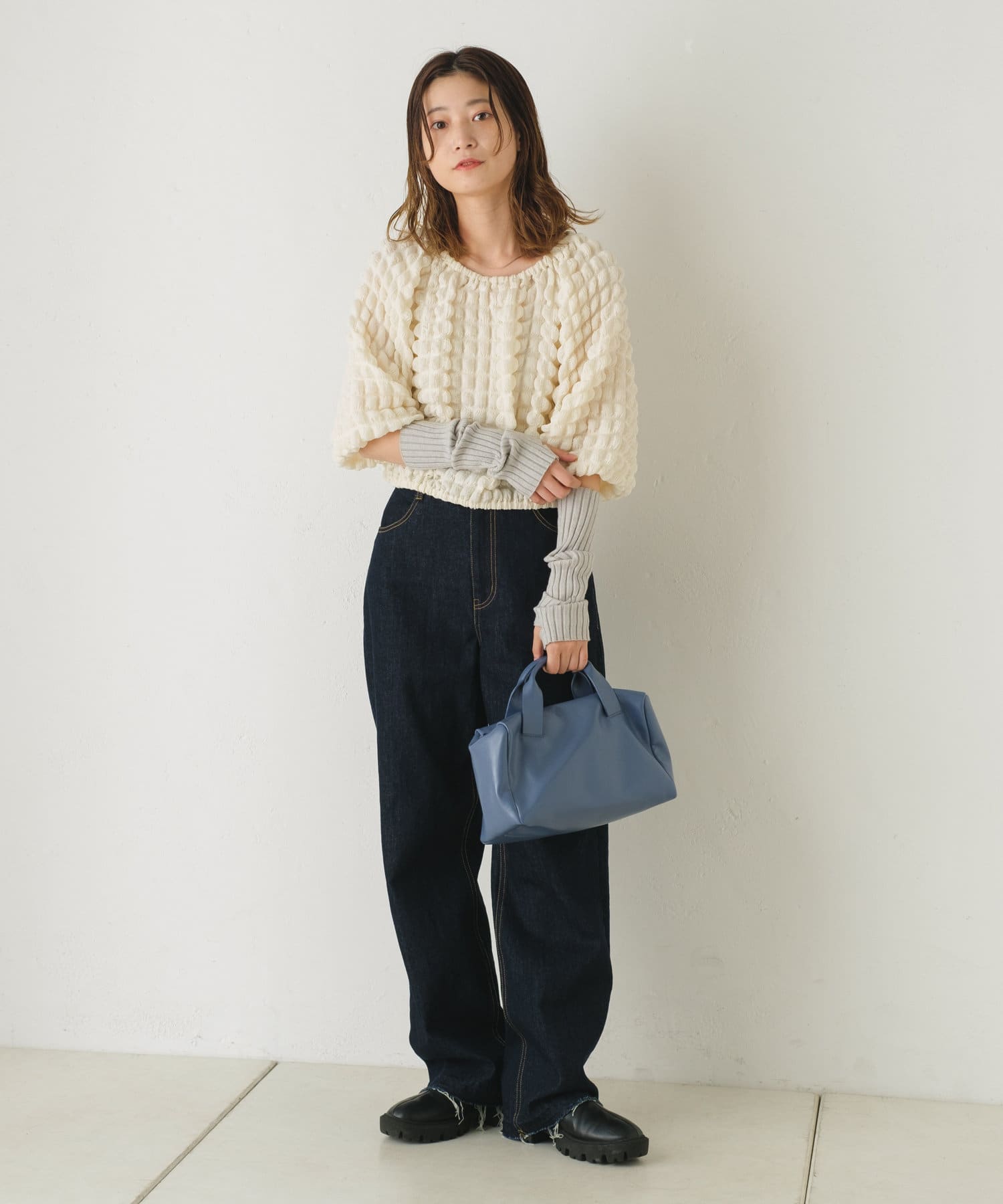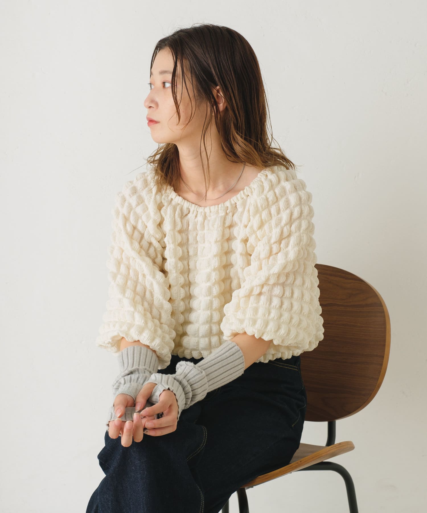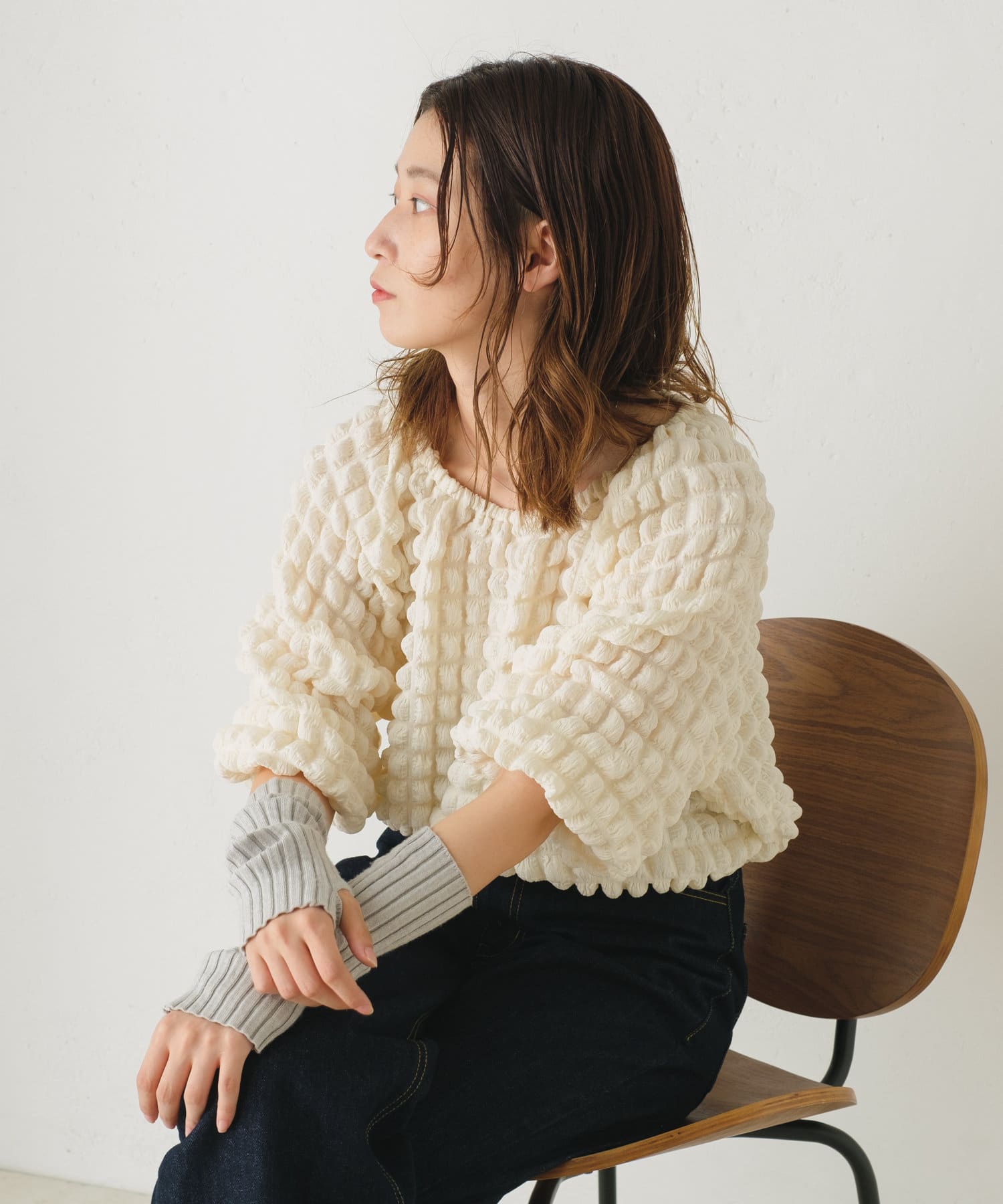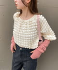 ポコポコとした表面感のあるデザインが、1枚で着用頂いても華やかなコーディネートを演出してくれます。