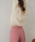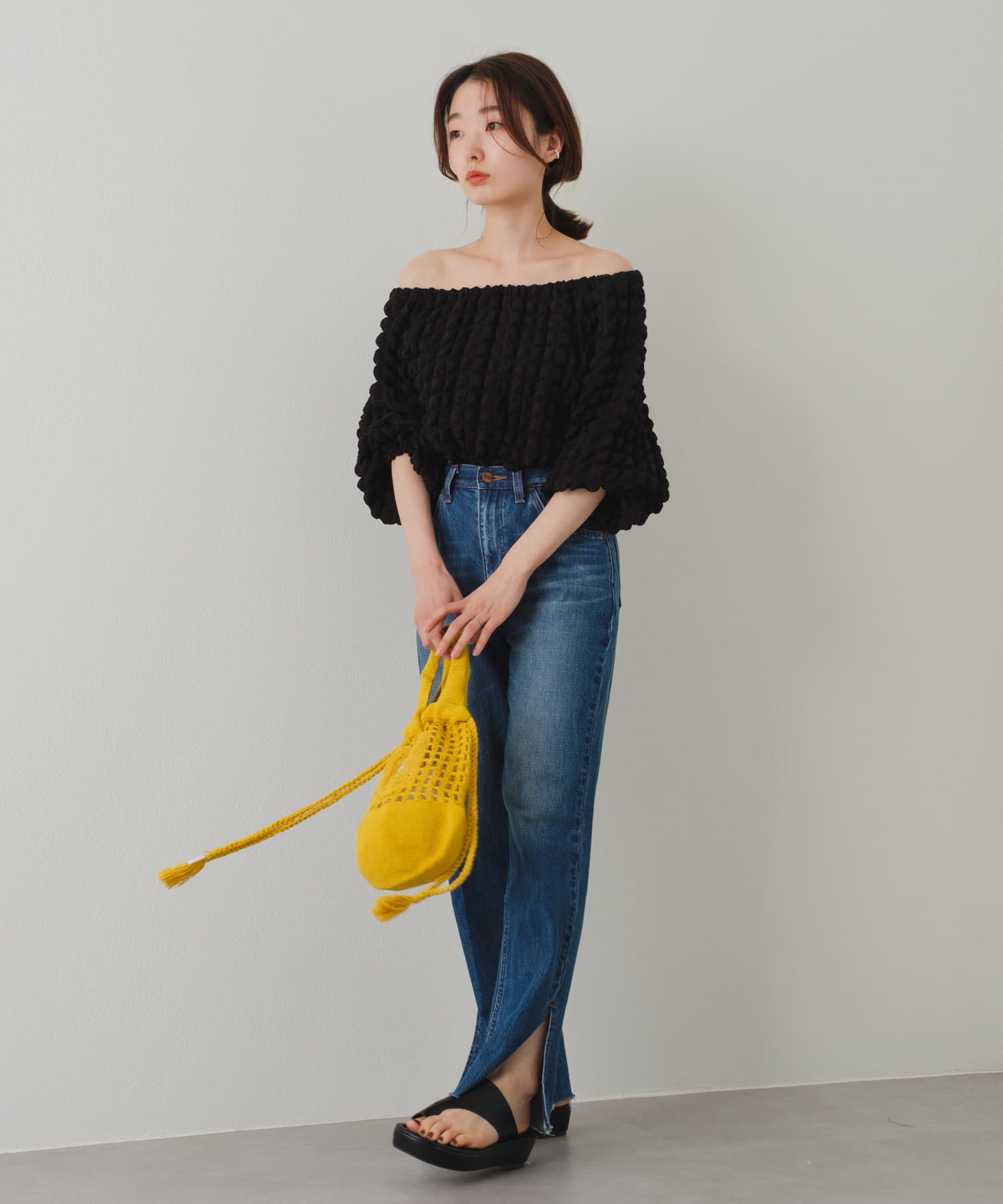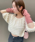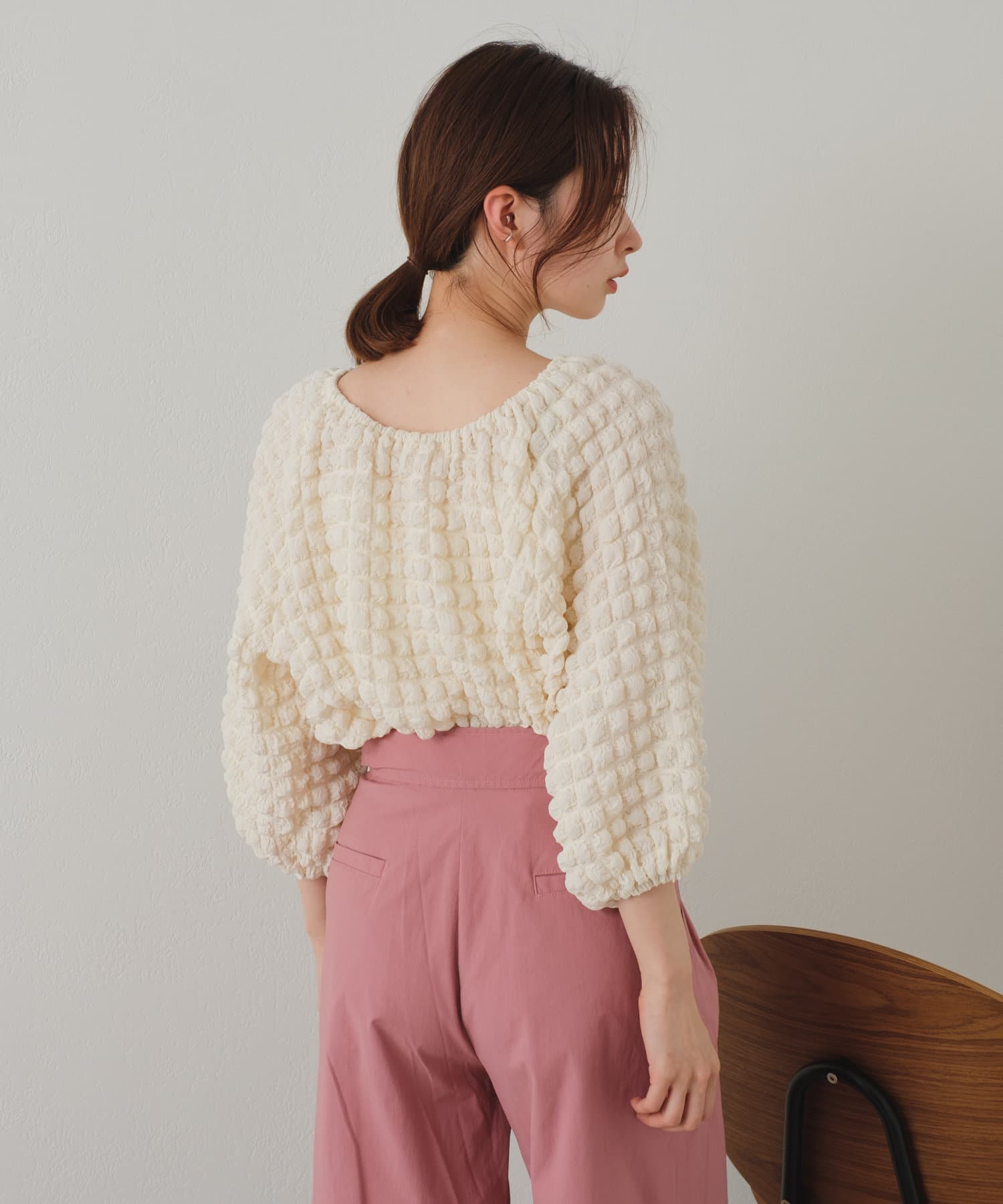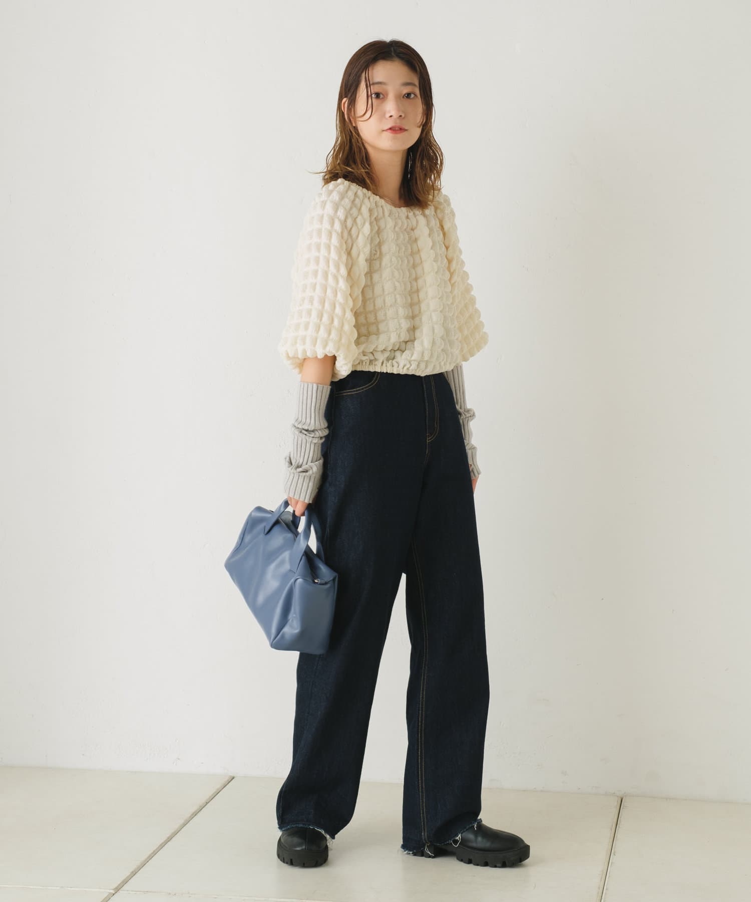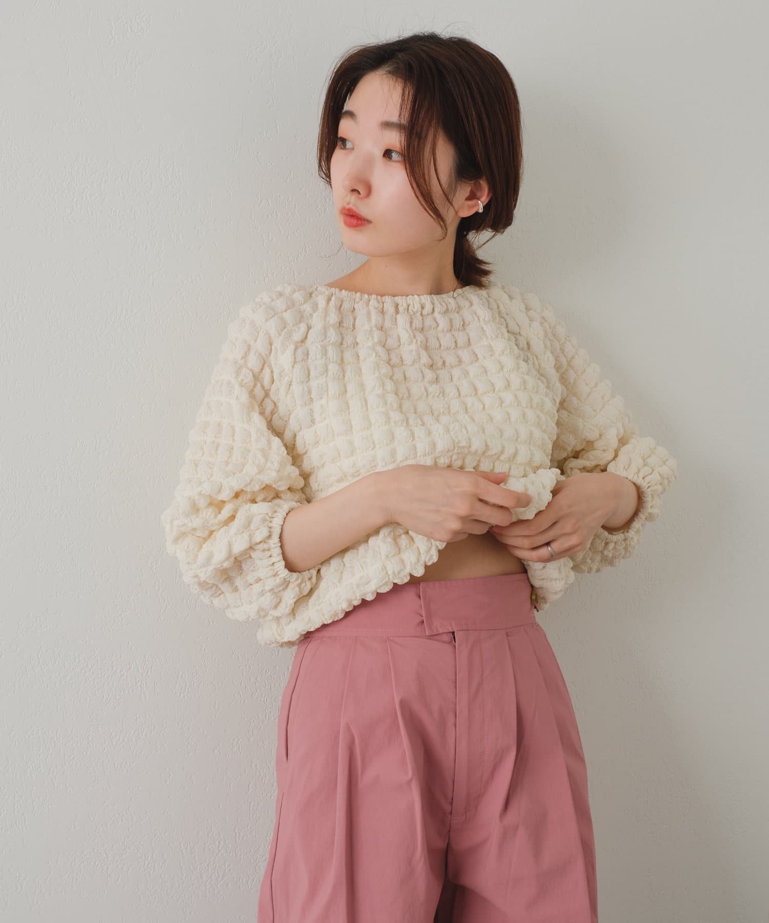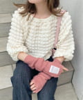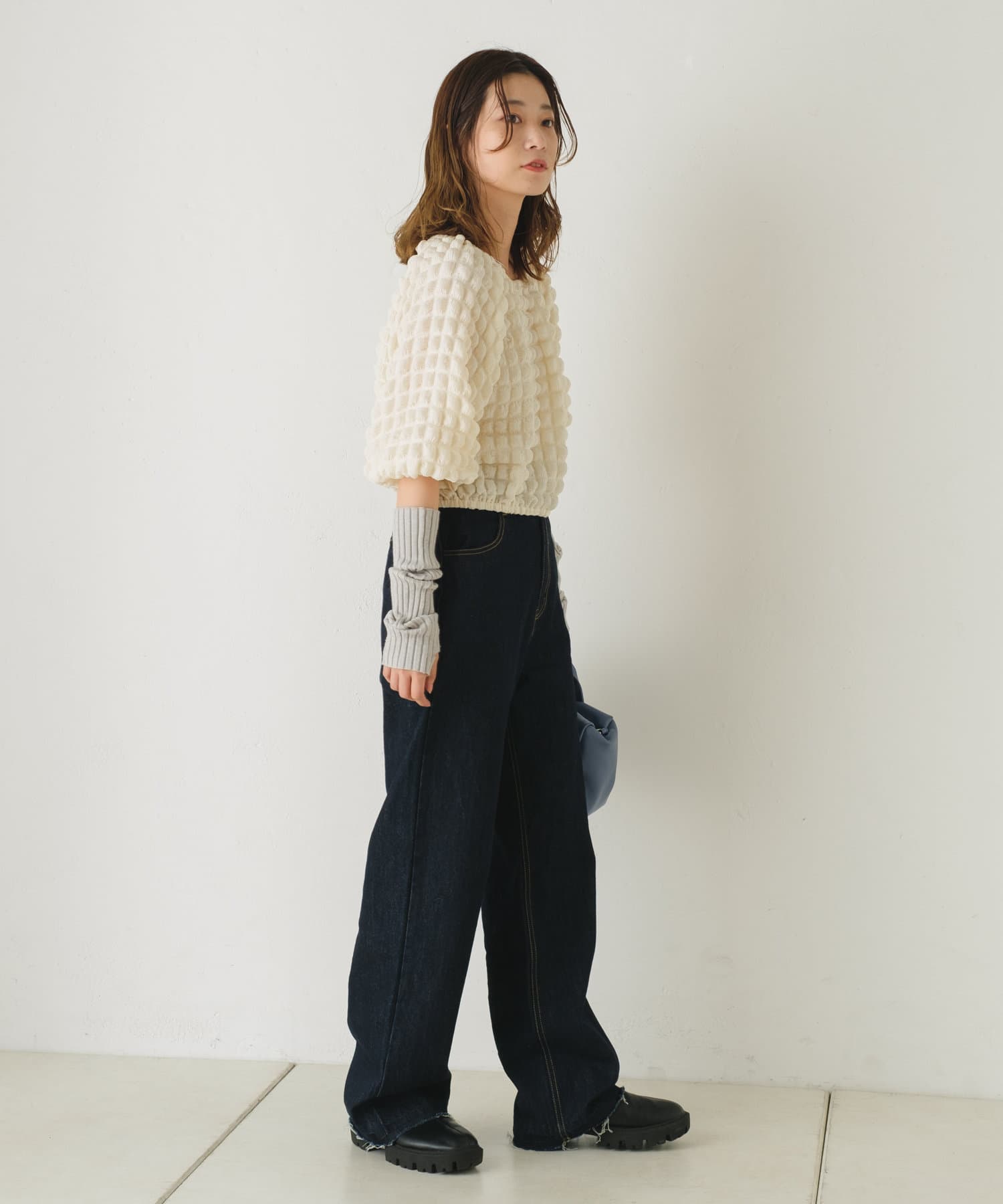 ポコポコとした表面感のあるデザインが、1枚で着用頂いても華やかなコーディネートを演出してくれます。