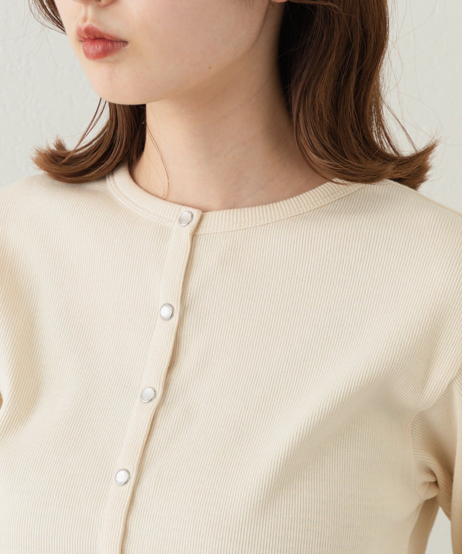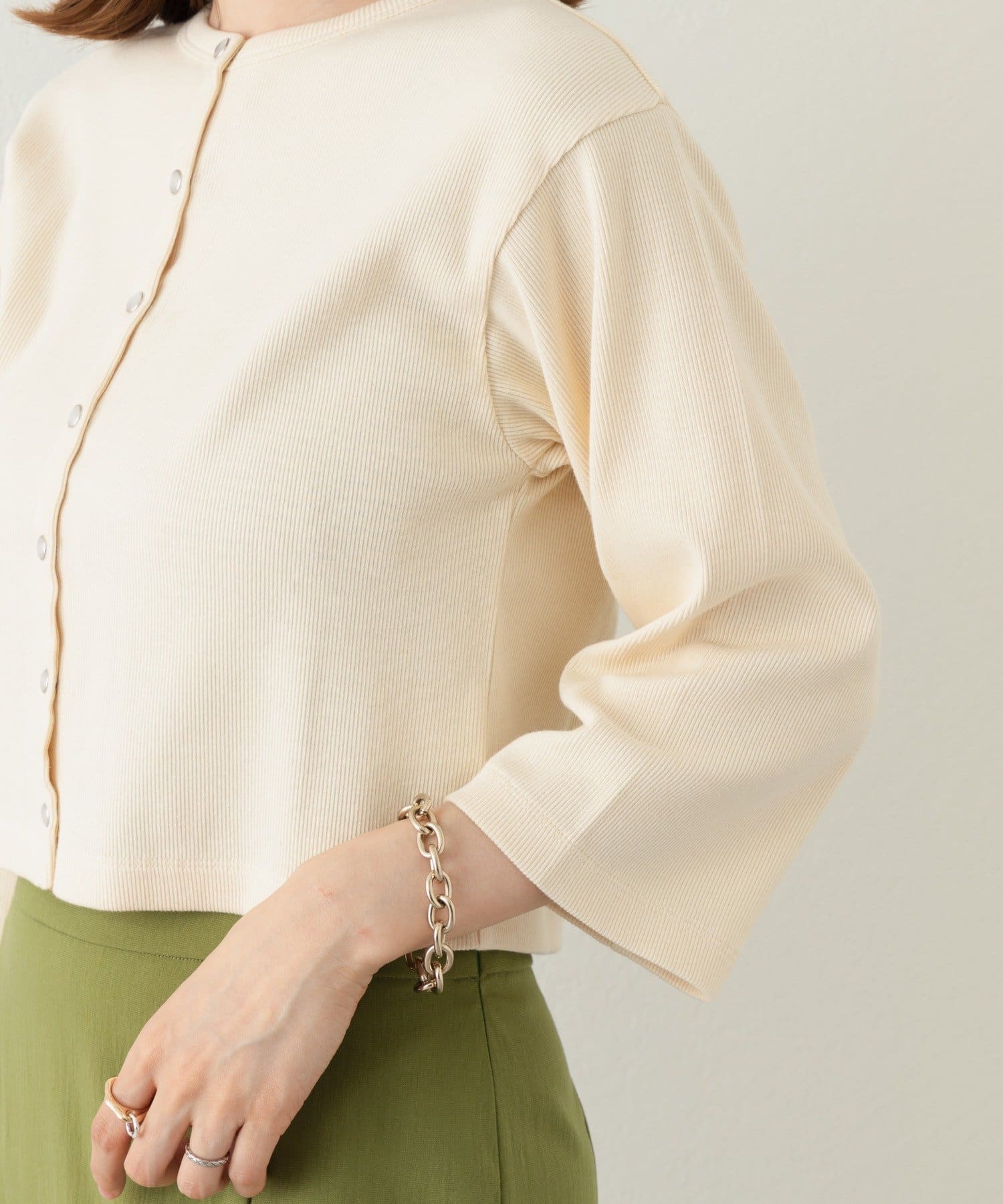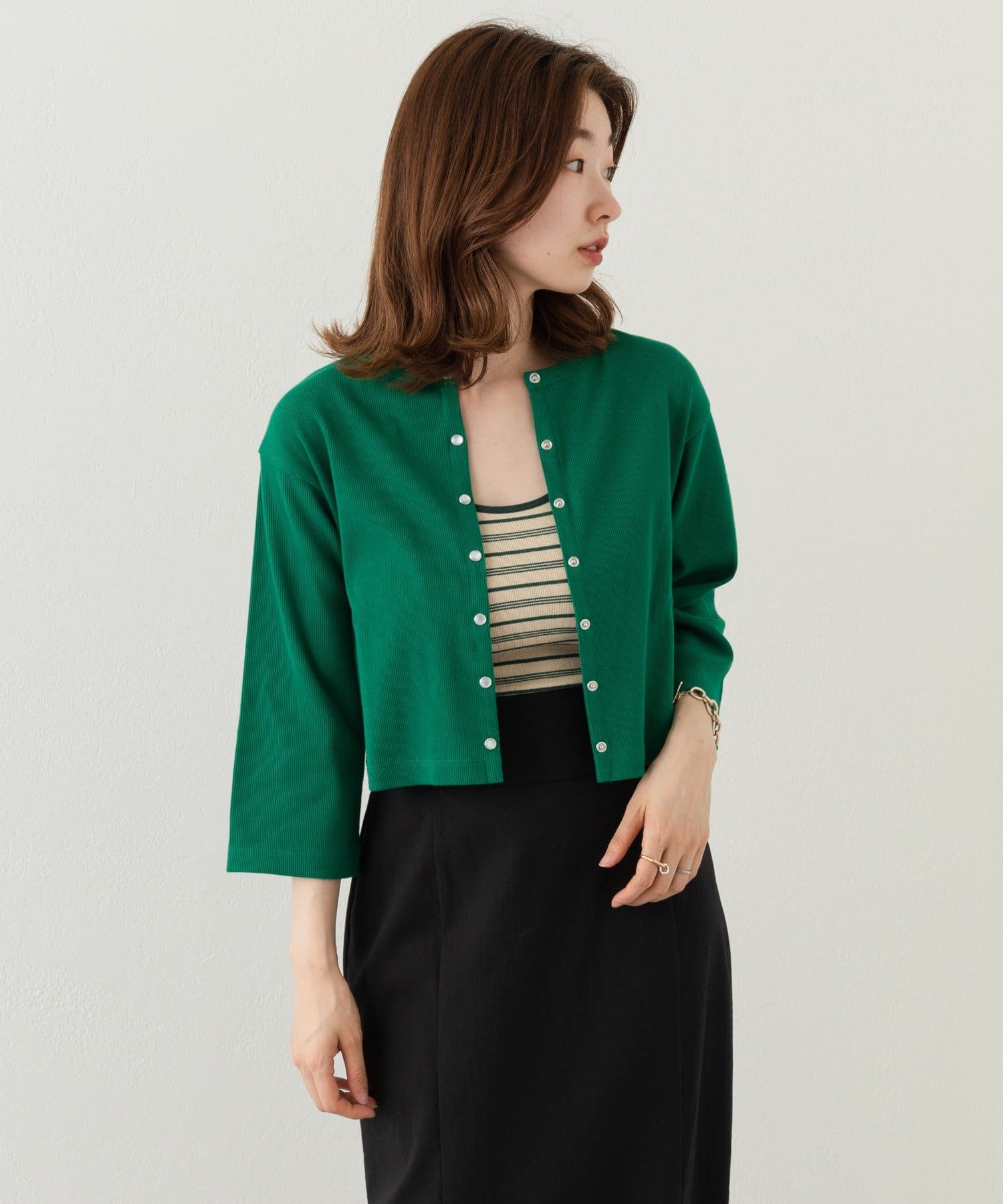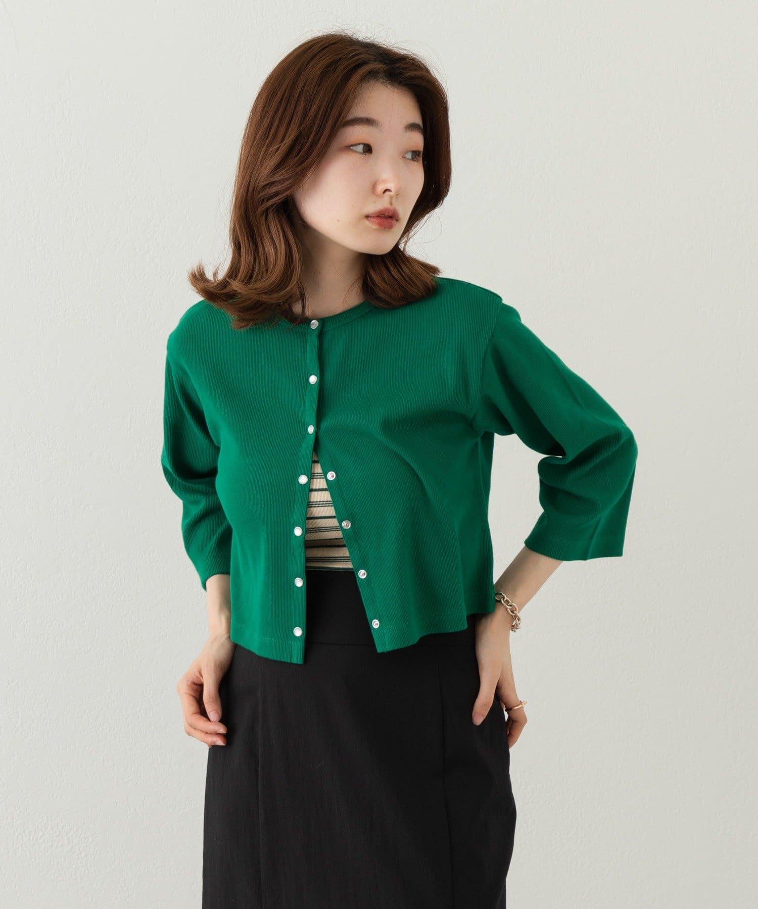 シンプルなボディに映えるボタンがポイントになったクロップドカーディガンです。