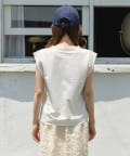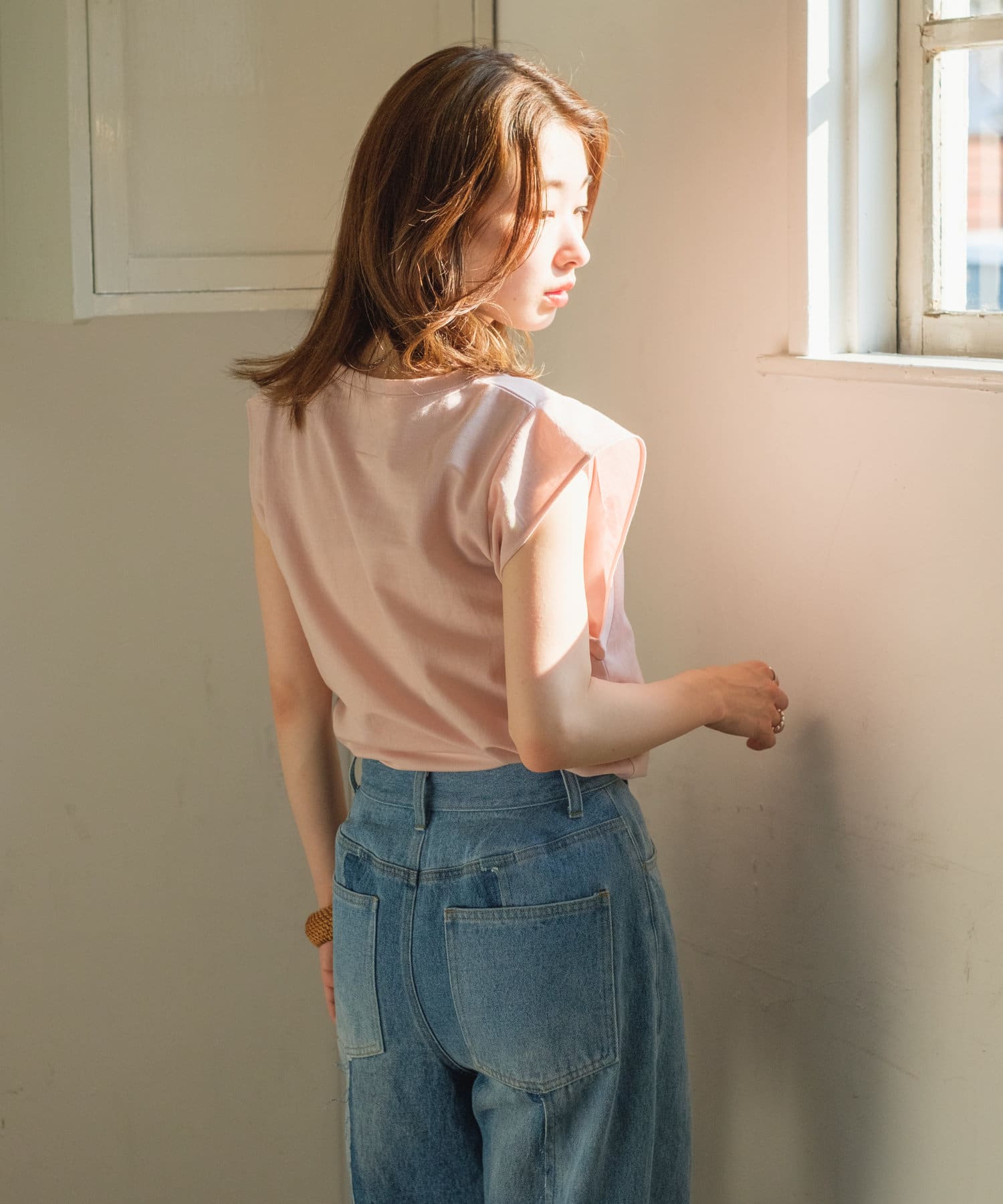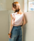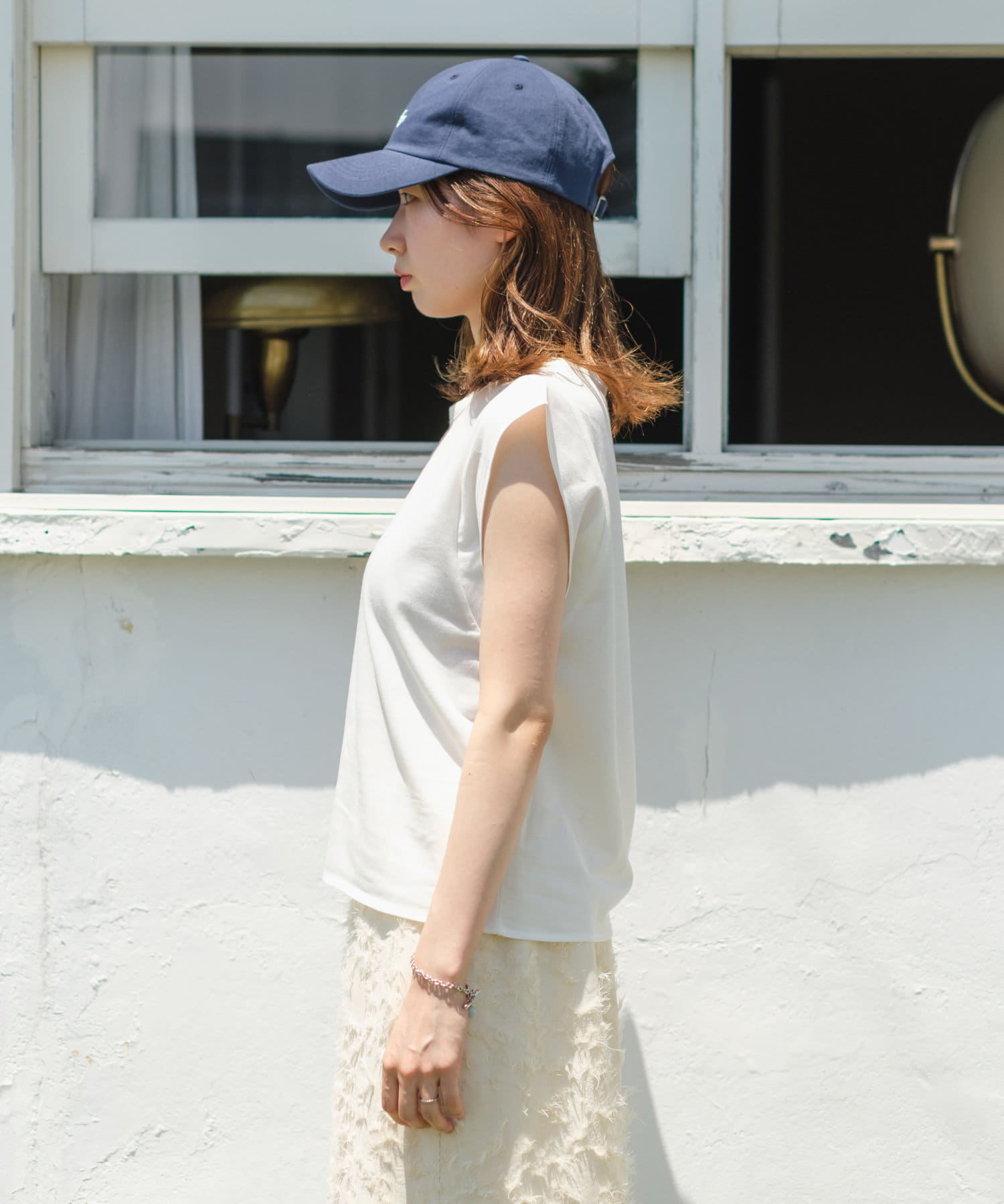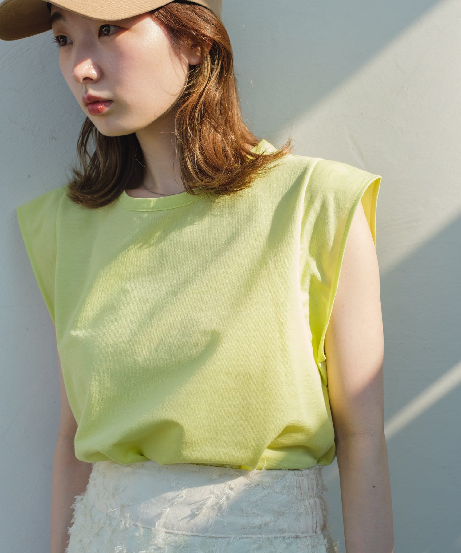 肩に少しかかるくらいの袖丈なので、ノースリーブに抵抗がある方も着て頂きやすいデザイン。
