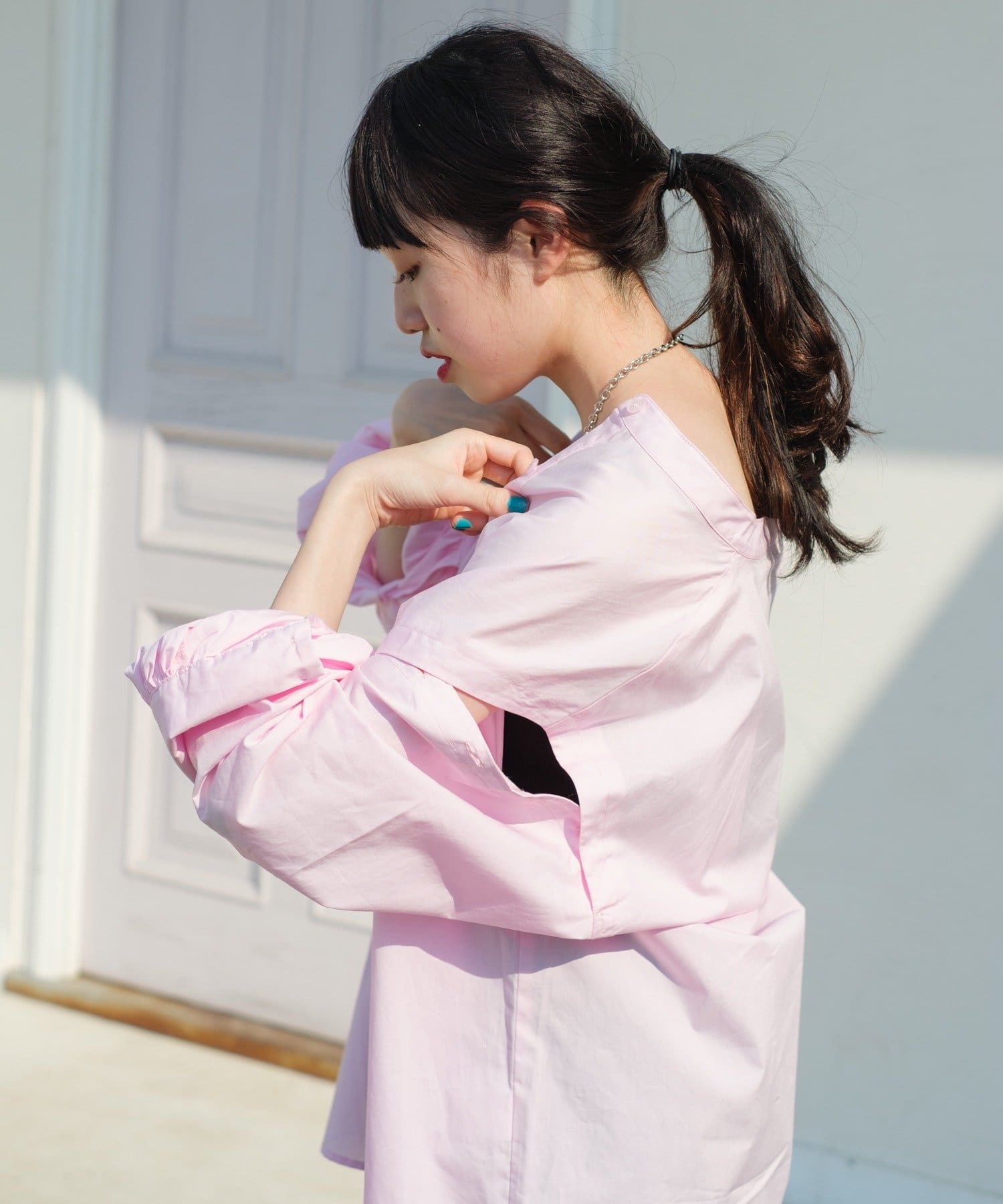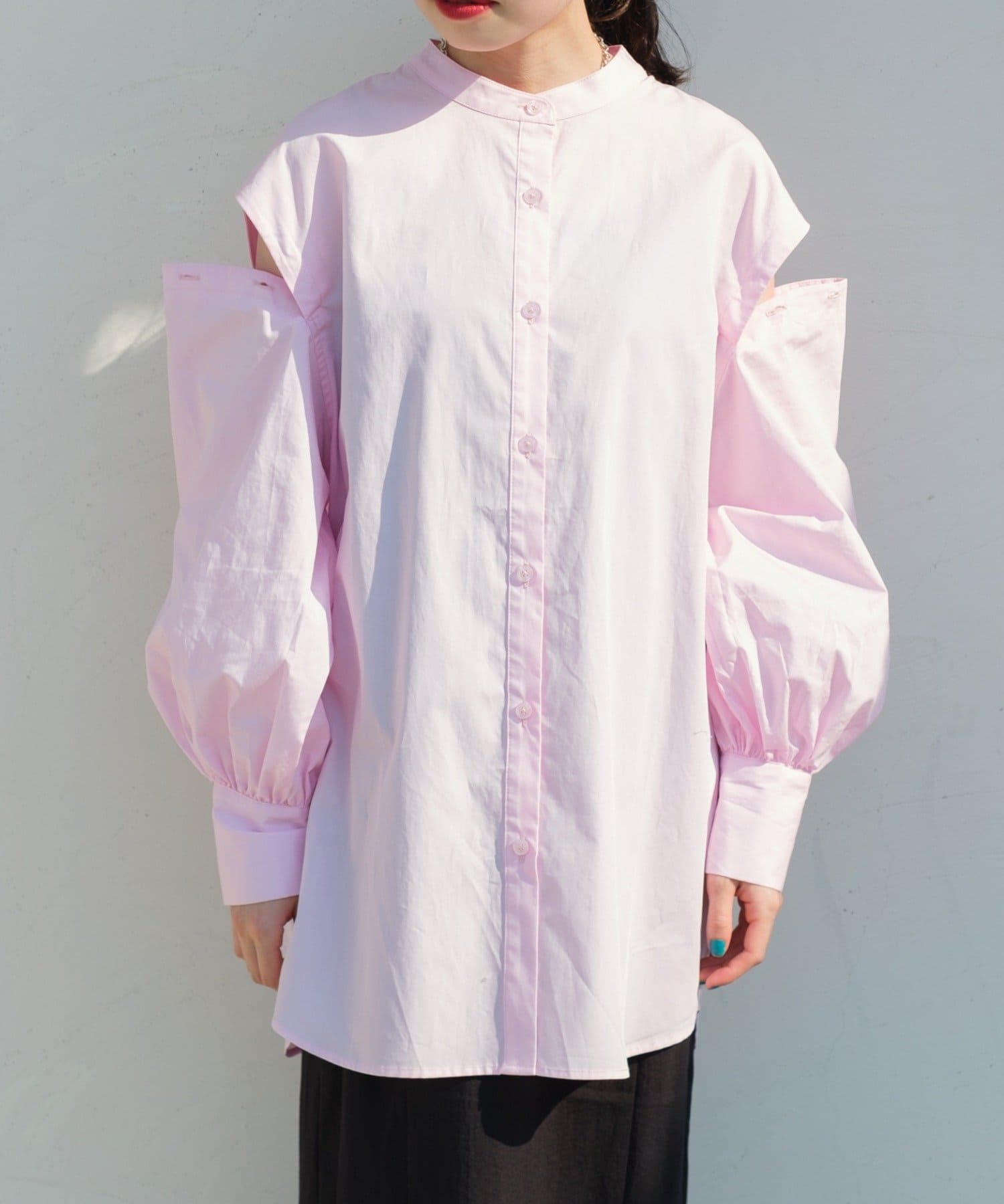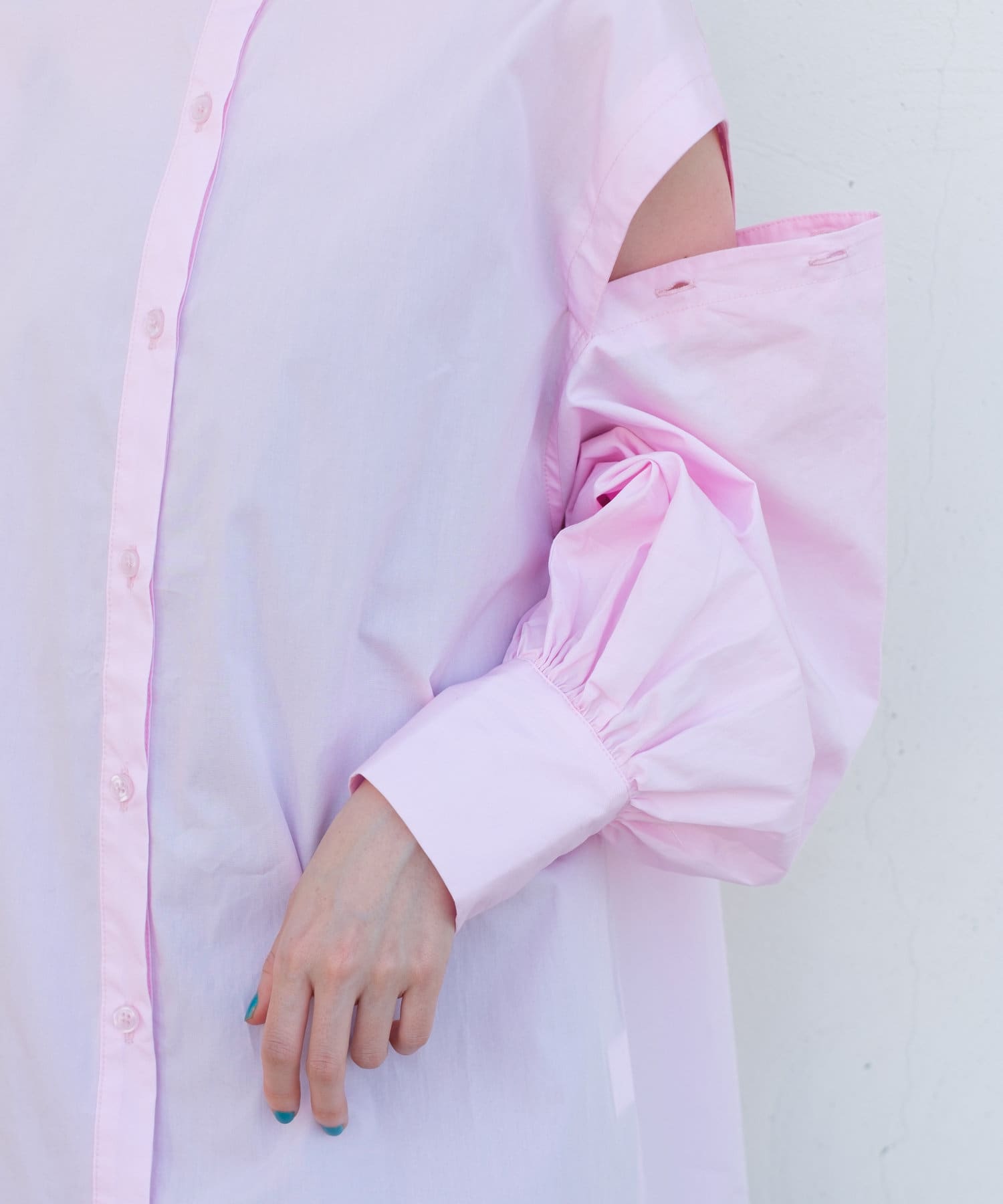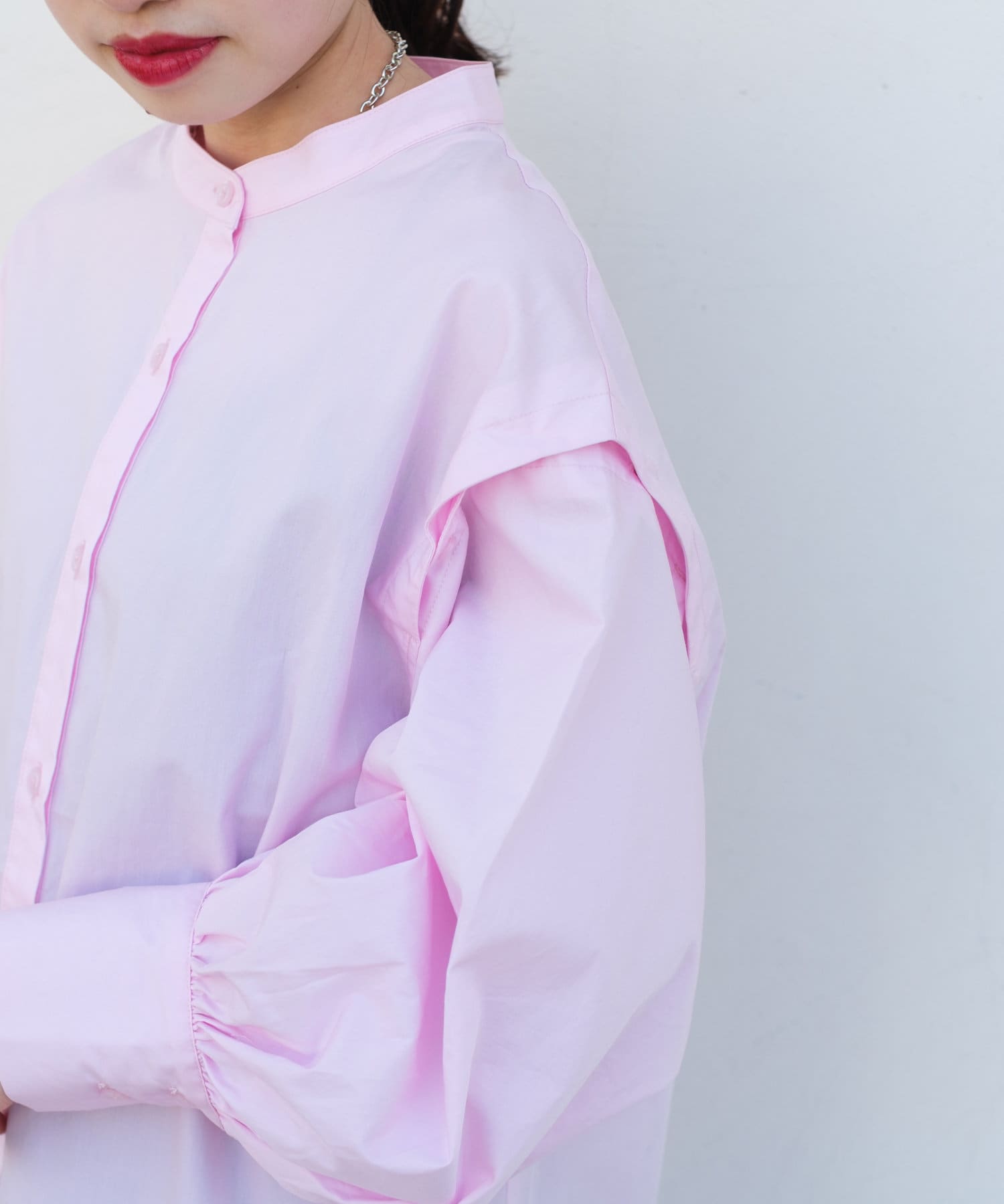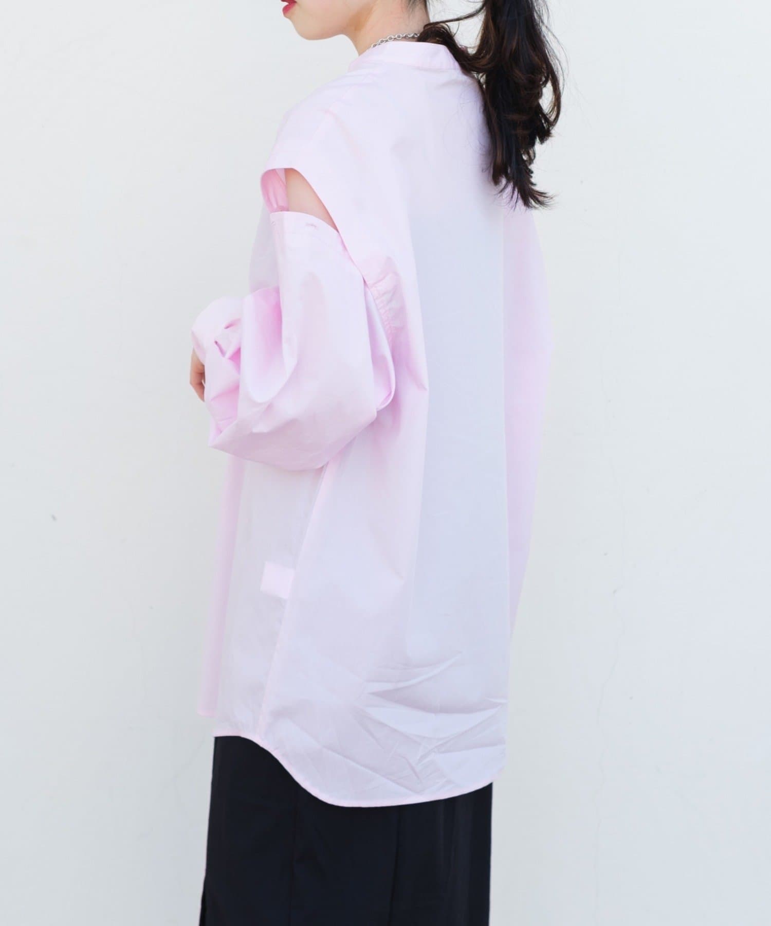 全部閉めてシンプルなシャツとしても、途中まで開けてオープンショルダーとしても着用できるマルチなアイテム。