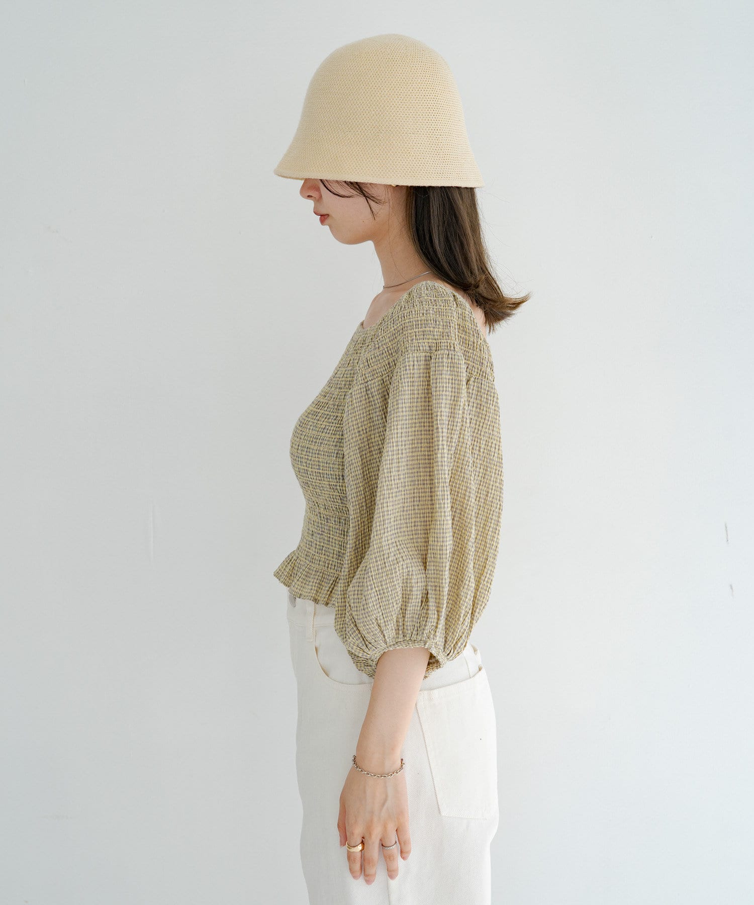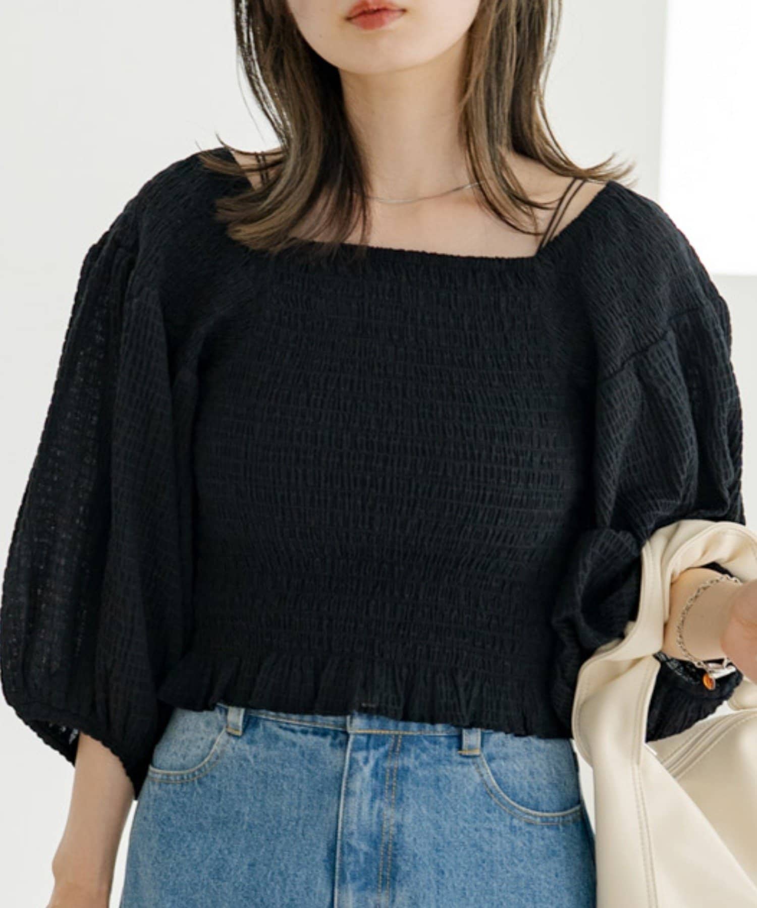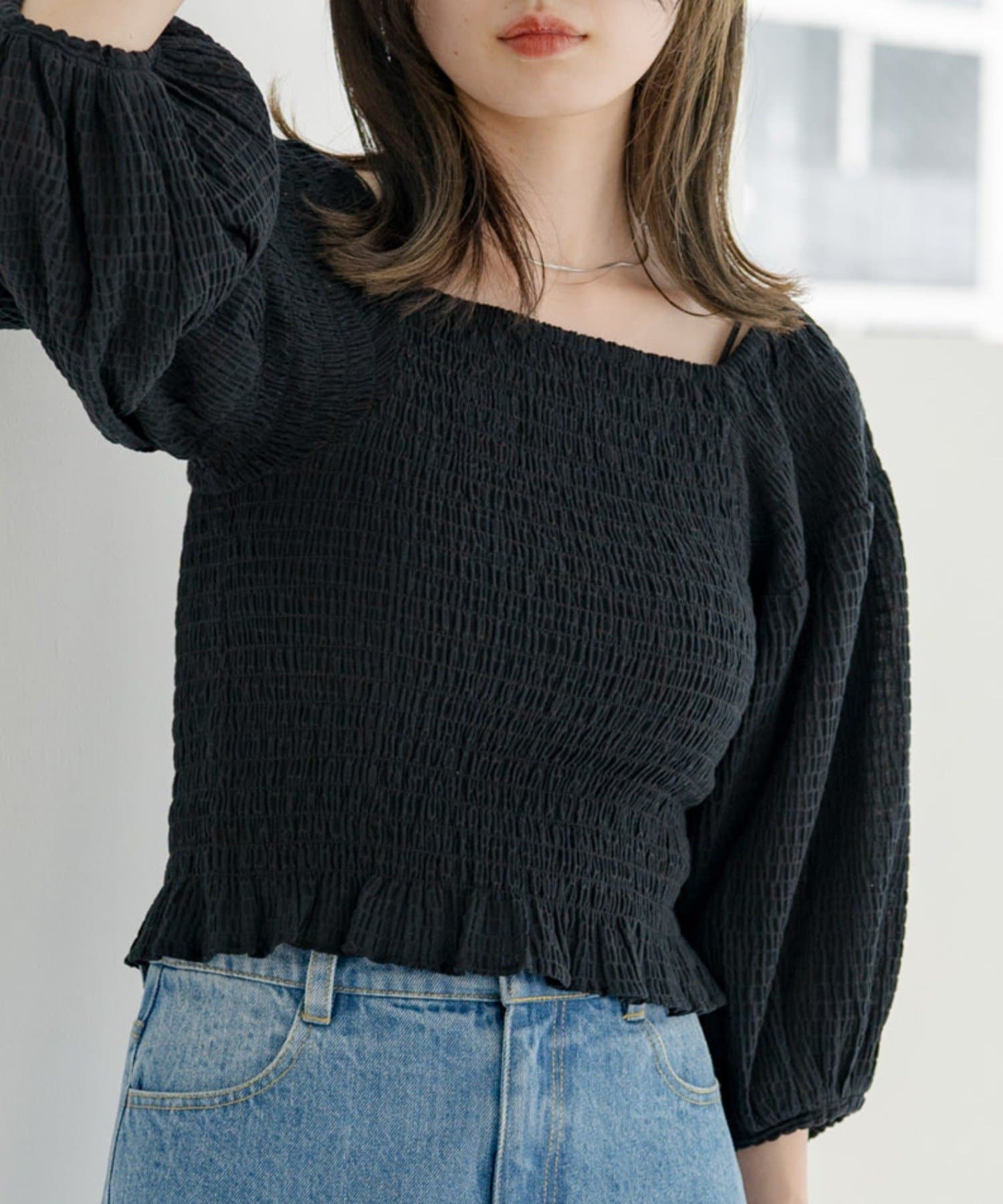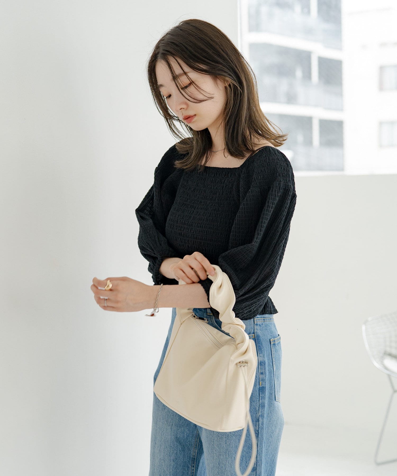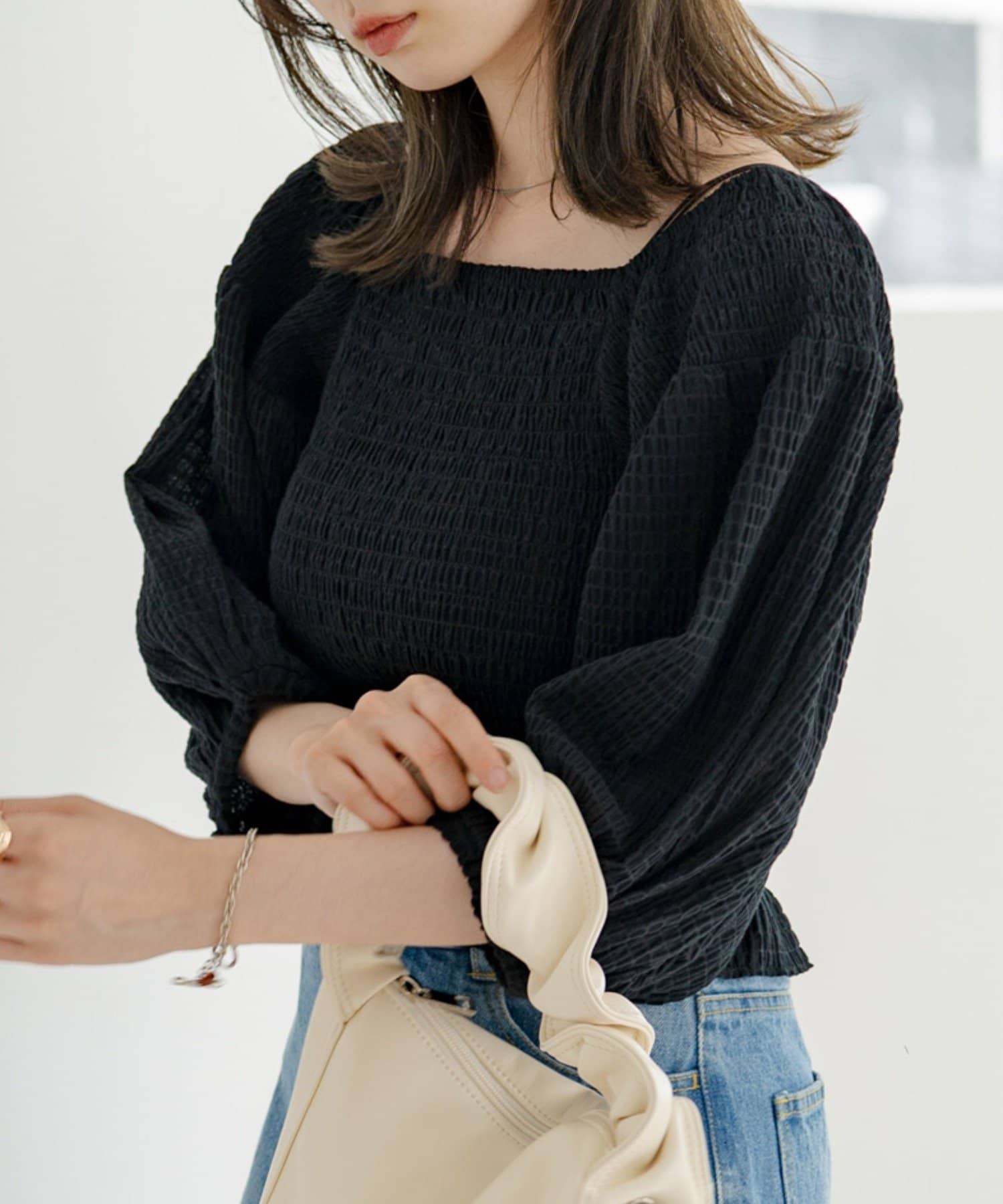デコルテを綺麗に見せてくれる、シャーリングブラウス