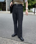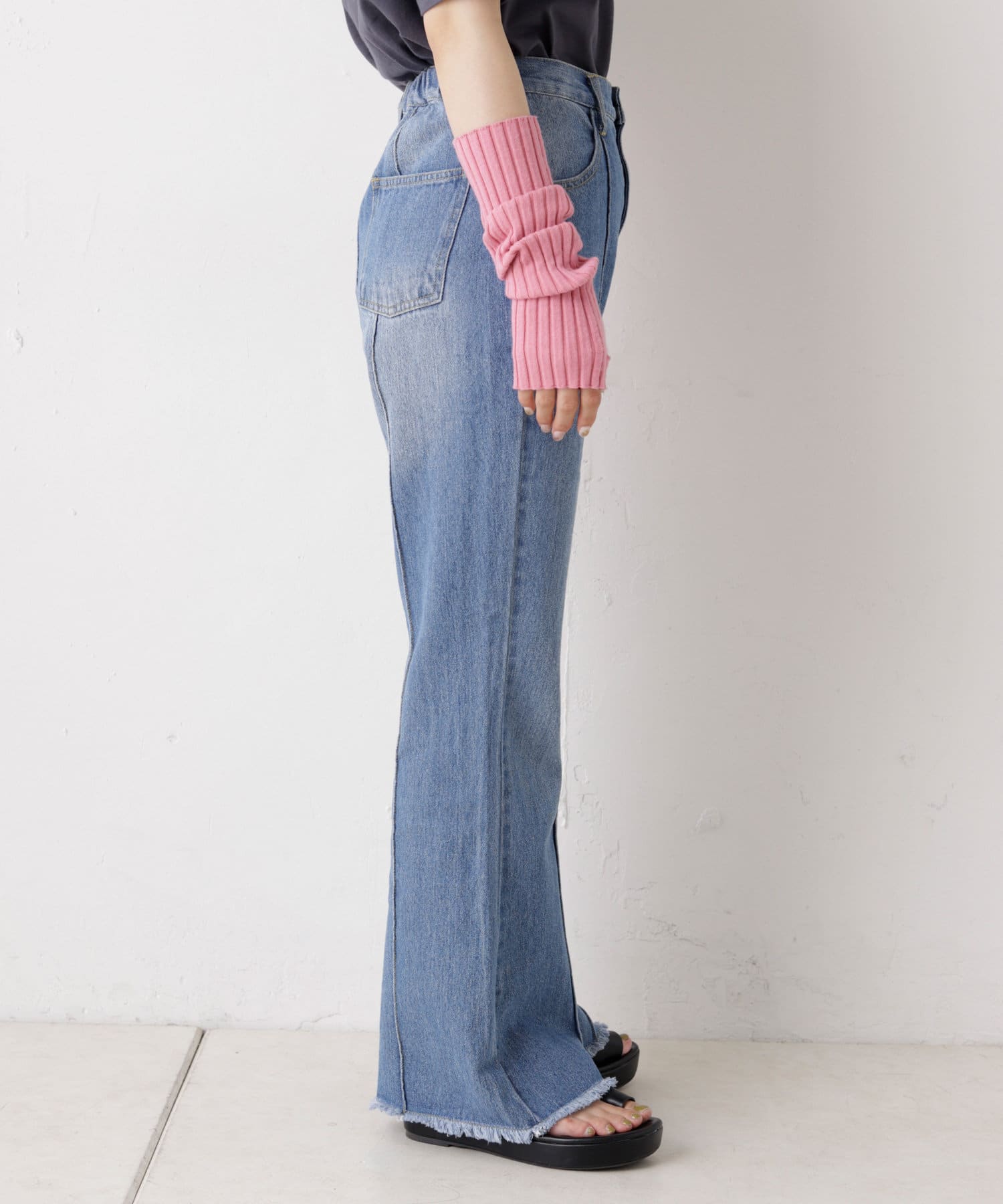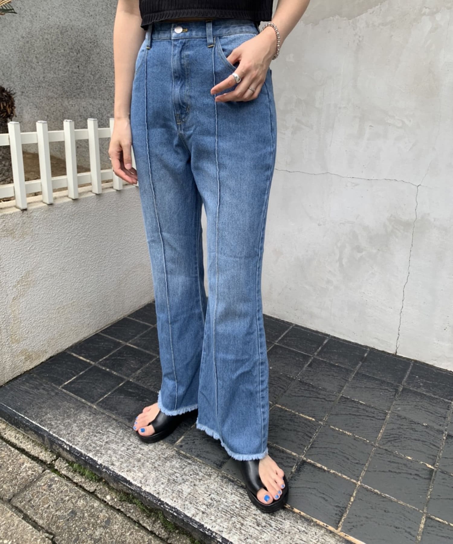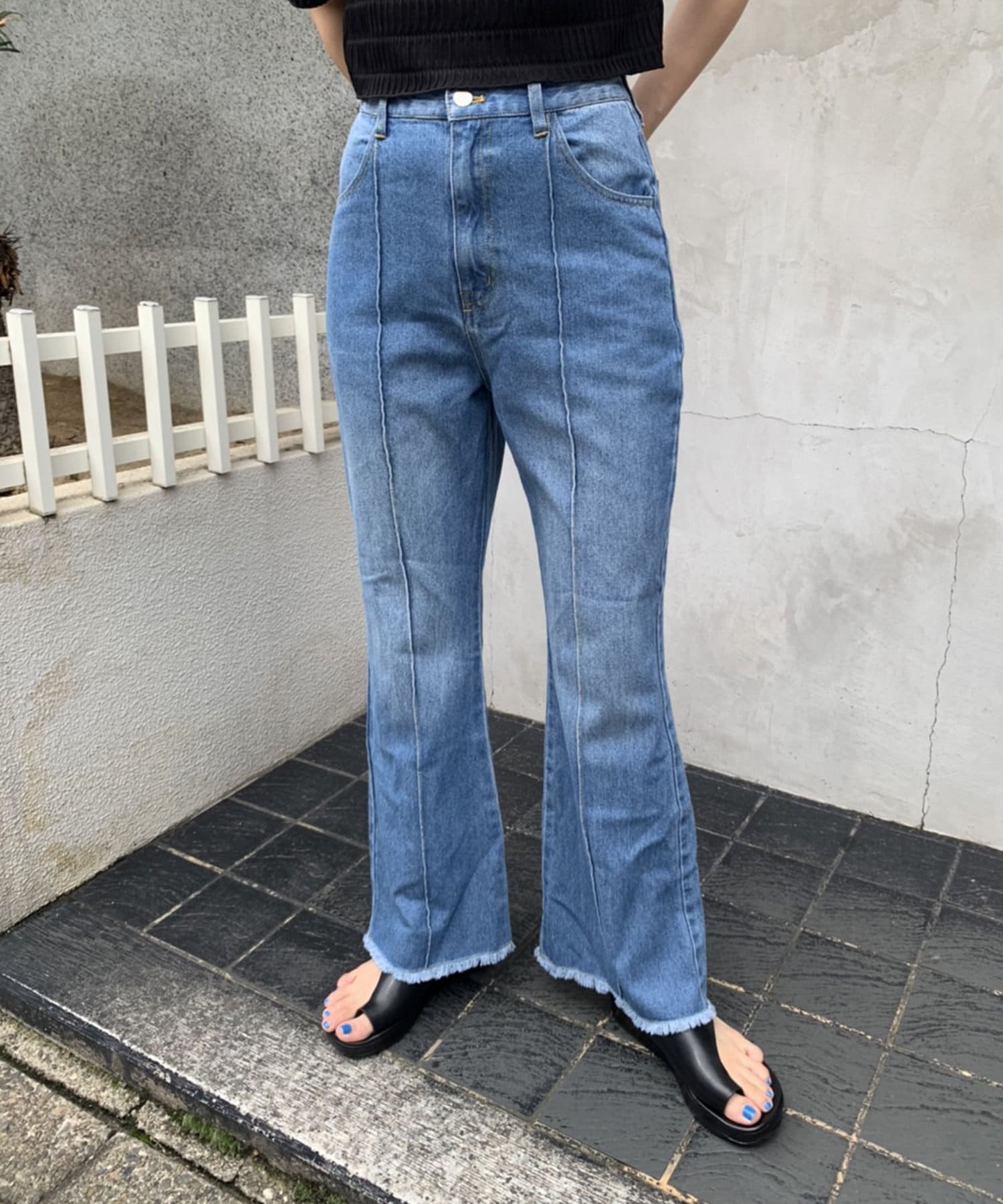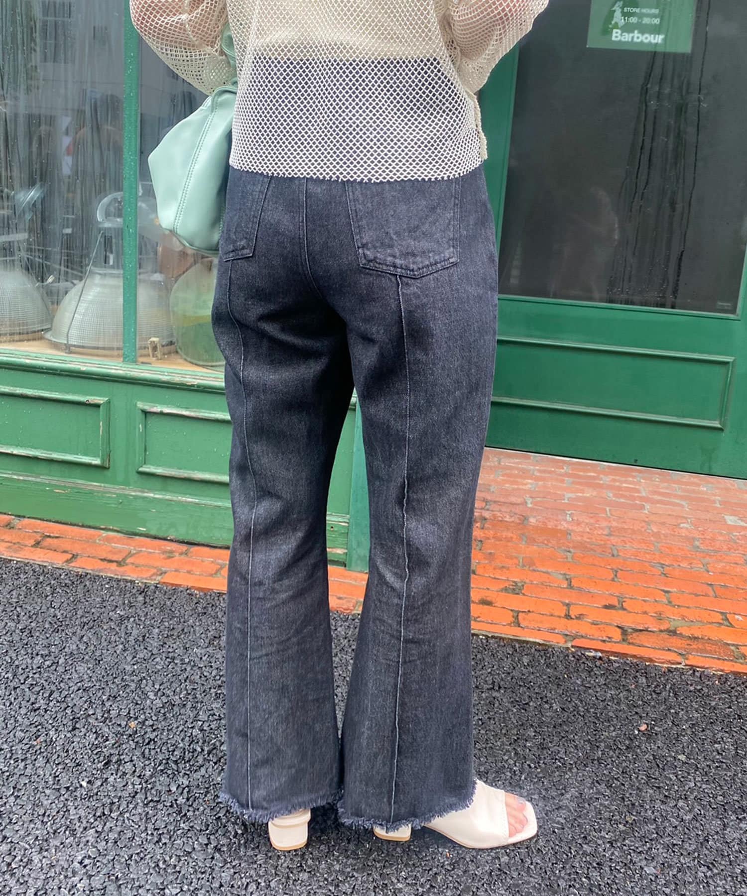 裾に向かって綺麗なフレア型になったデニムパンツ。