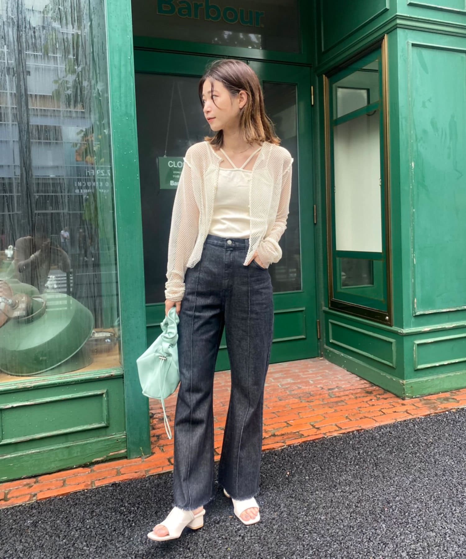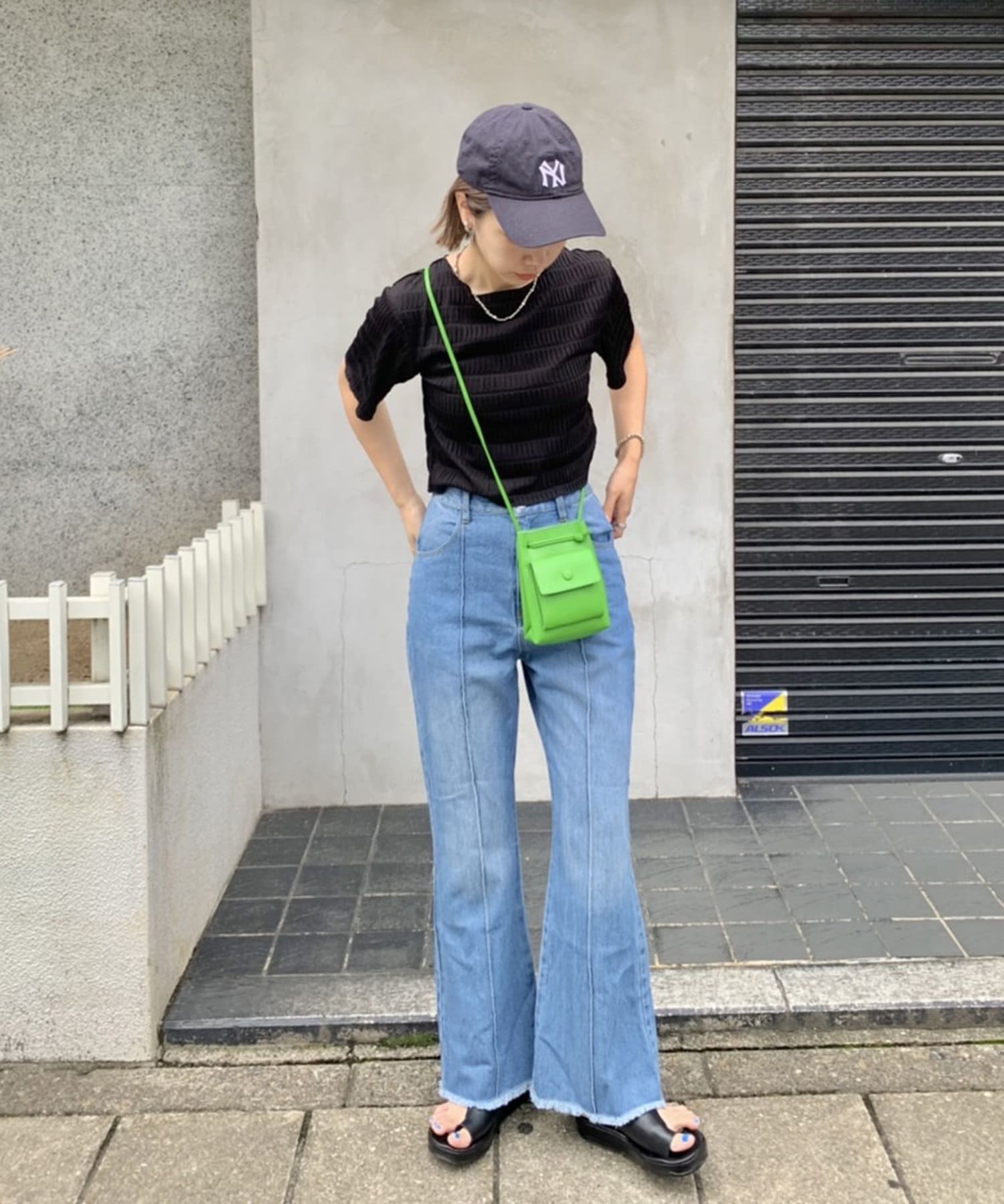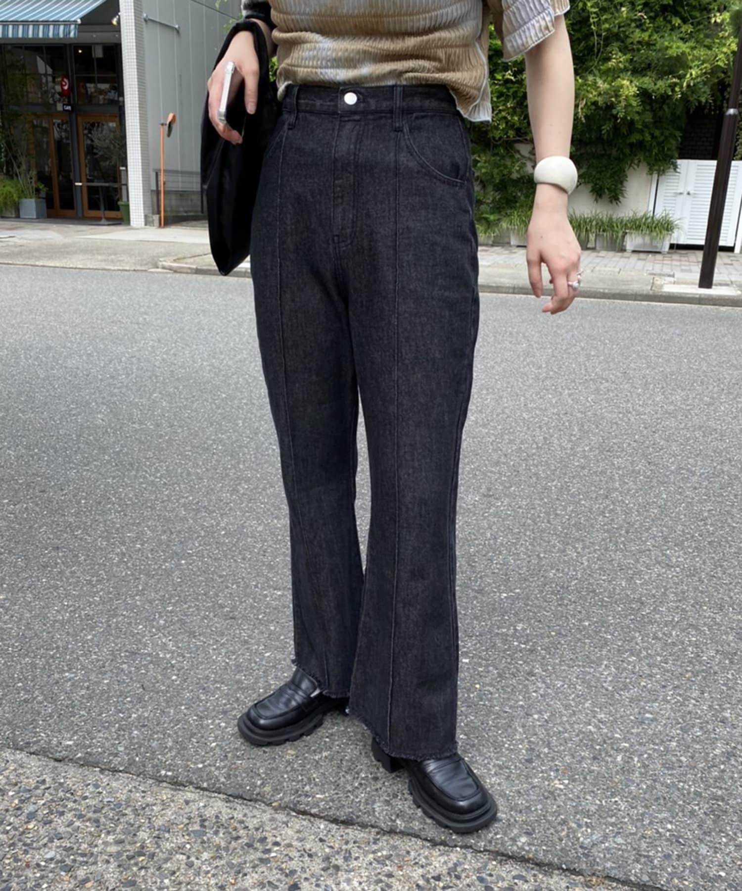 裾がフレアなので、厚底サンダルやボリュームのあるスニーカーなども相性抜群です。