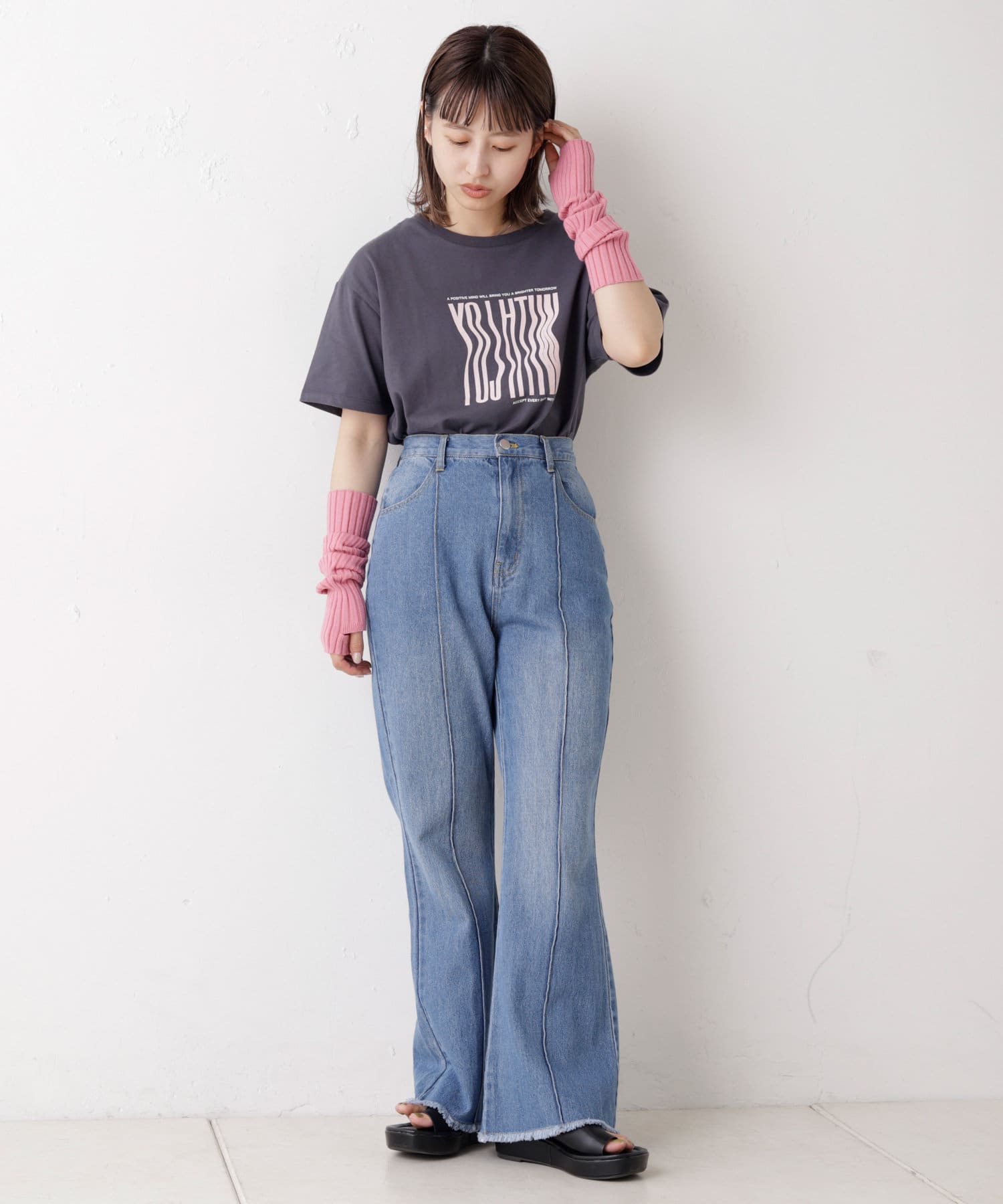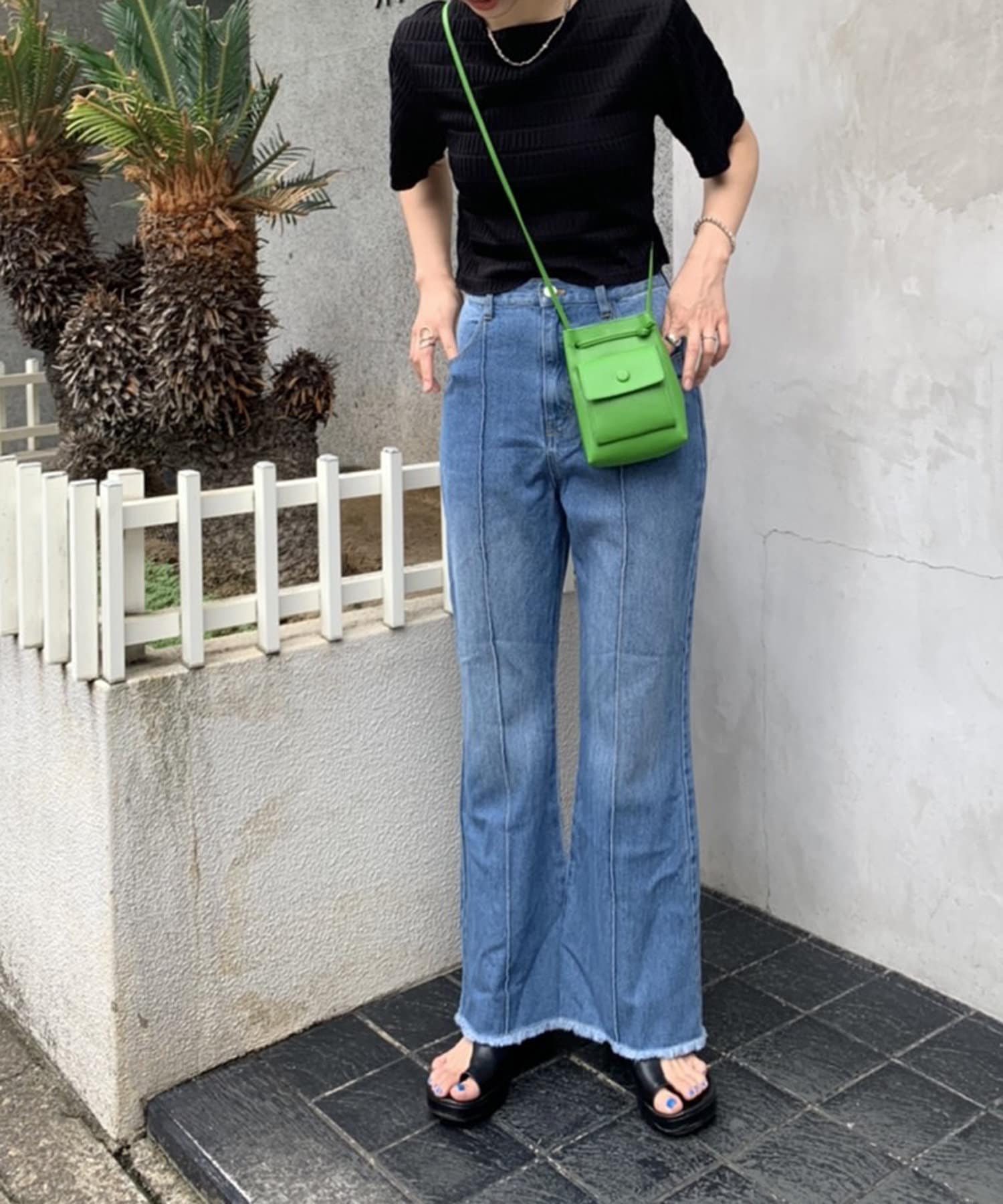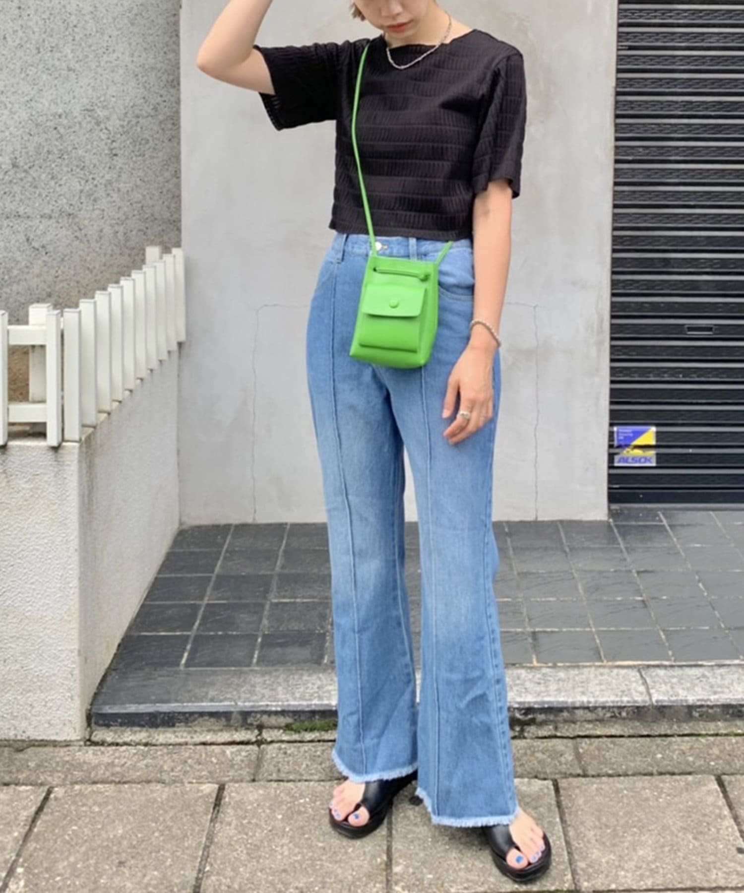 裾がフレアなので、厚底サンダルやボリュームのあるスニーカーなども相性抜群です。