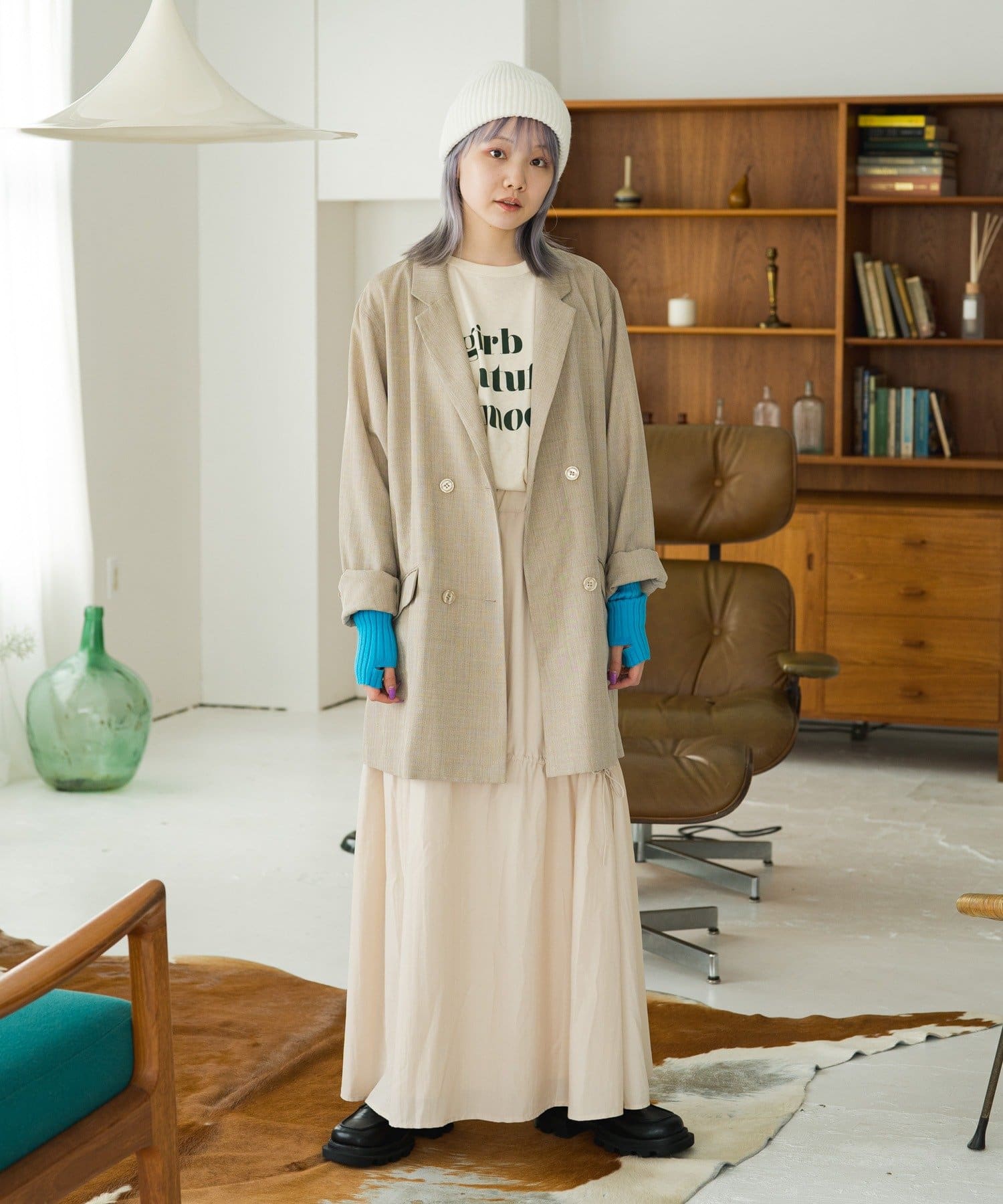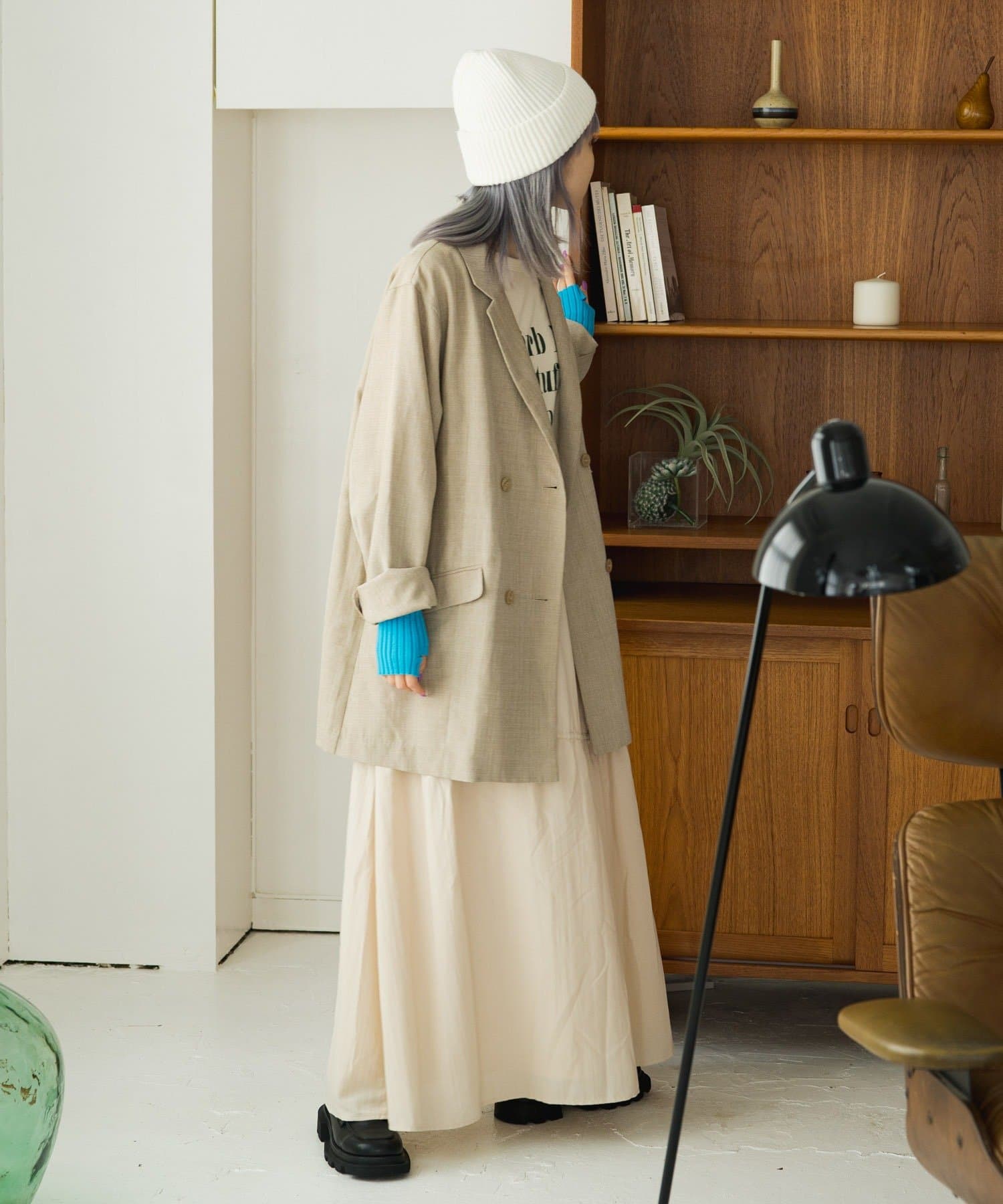 カジュアルに着たい方はオーバーサイズのスウェットやロンTを合わせて頂くのがおすすめです。