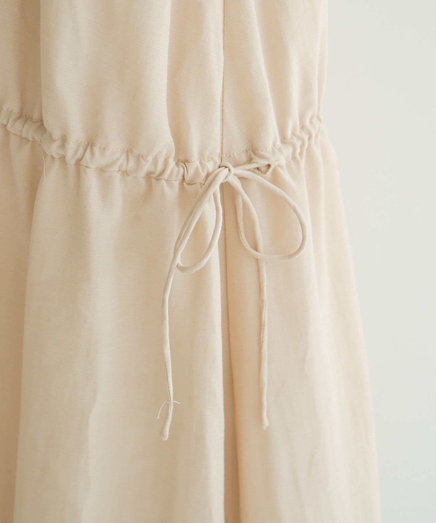 斜めに施したシャーリングが魅力で、両サイドのリボンをひとつ結びで垂らしても、リボン結びにしても素敵な一着。