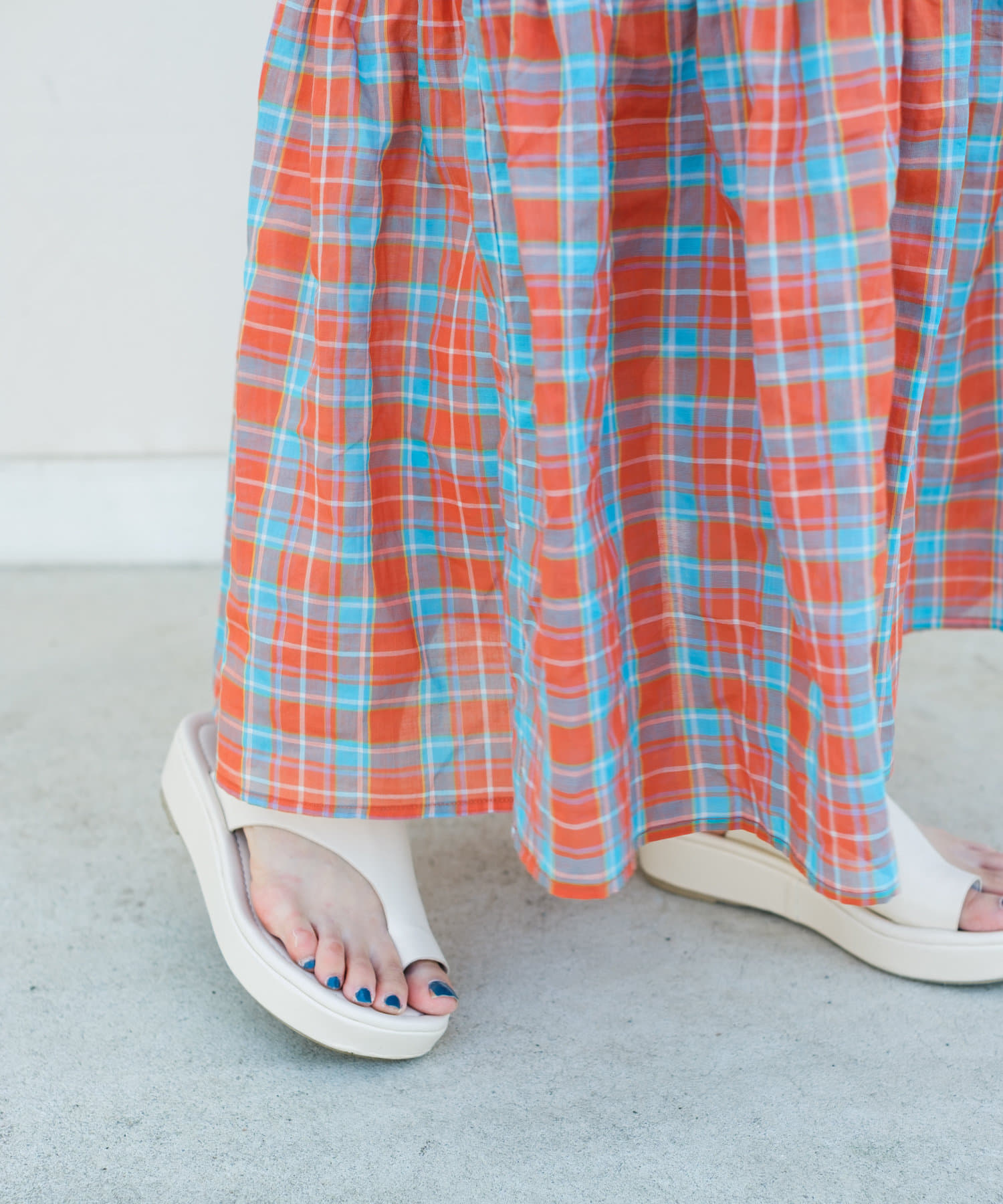 購入場所:店舗オレンジと水色の中々ない配色のチェックに一目惚れして狙って買いましたが生地感透け感形すべてかわいくて泣きました もう今お出かけの日全部これ着たいです!身長159cmで同じカスタネのトングサンダルに合わせたら丈感丁度よく着られる感じでした 本当にかわいすぎる