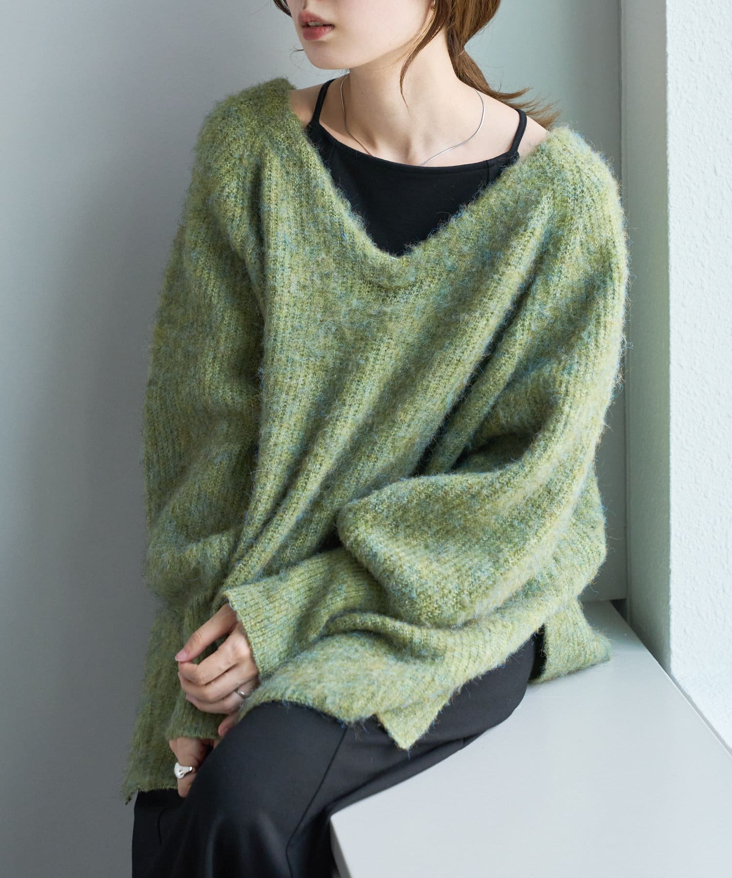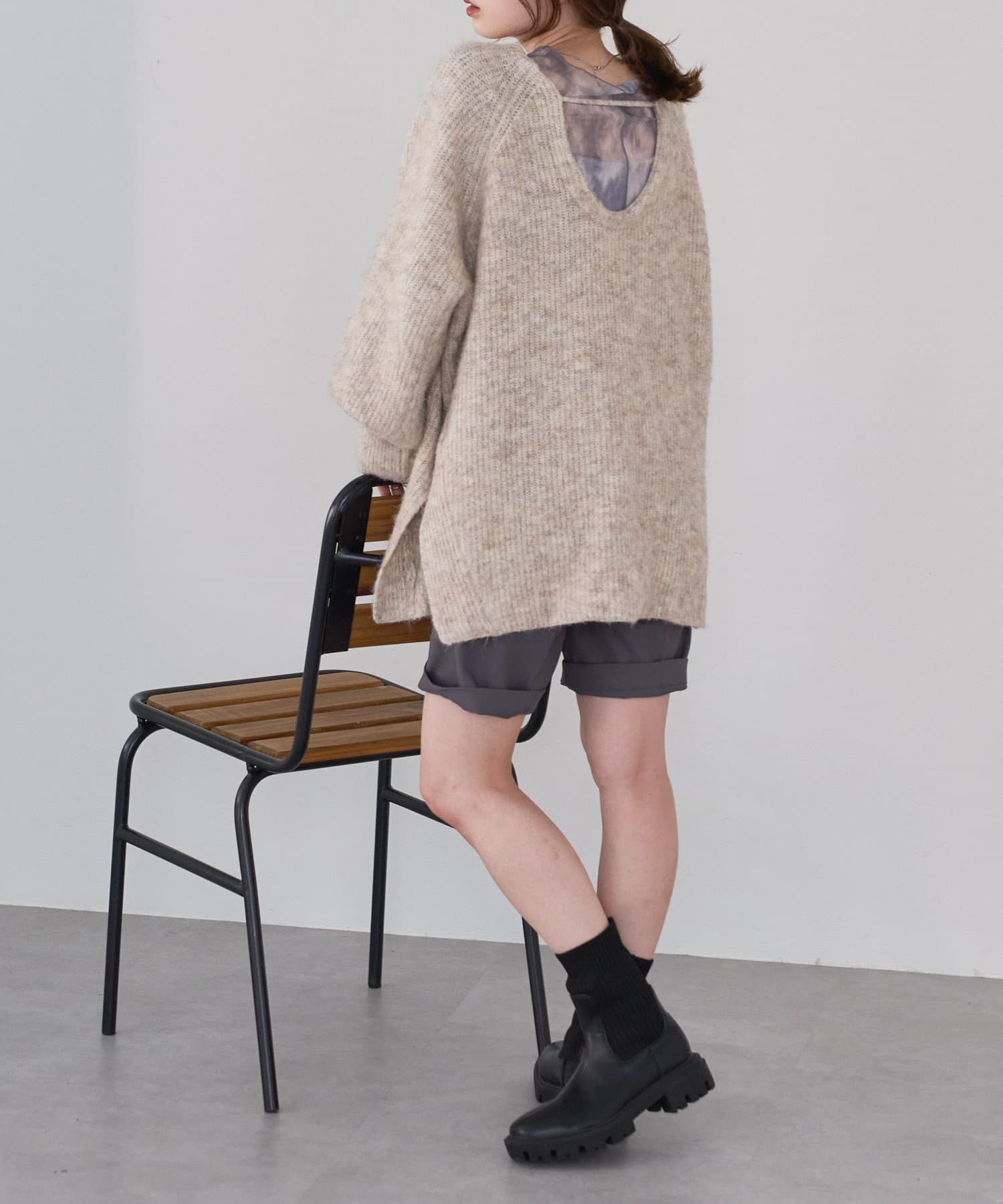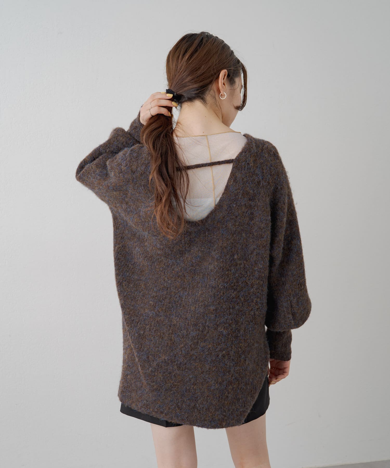 Vネックと背中開いたデザインが今までになかったデザイン性のあるローゲージニットです。