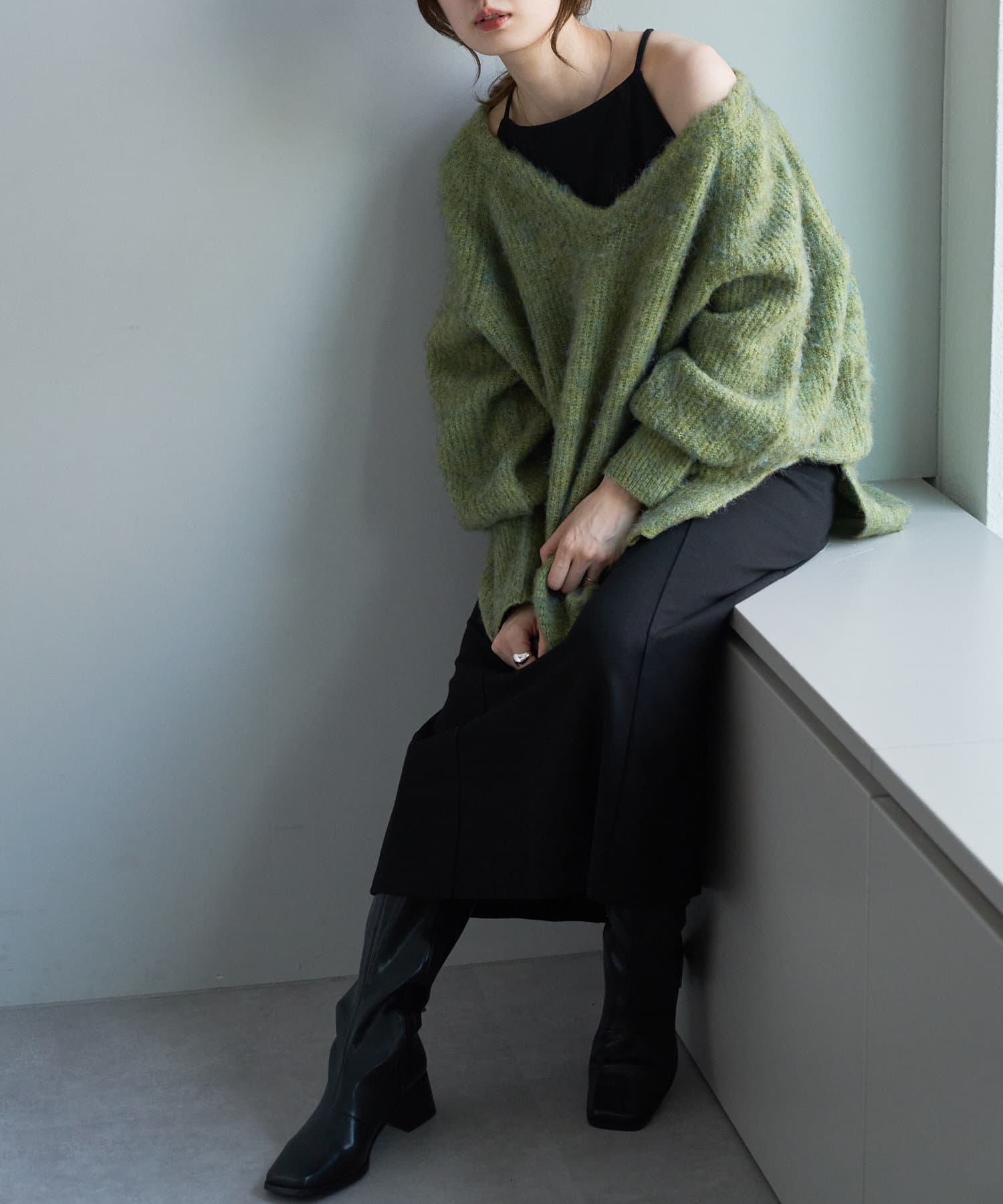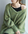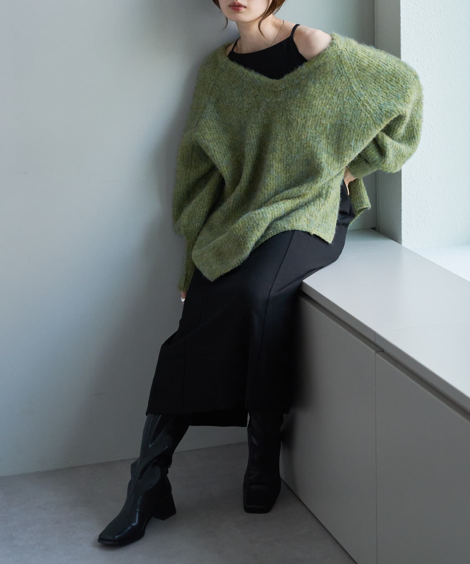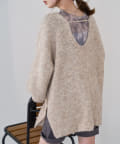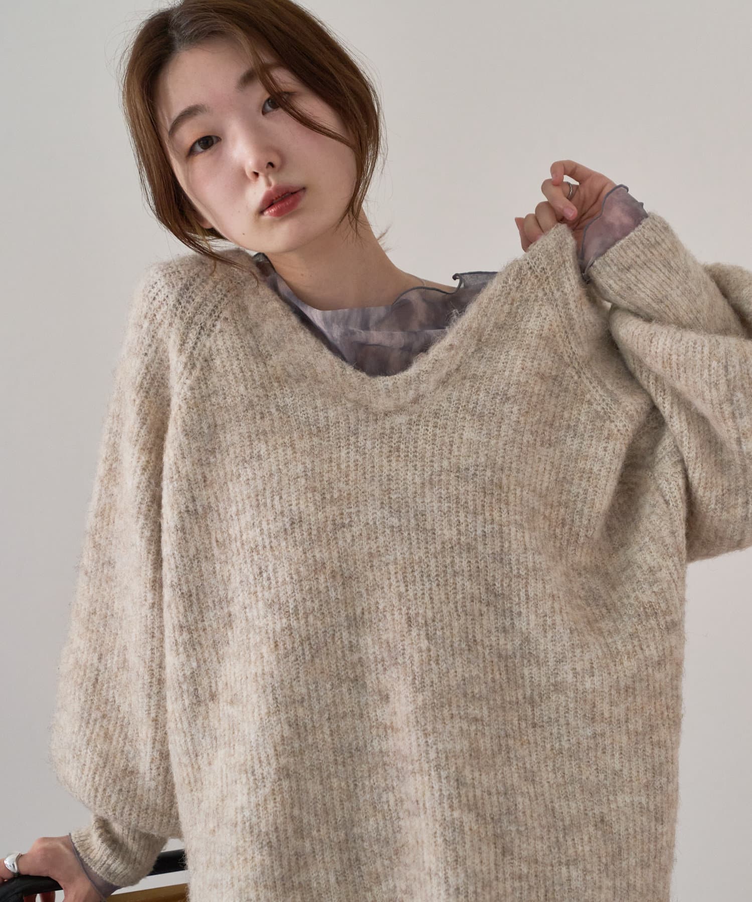 Vネックと背中開いたデザインが今までになかったデザイン性のあるローゲージニットです。