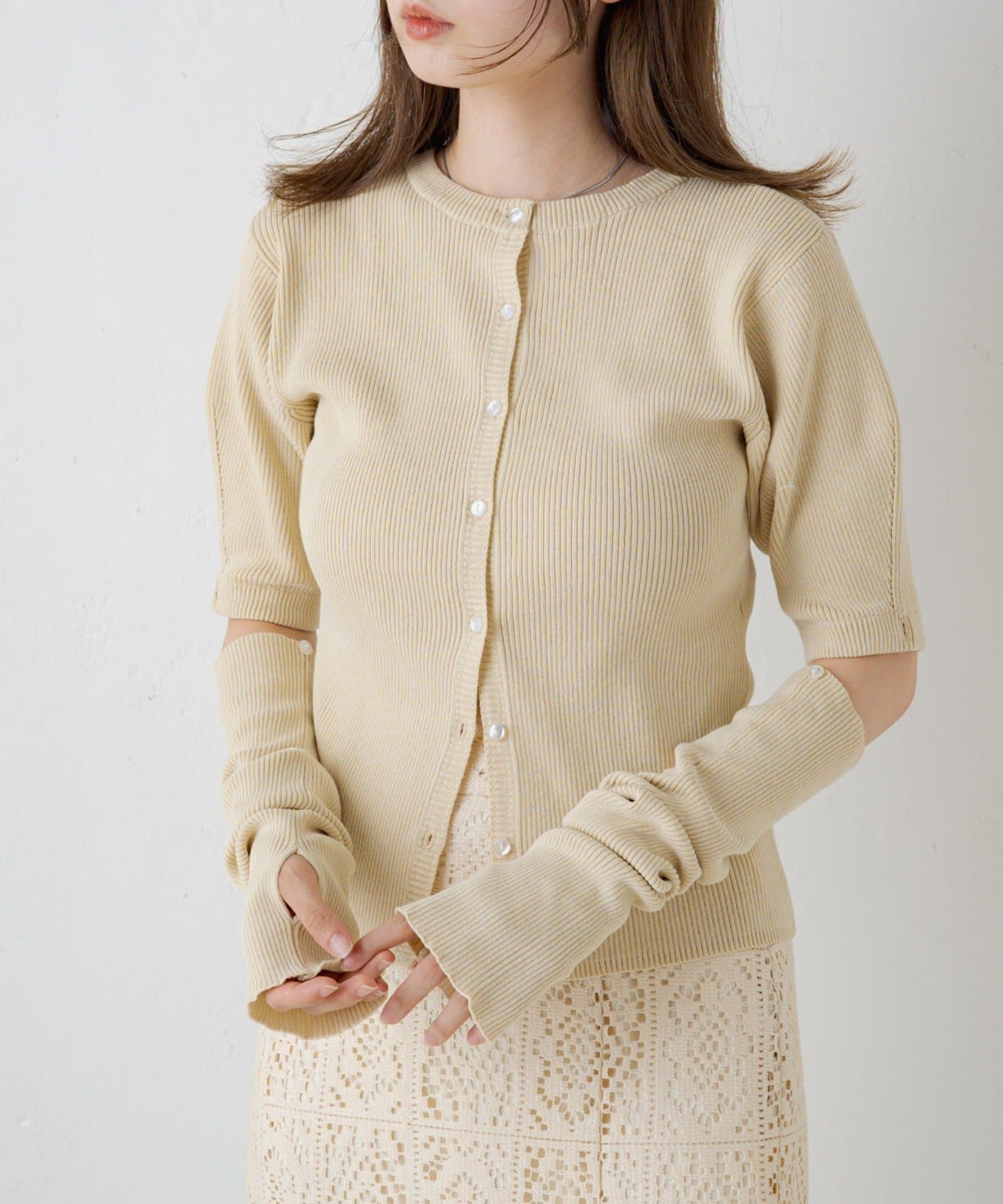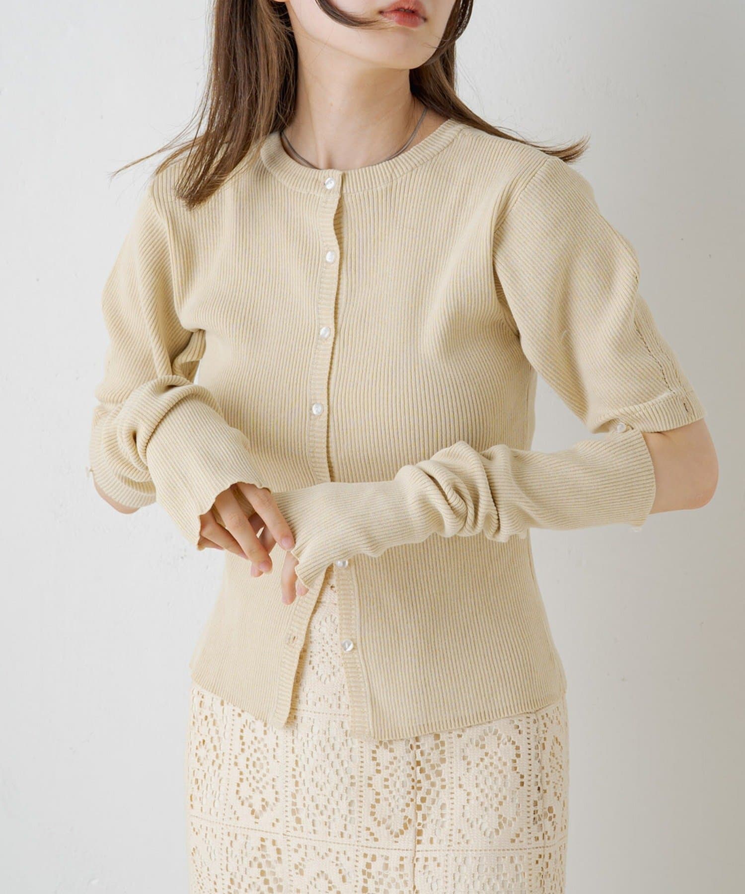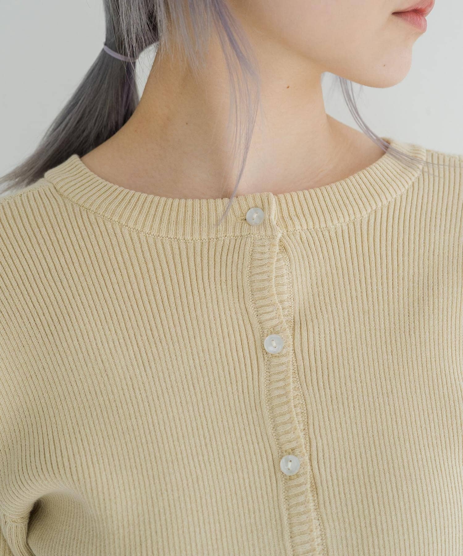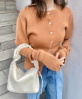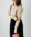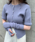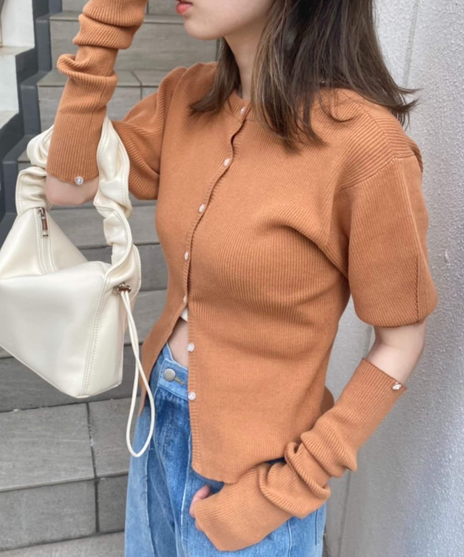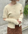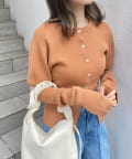 前開きのニットはボタンを開けて羽織りとしても、程よく肌見せをしても可愛い一枚です。