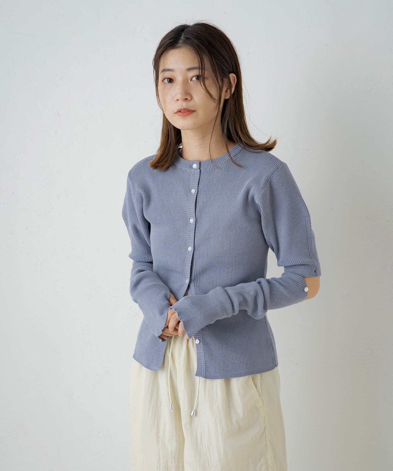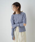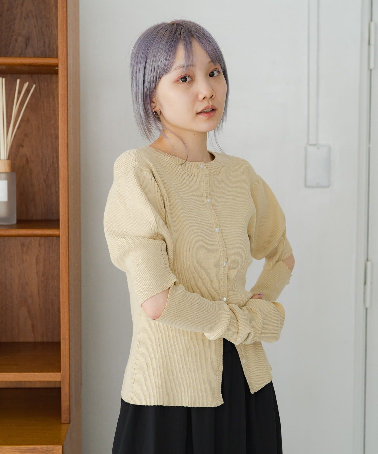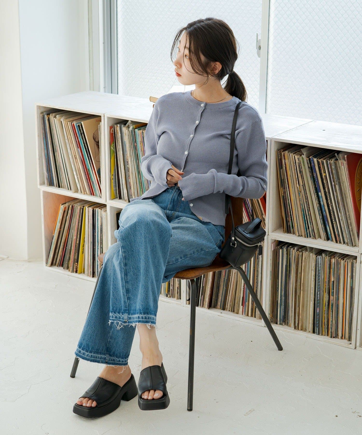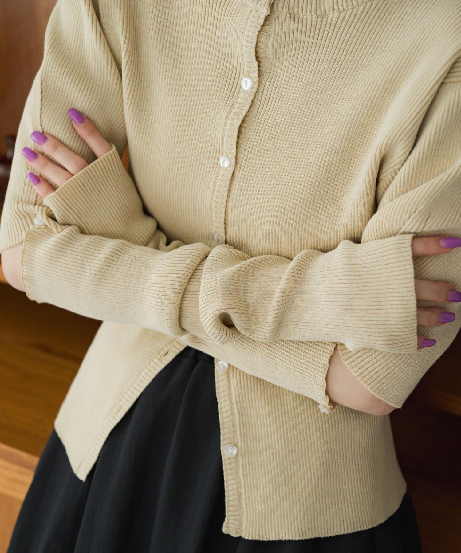 前開きのニットはボタンを開けて羽織りとしても、程よく肌見せをしても可愛い一枚です。
