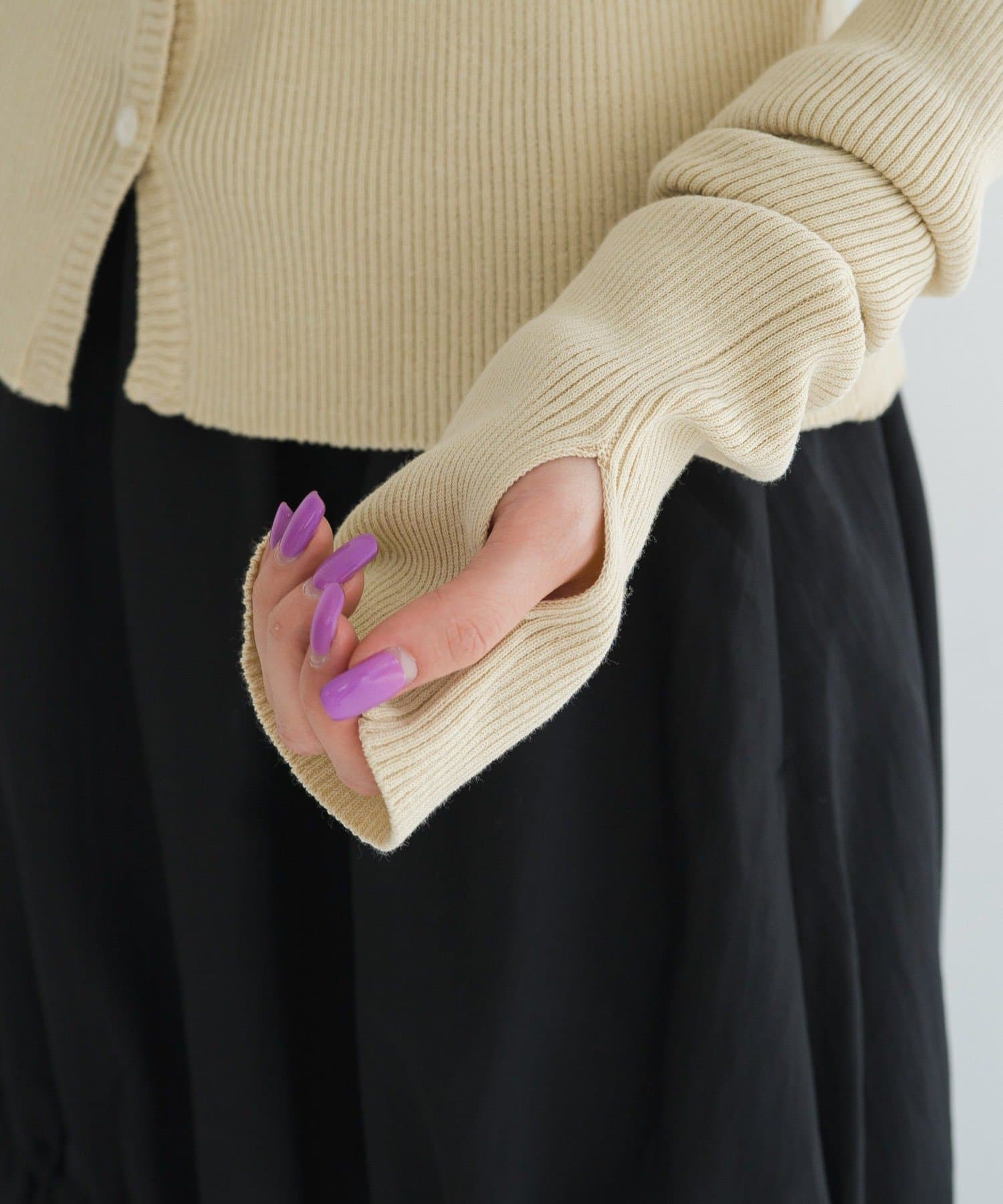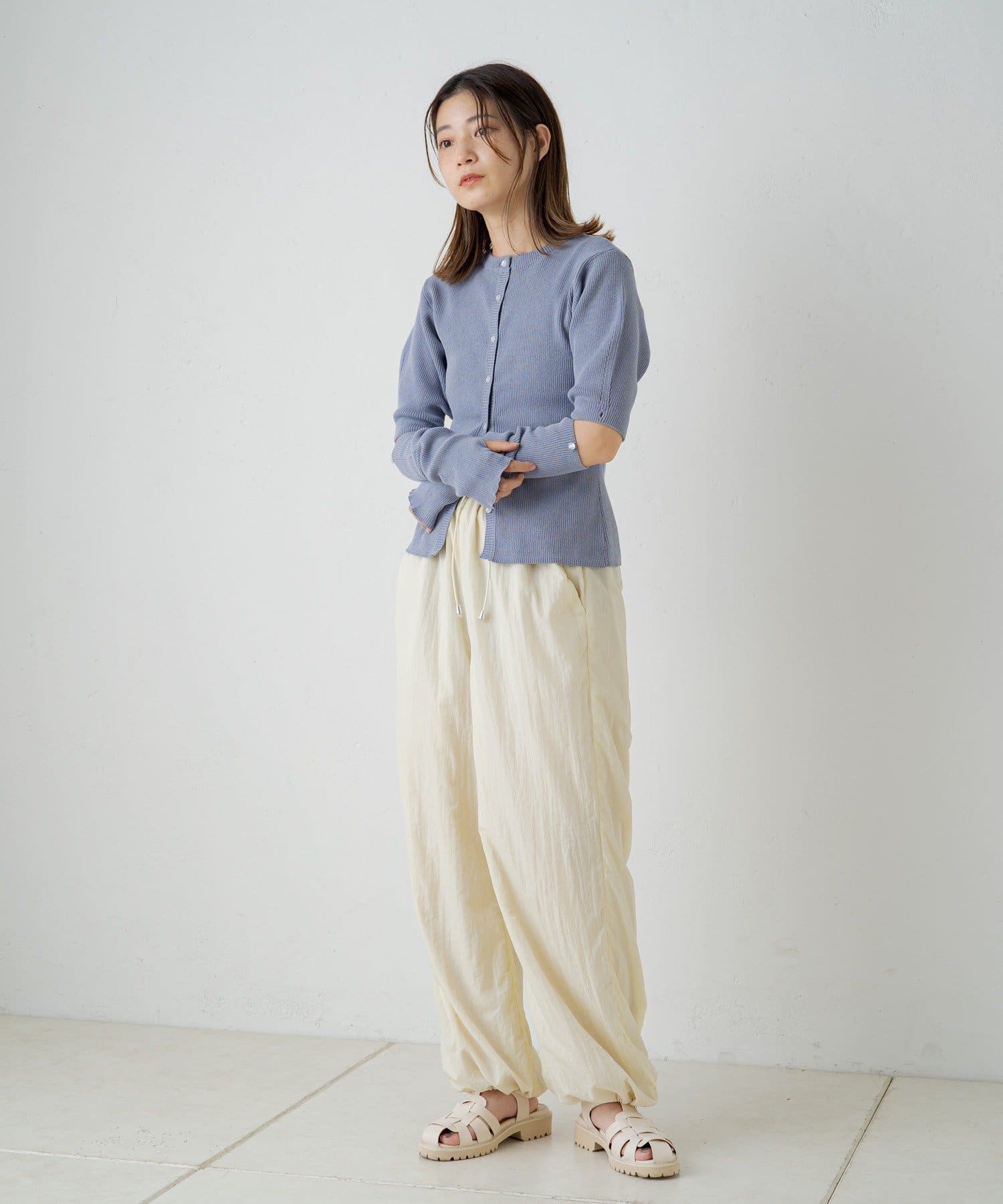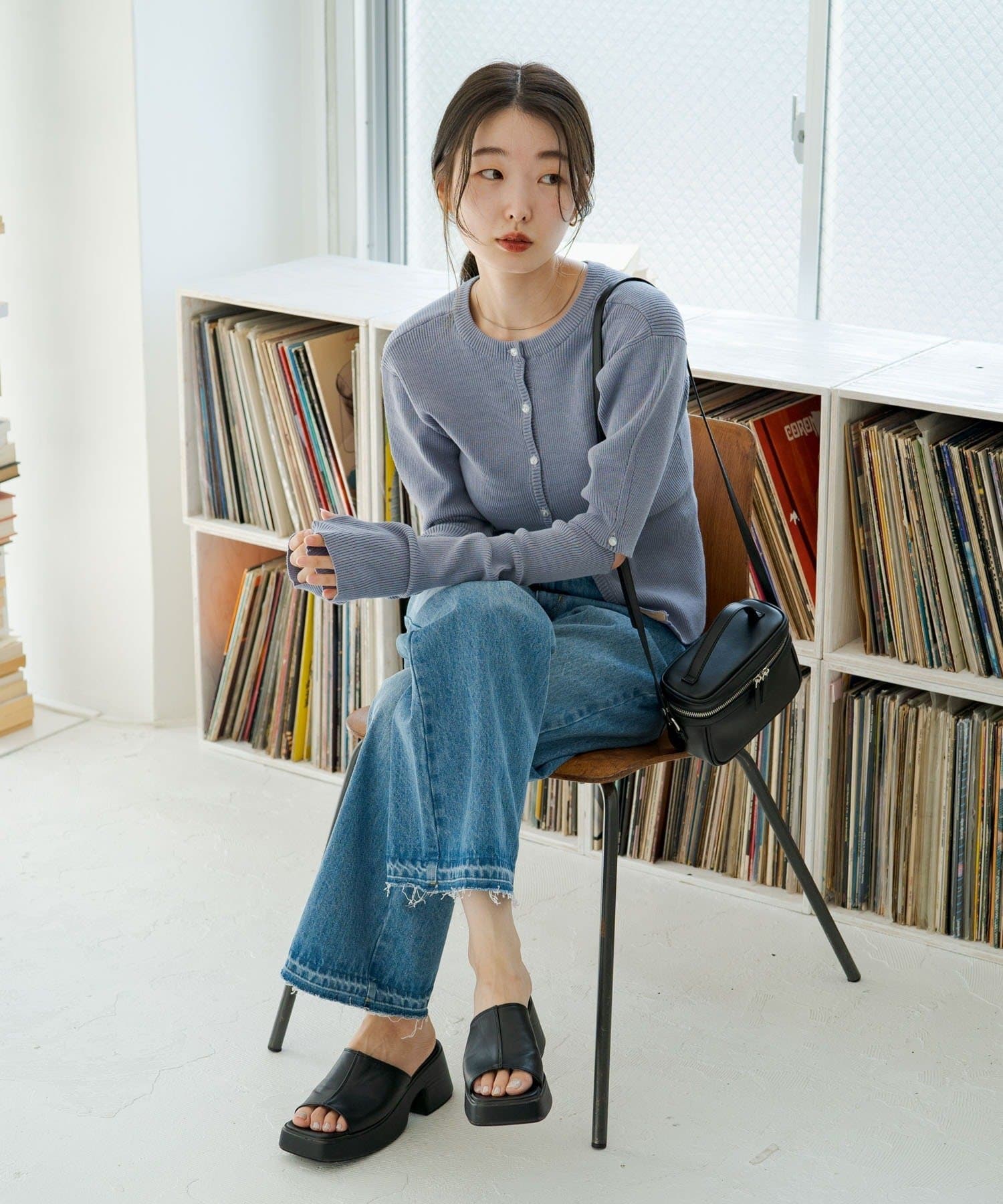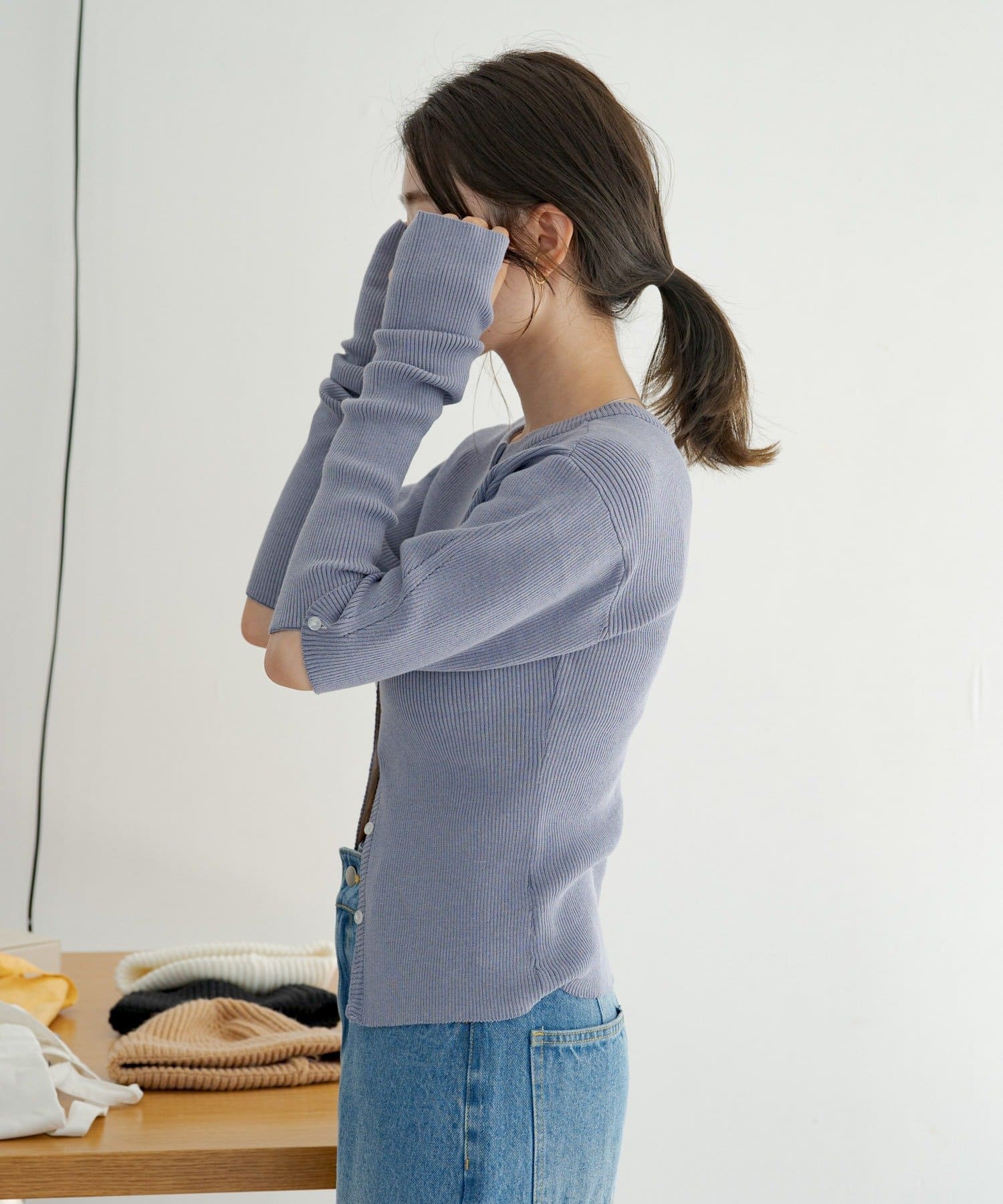 前開きのニットはボタンを開けて羽織りとしても、程よく肌見せをしても可愛い一枚です。