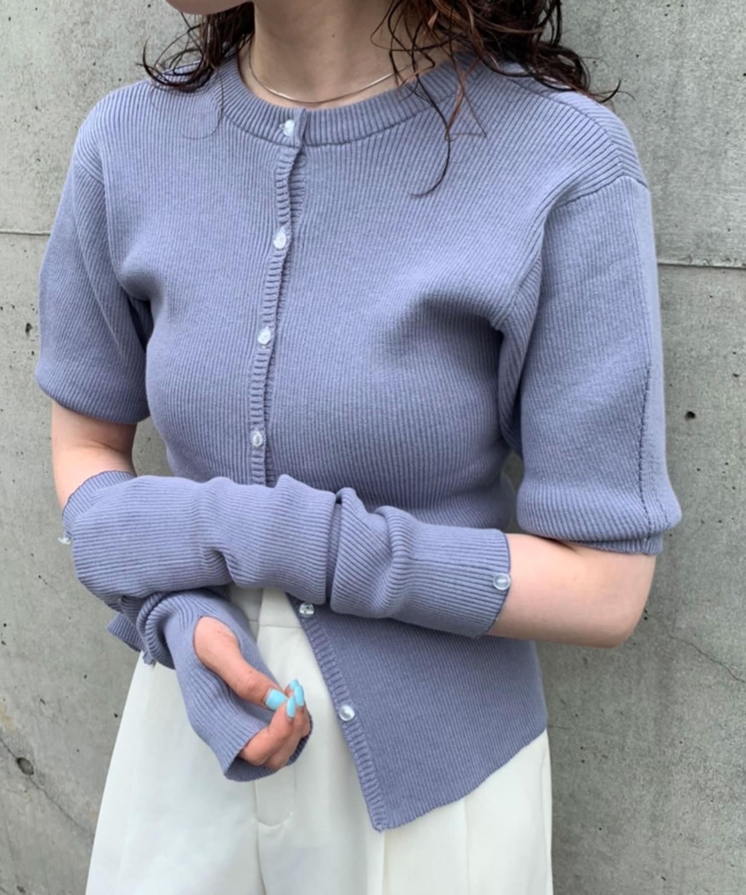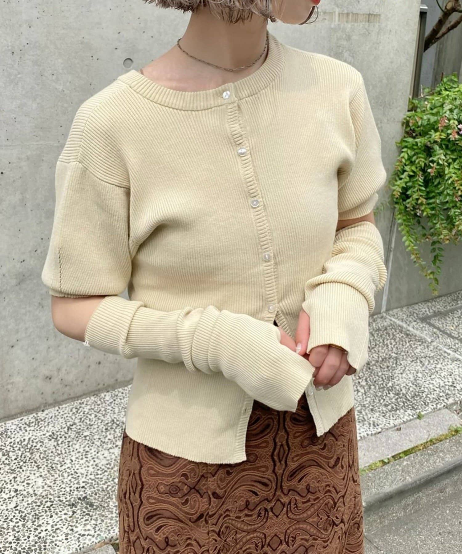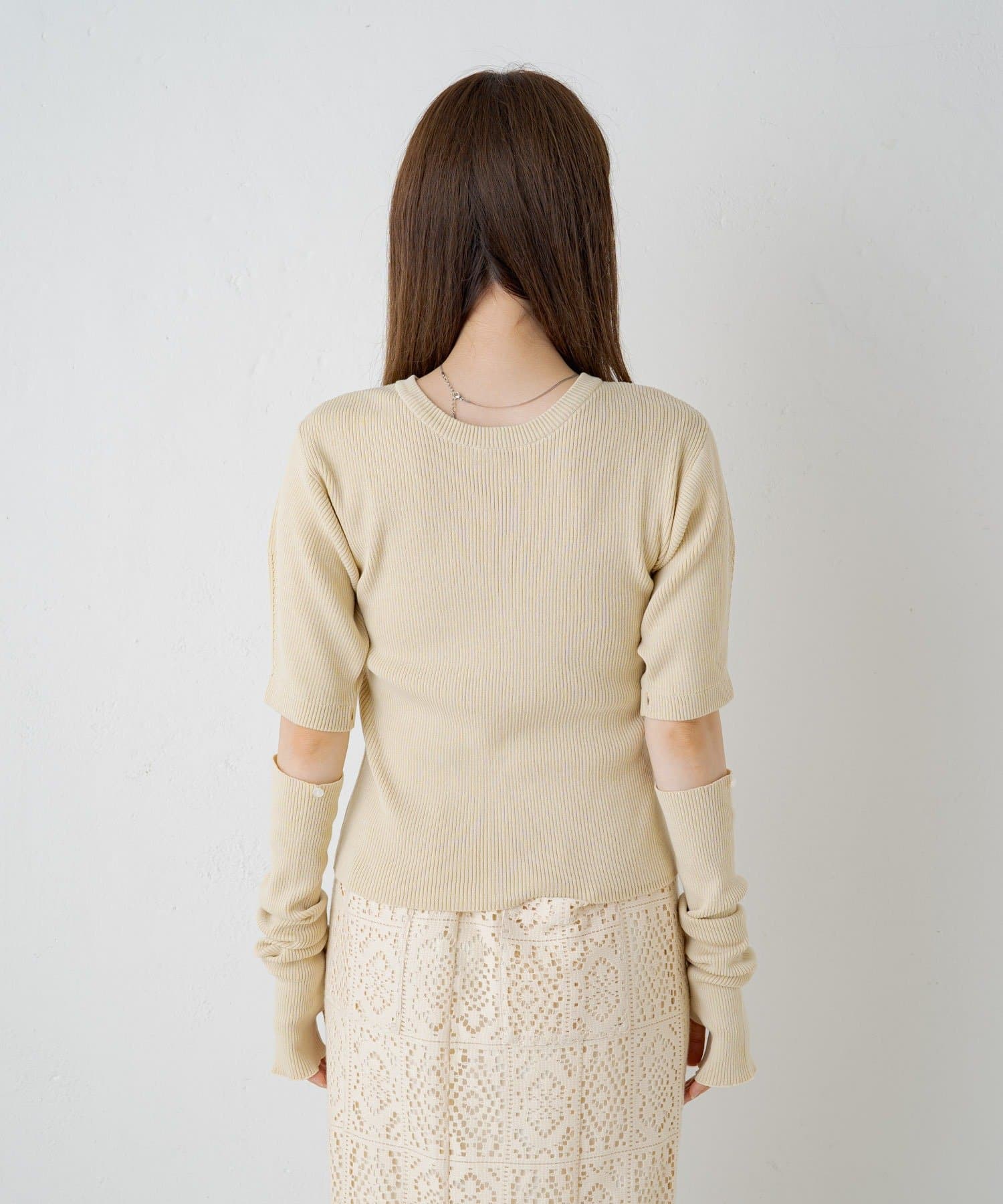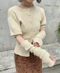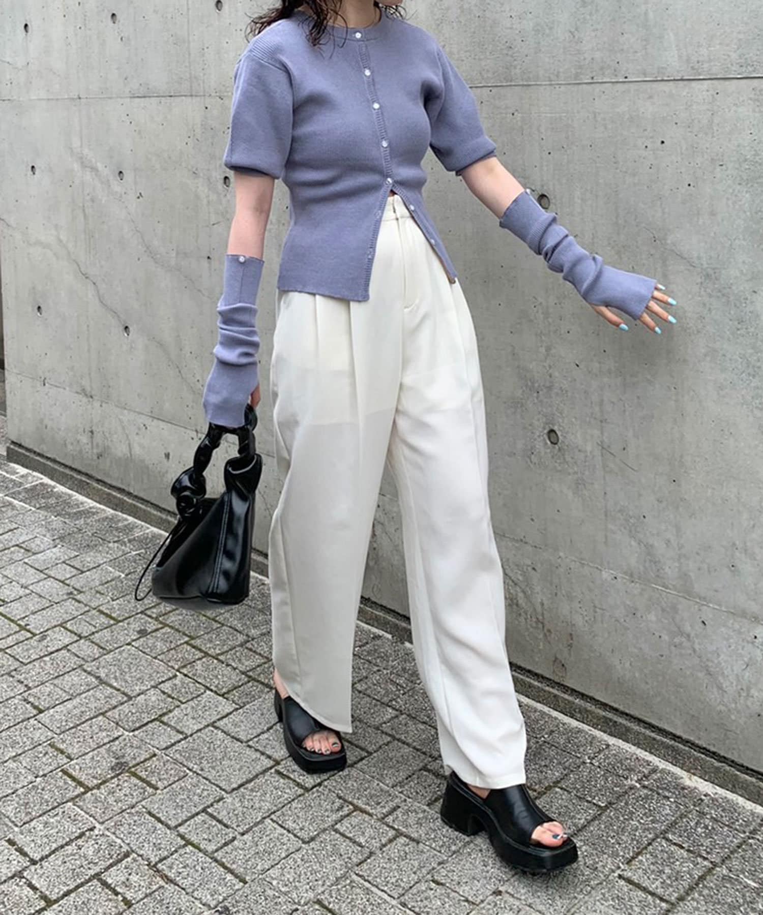 ベーシックな半袖のさらっとしたニットと、ロングウォーマーのトップスのセットアイテム。