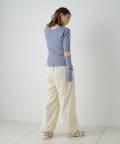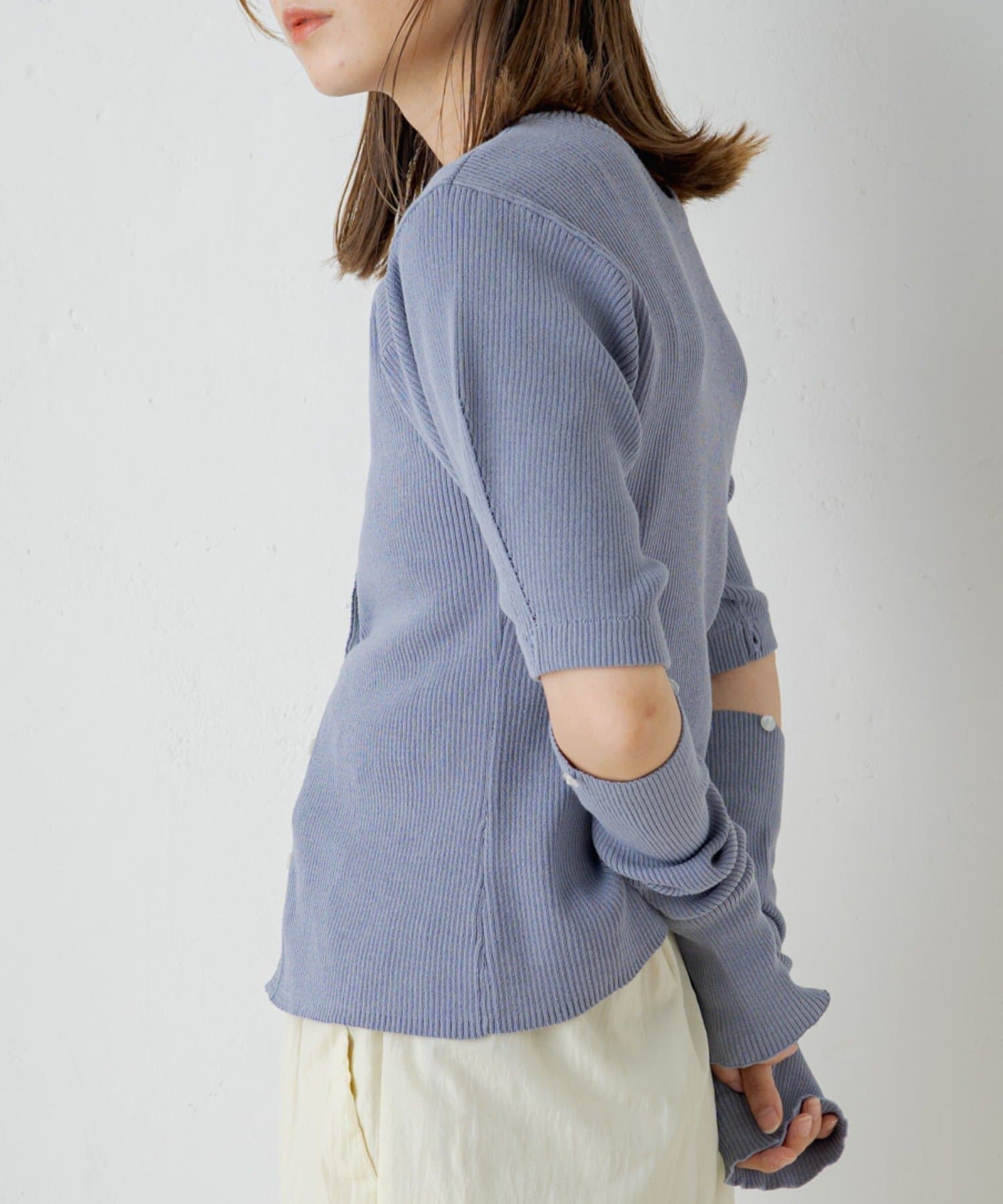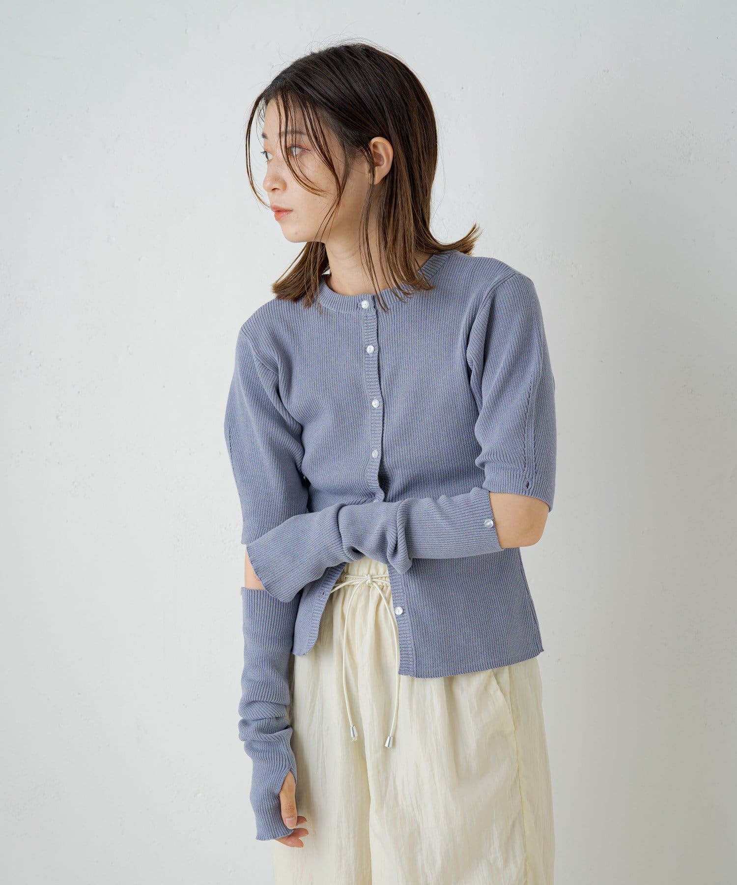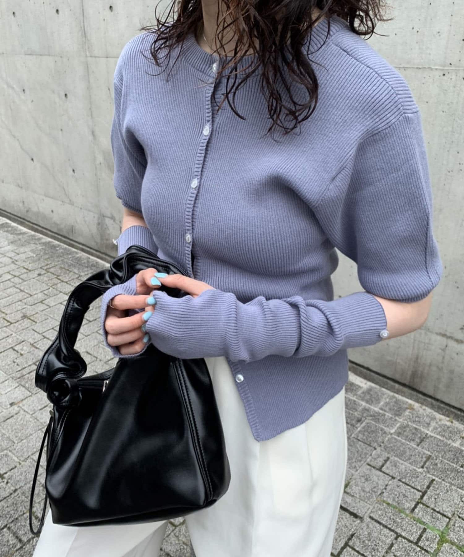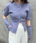 ベーシックな半袖のさらっとしたニットと、ロングウォーマーのトップスのセットアイテム。