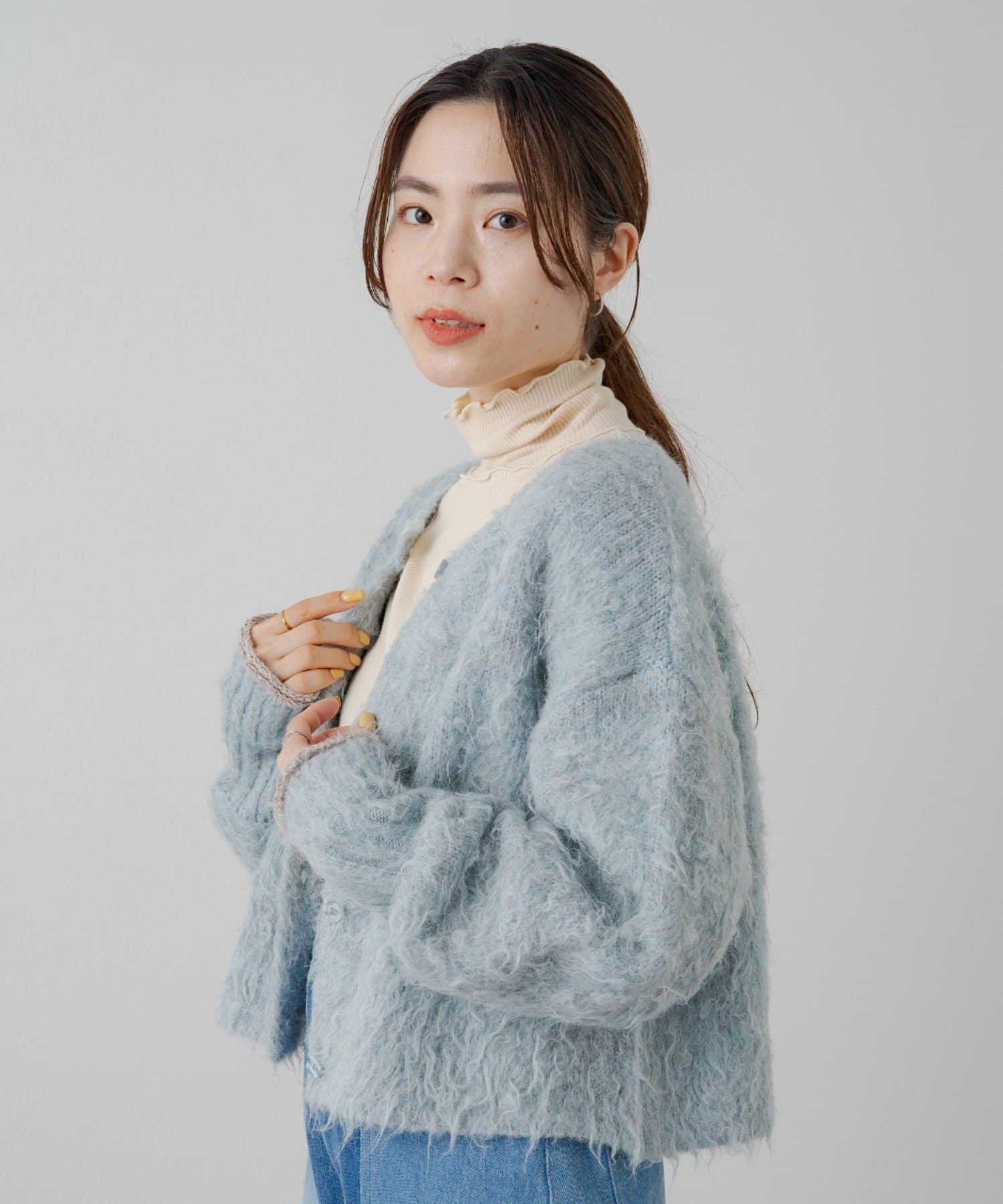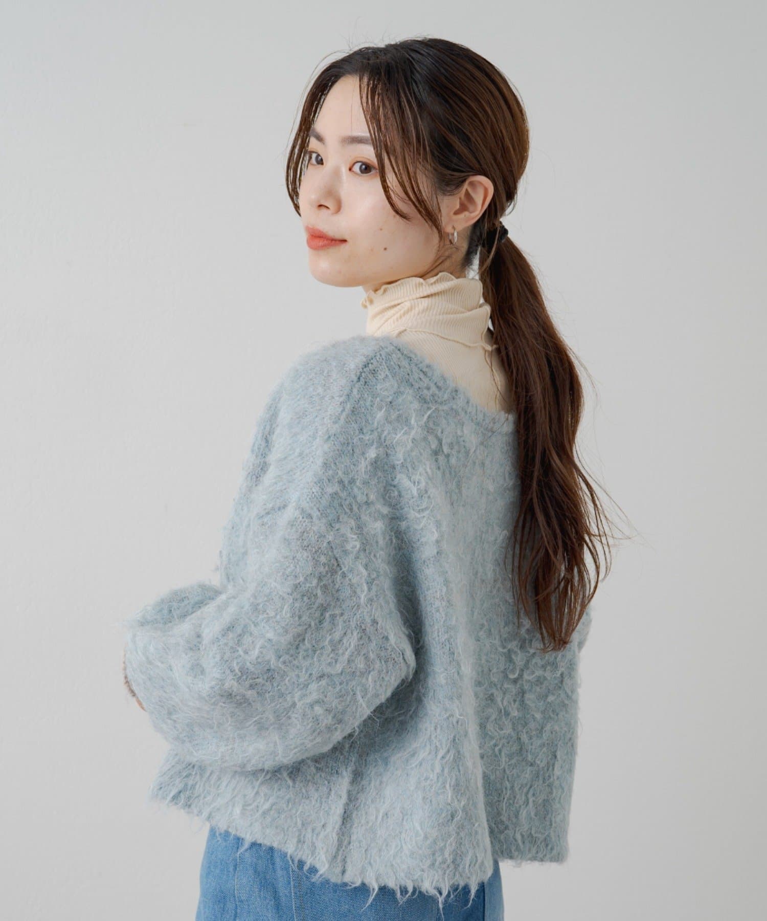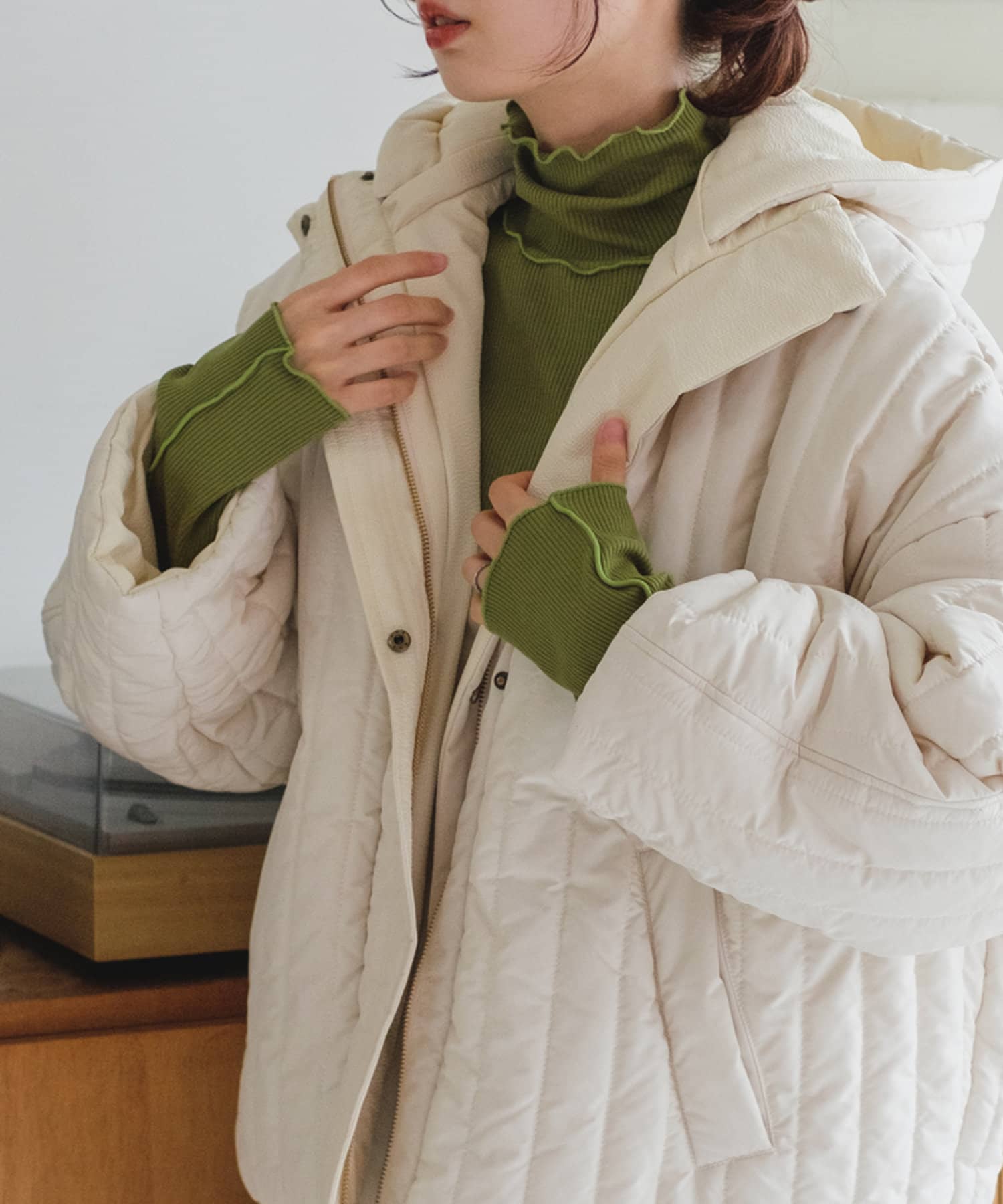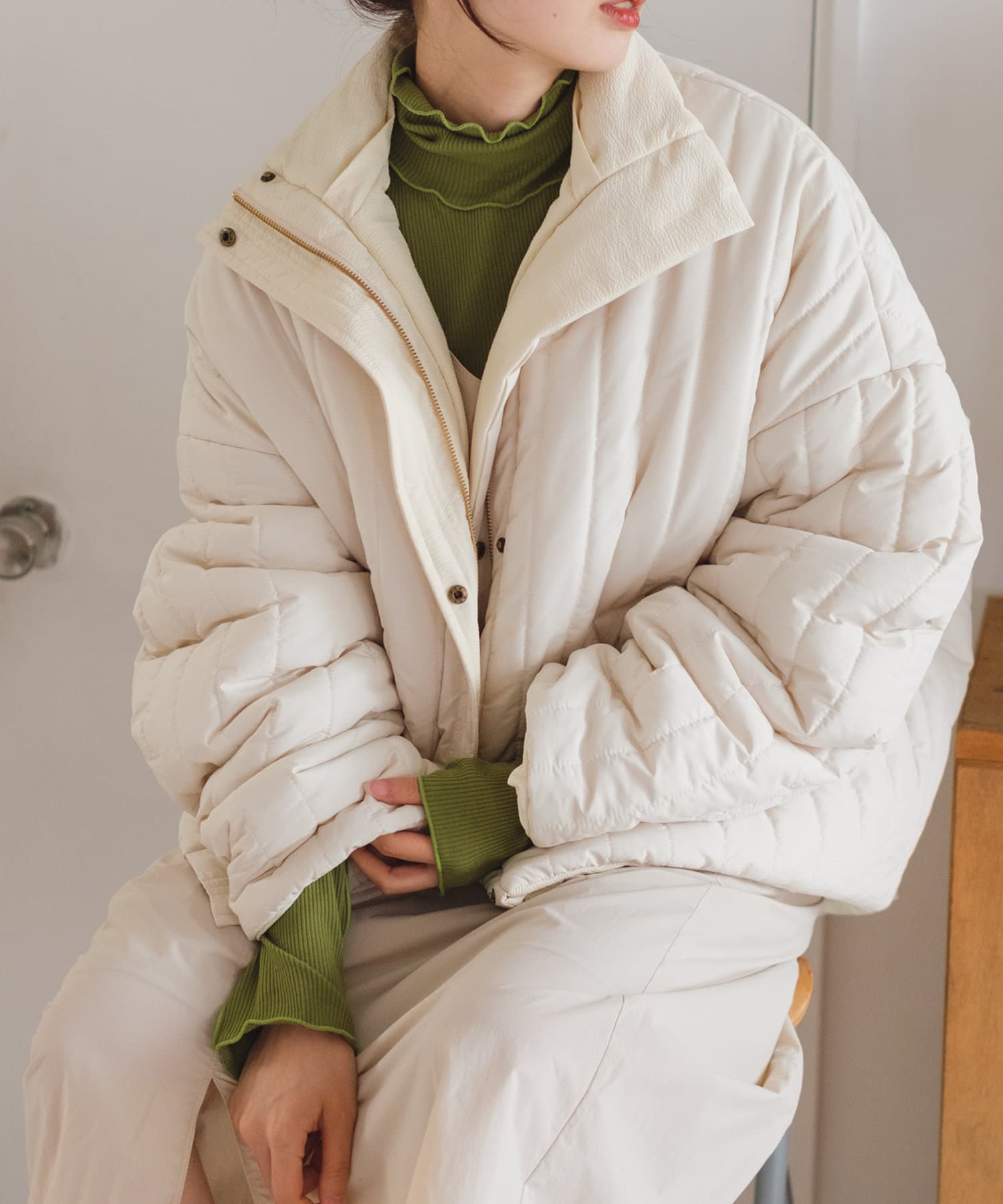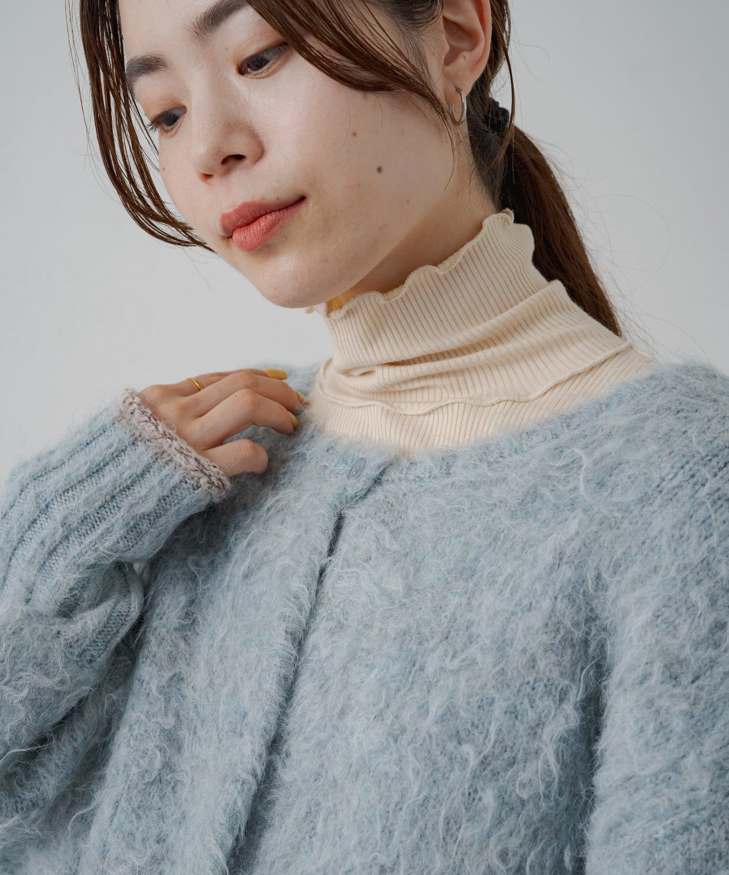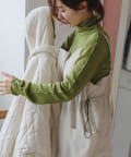 ハイネックの首が窮屈な感じが苦手な方にもおすすめの一着。