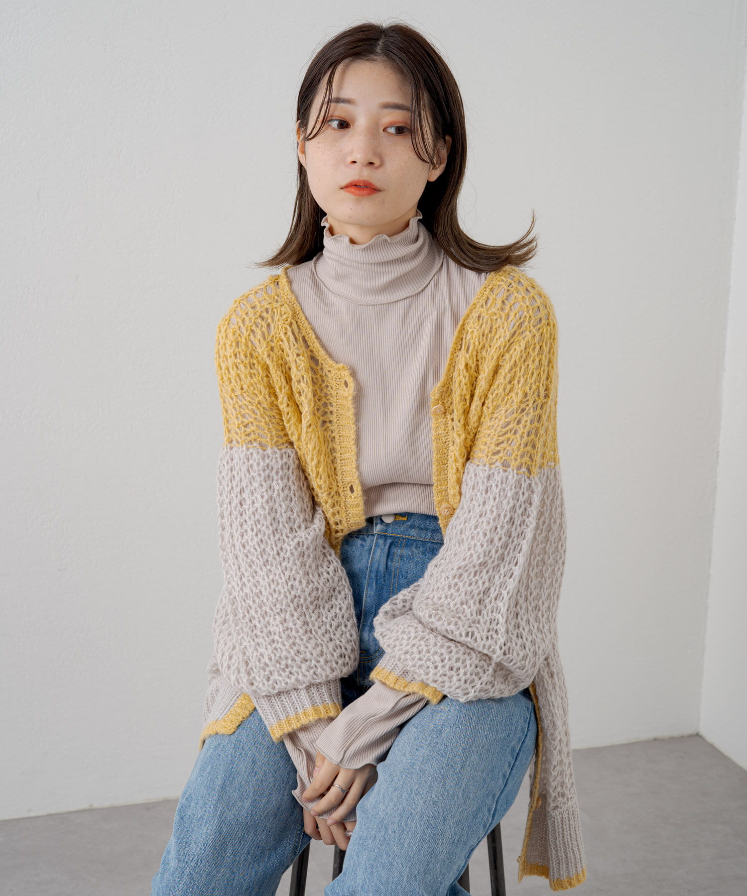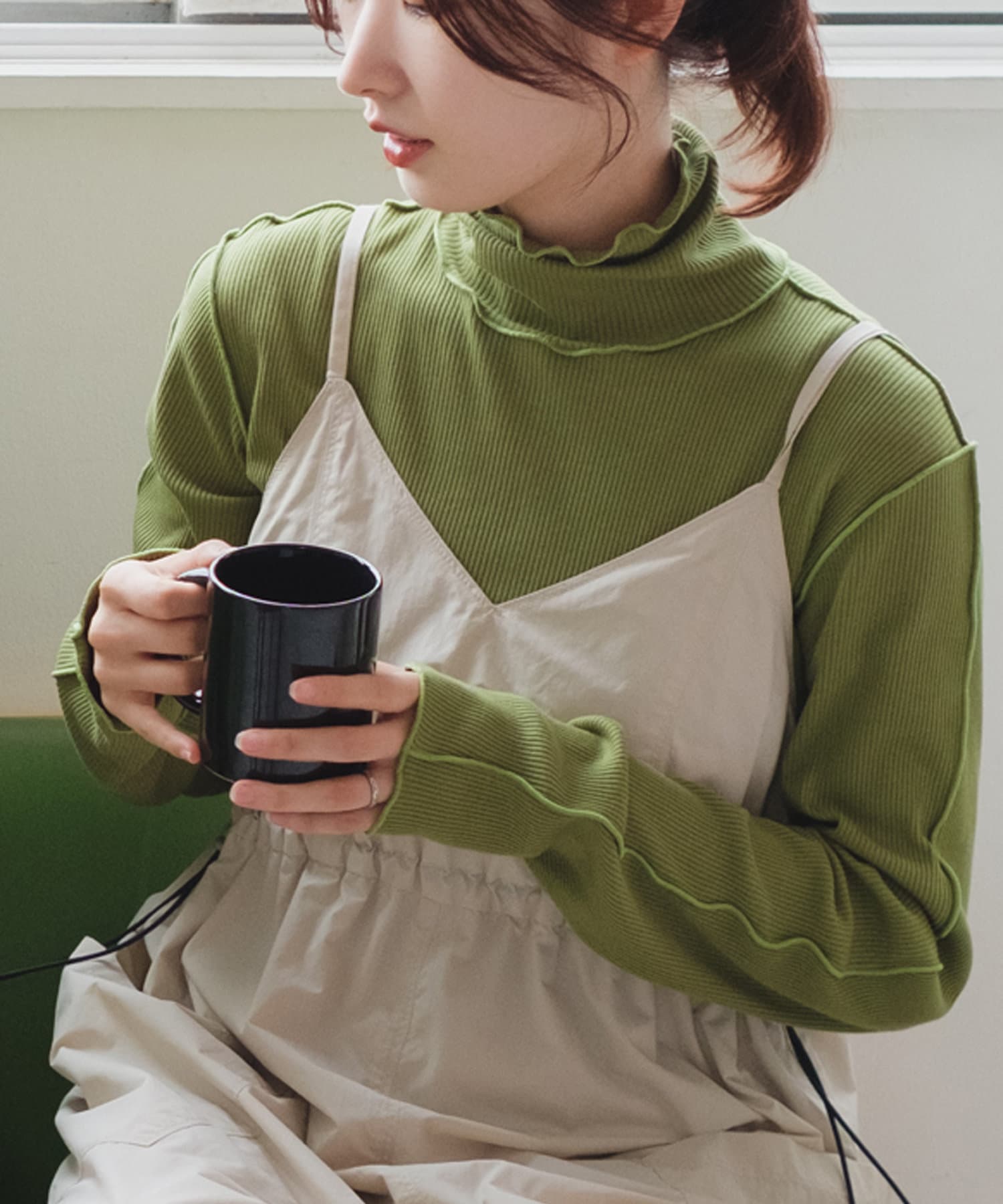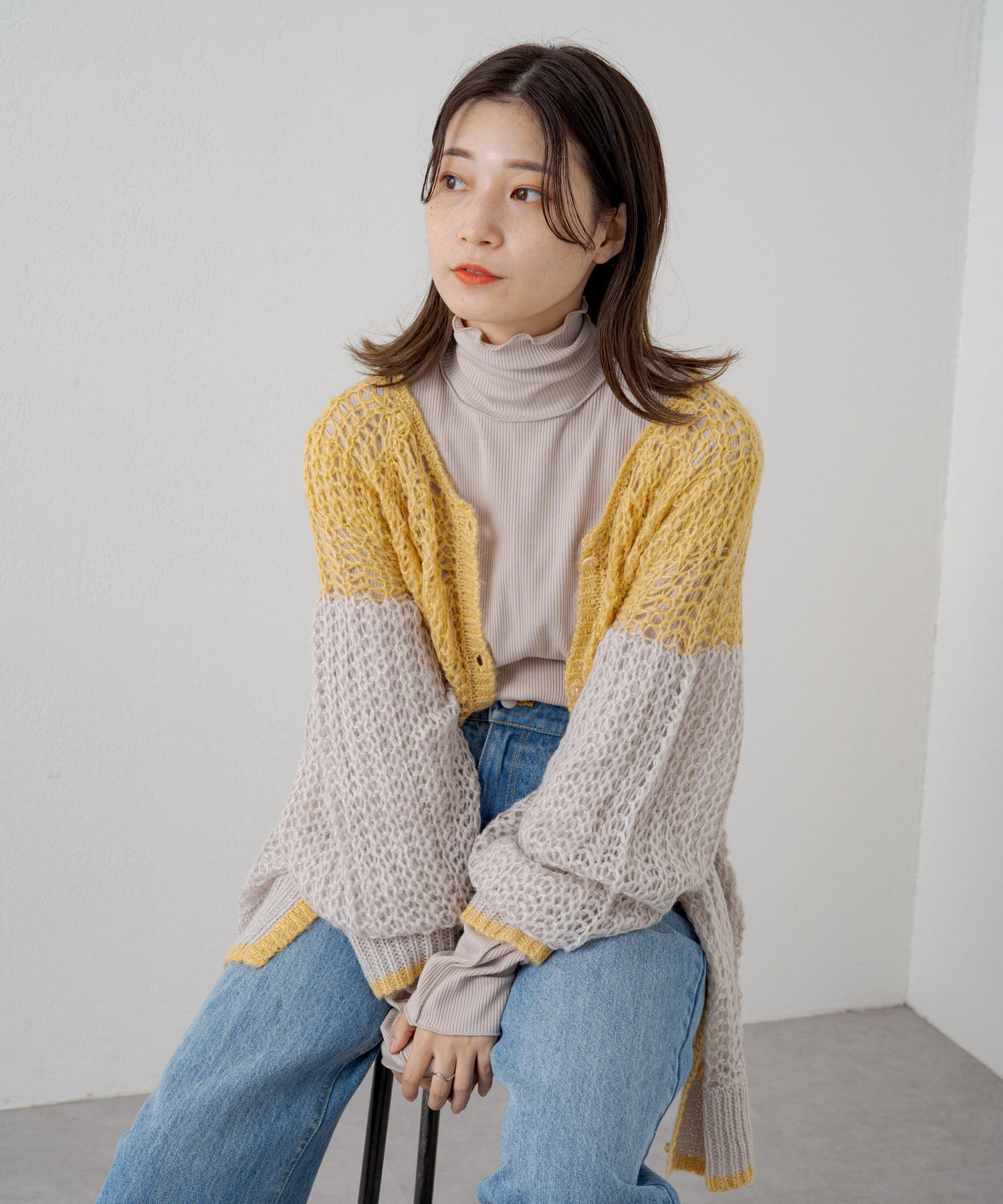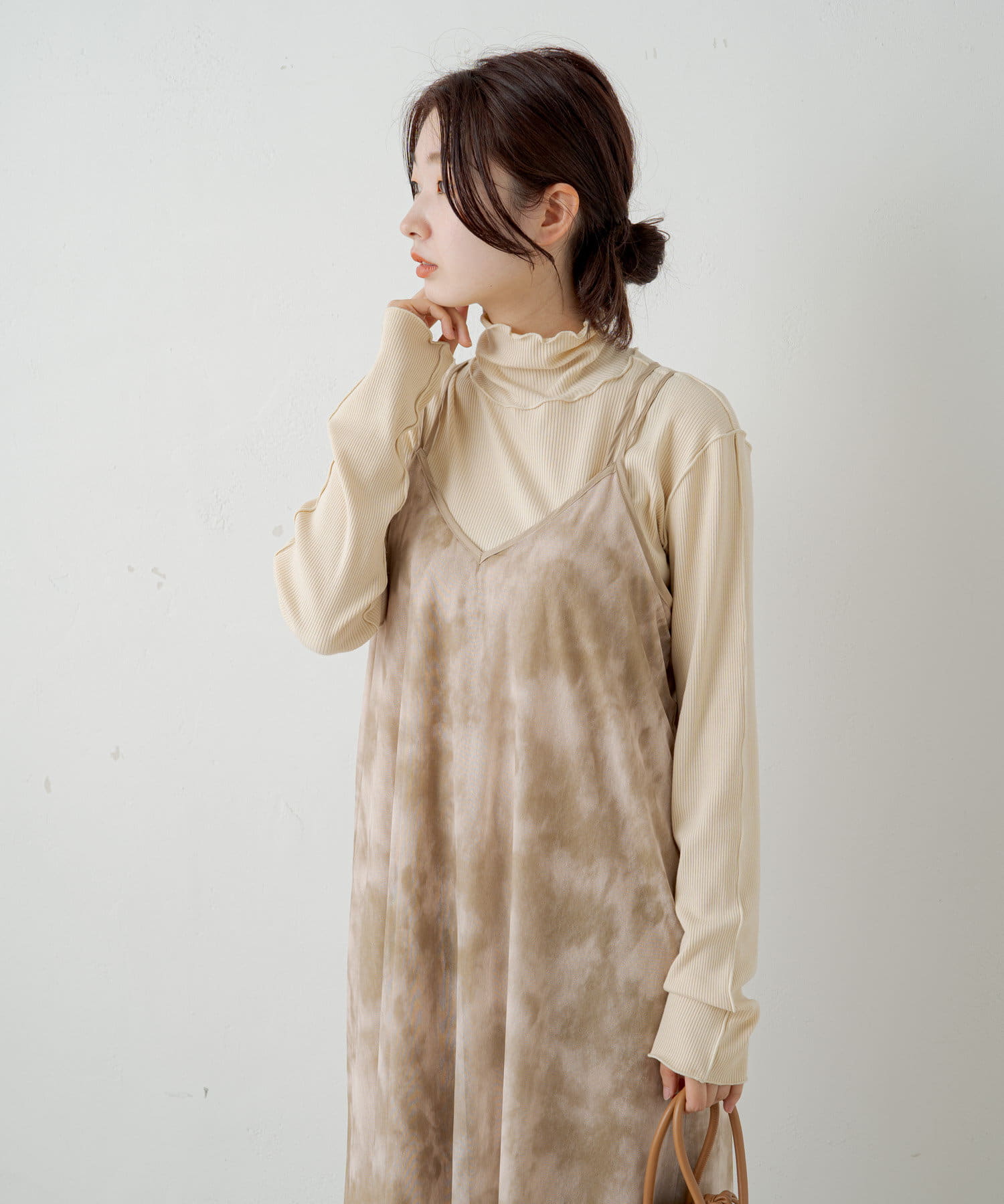 ハイネックを活かしてカーディガン、ニット、スウェット、ワンピースなどの