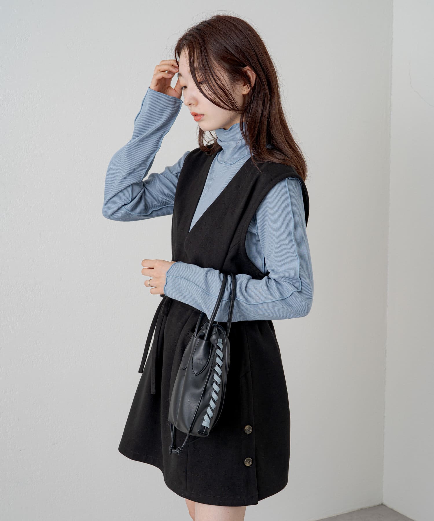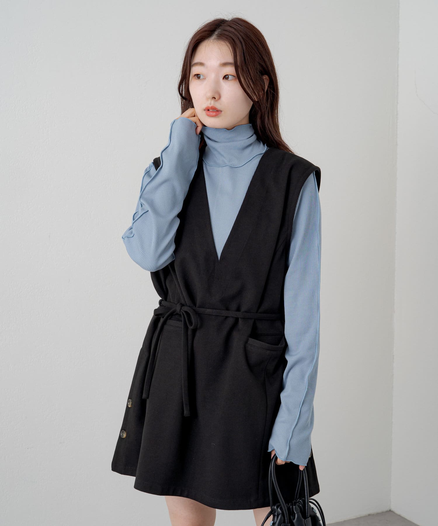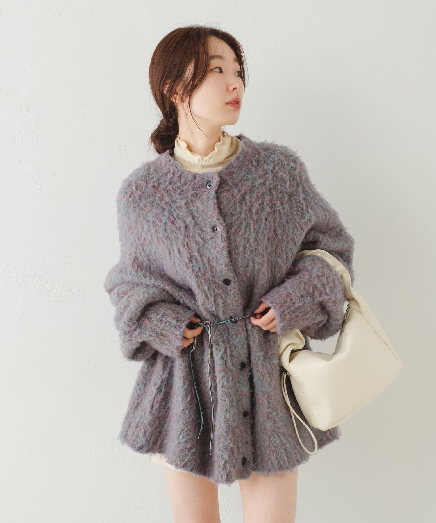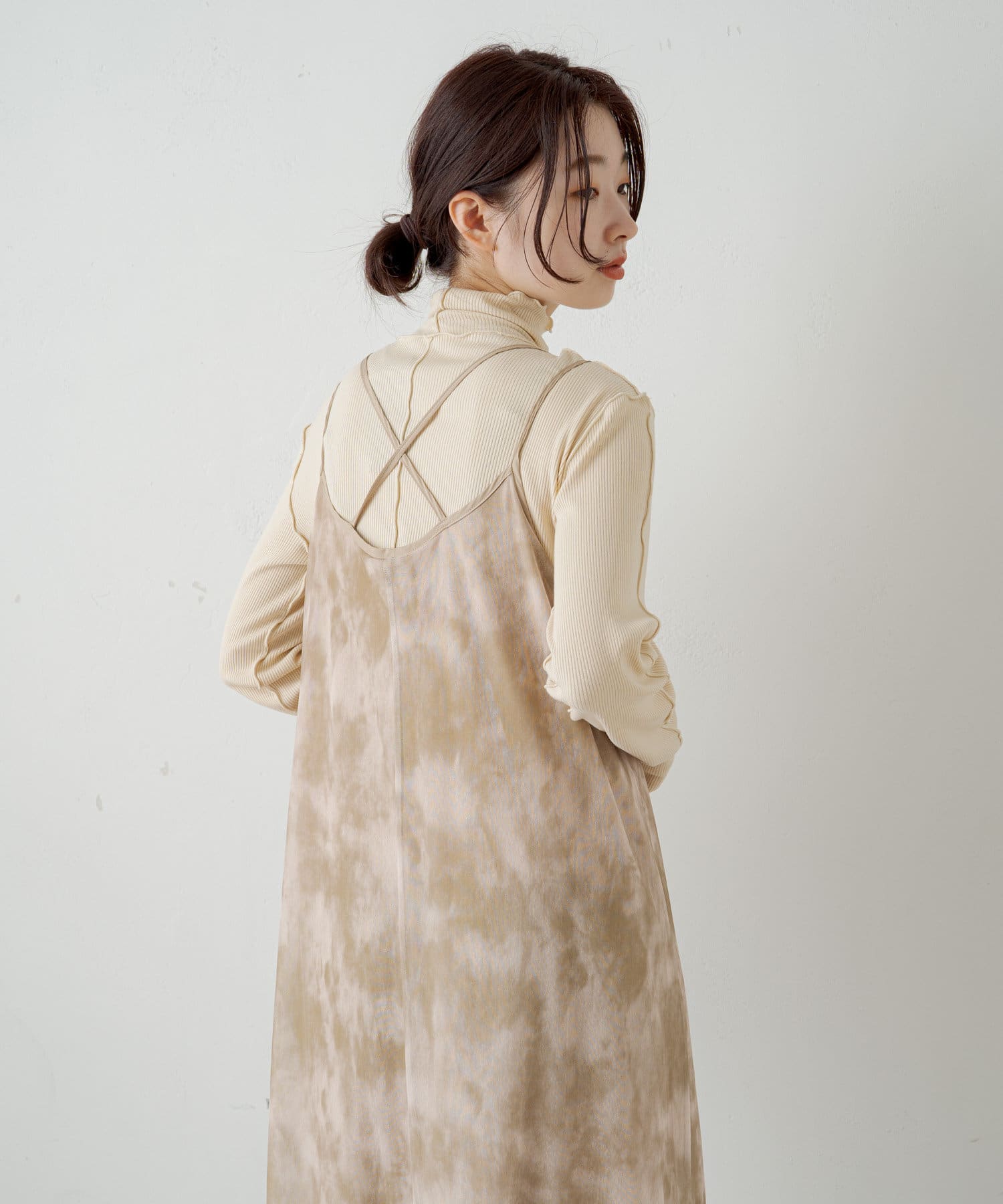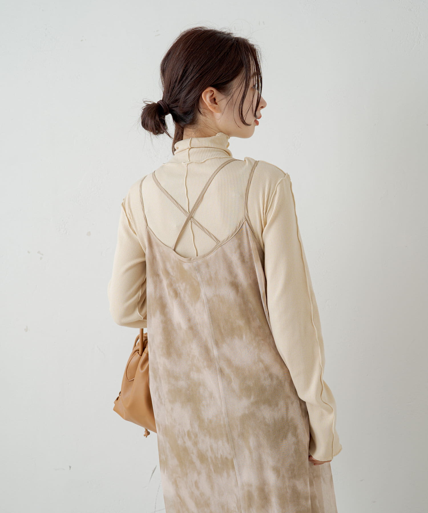 ハイネックを活かしてカーディガン、ニット、スウェット、ワンピースなどの