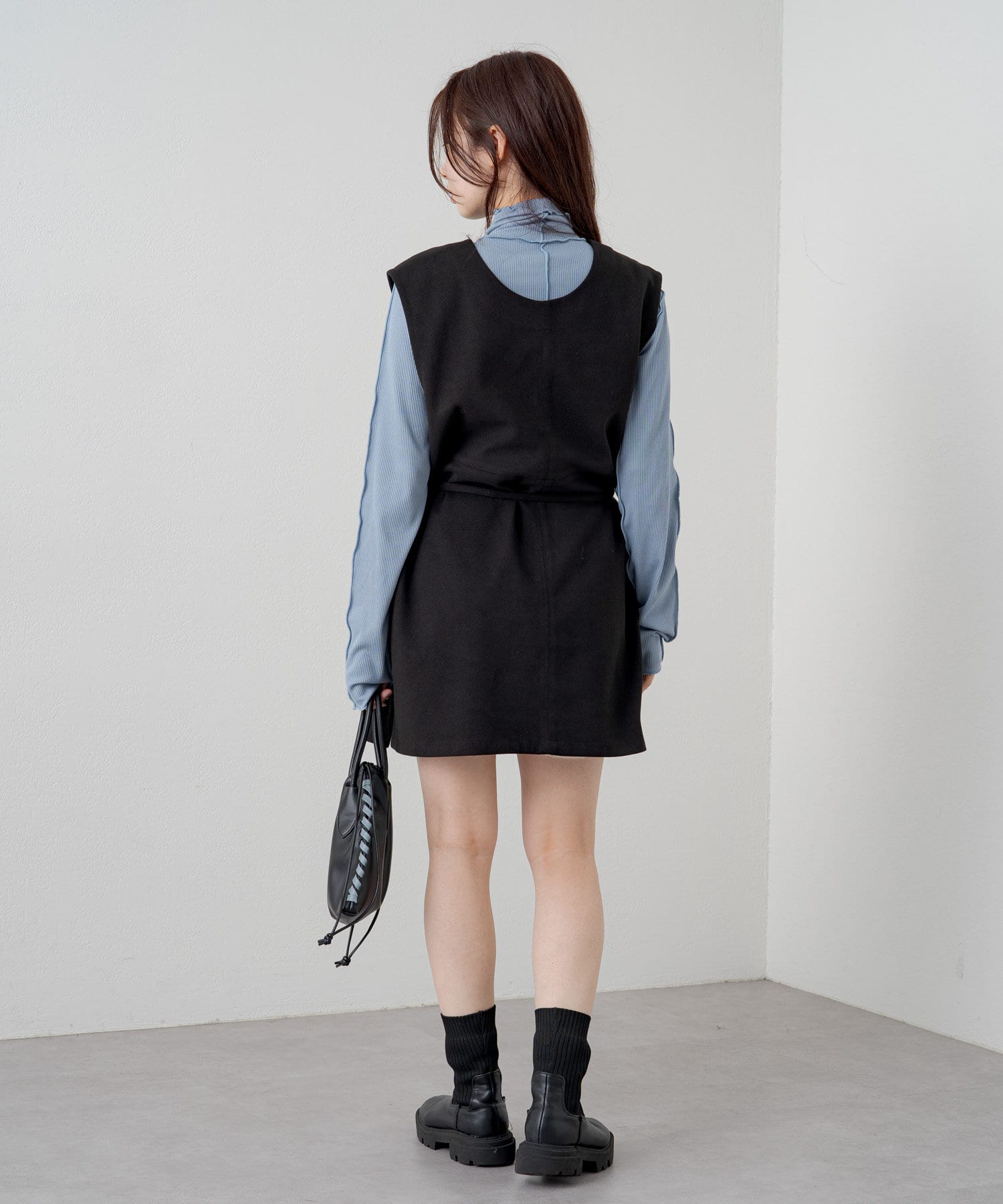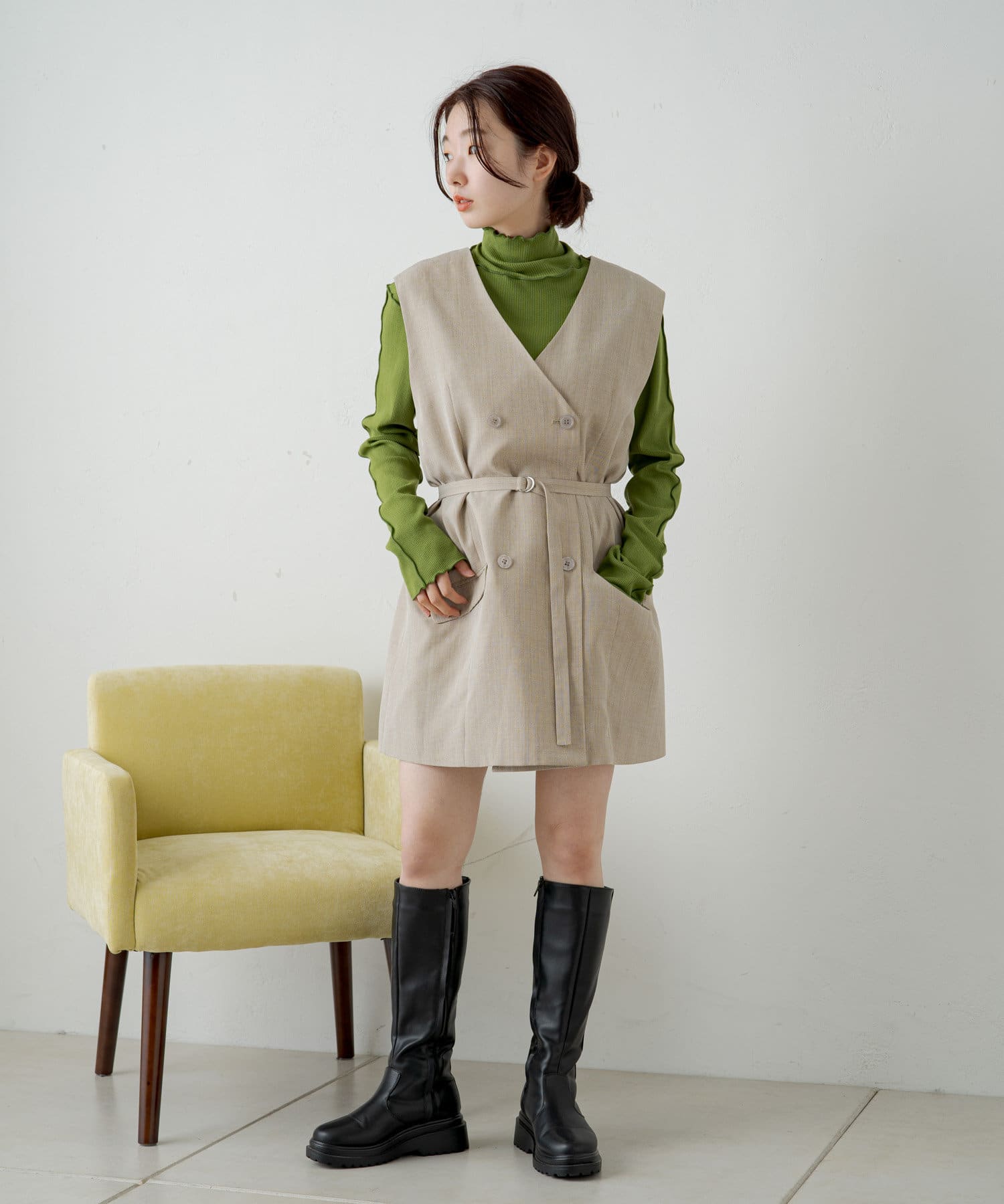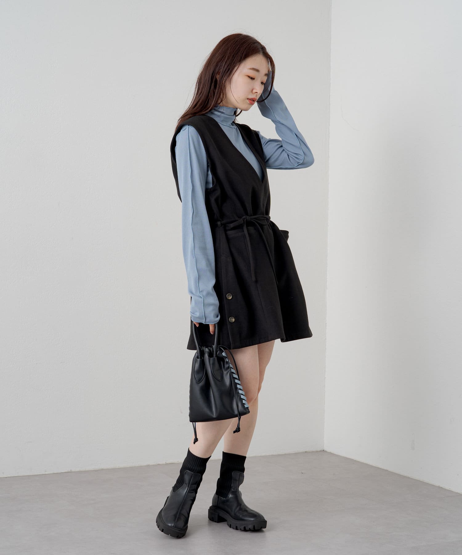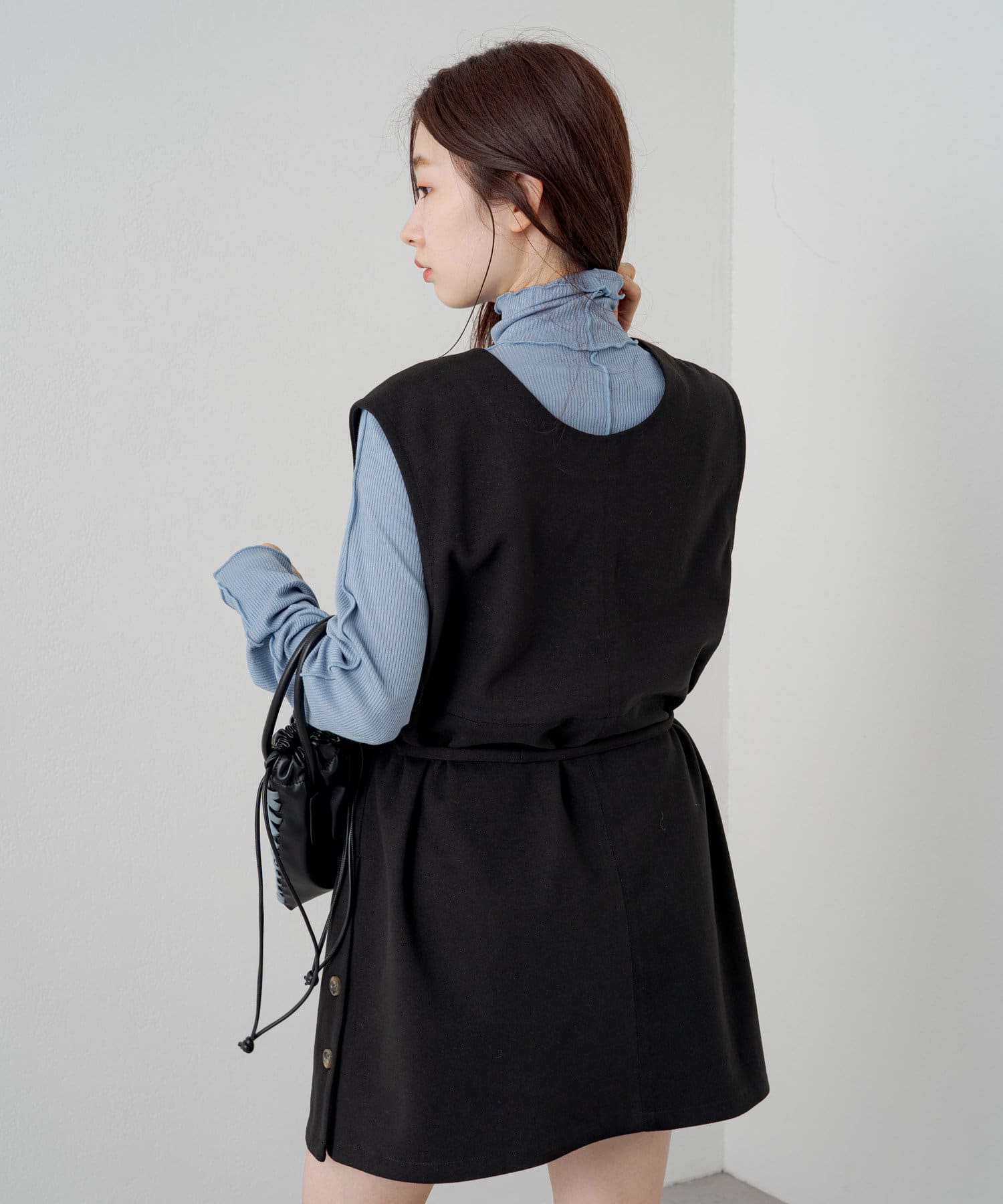 ハイネックを活かしてカーディガン、ニット、スウェット、ワンピースなどの