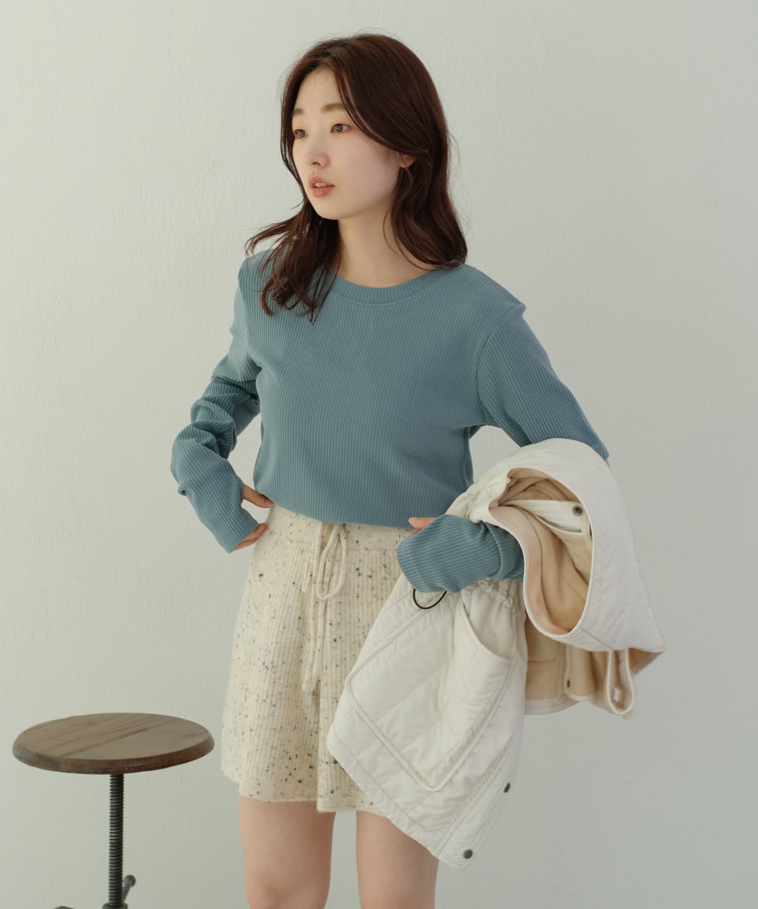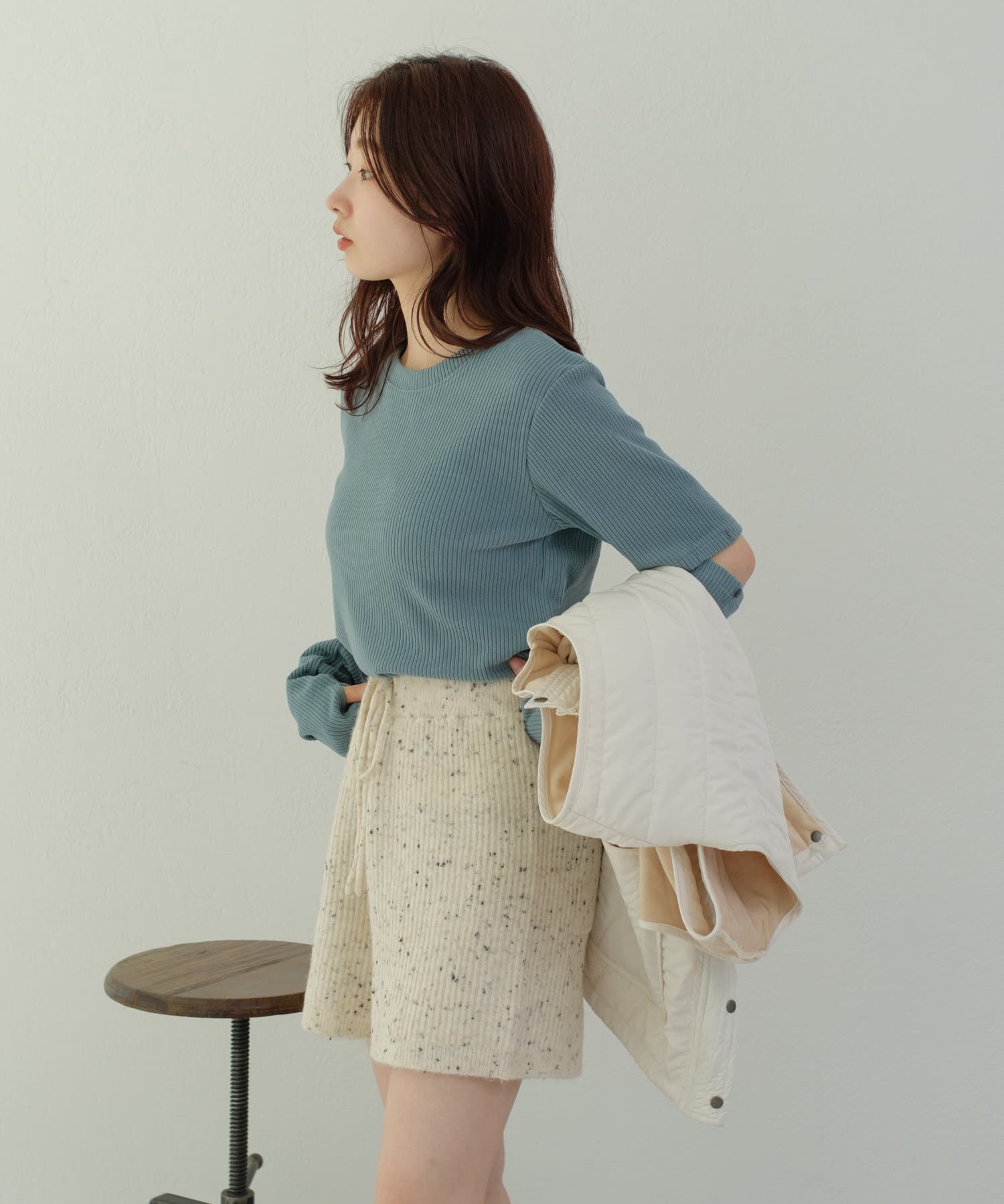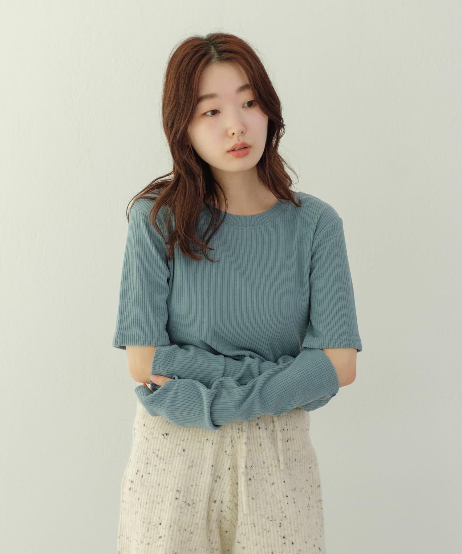 程よい光沢感が上品見えするリブトップス。