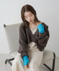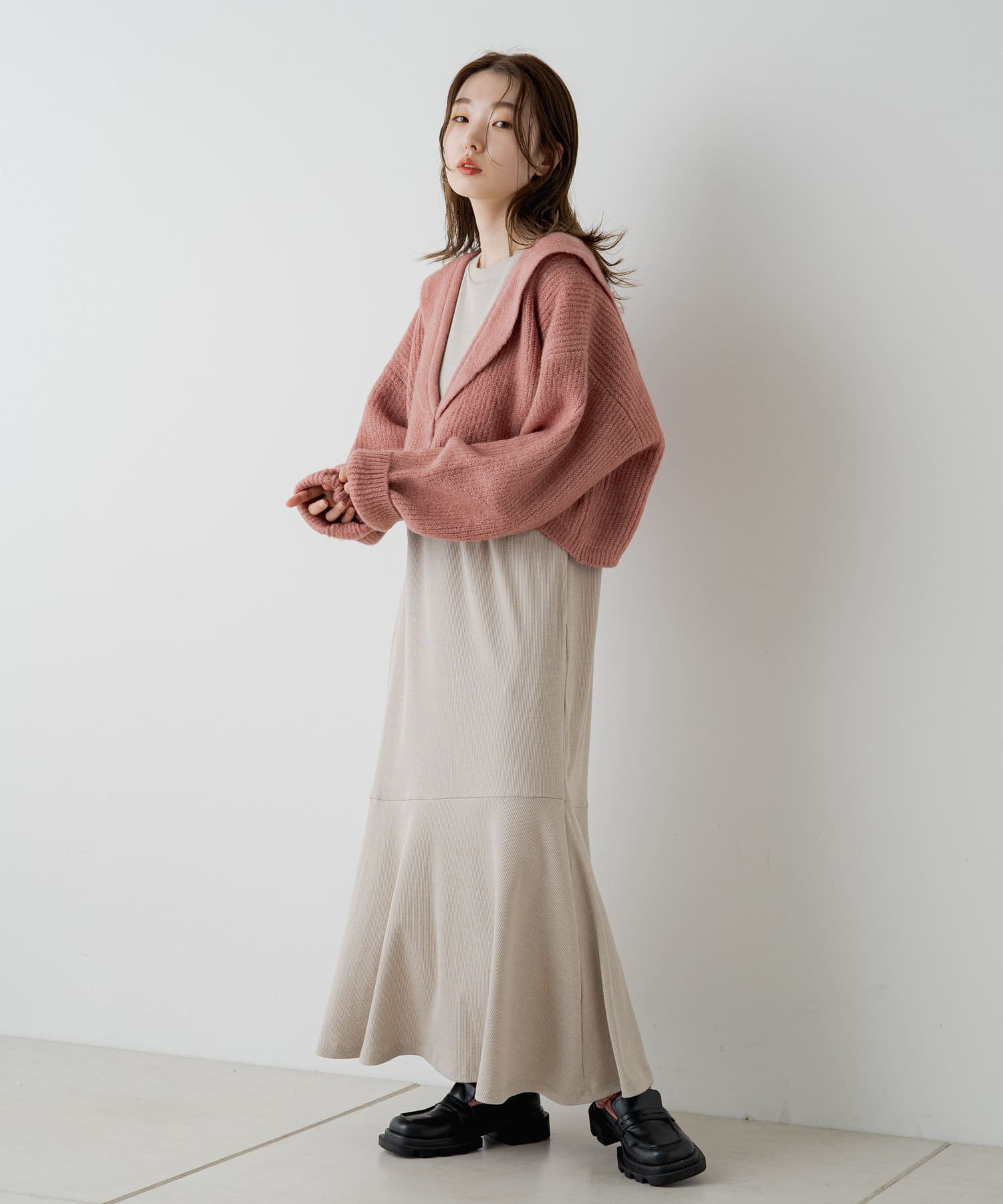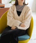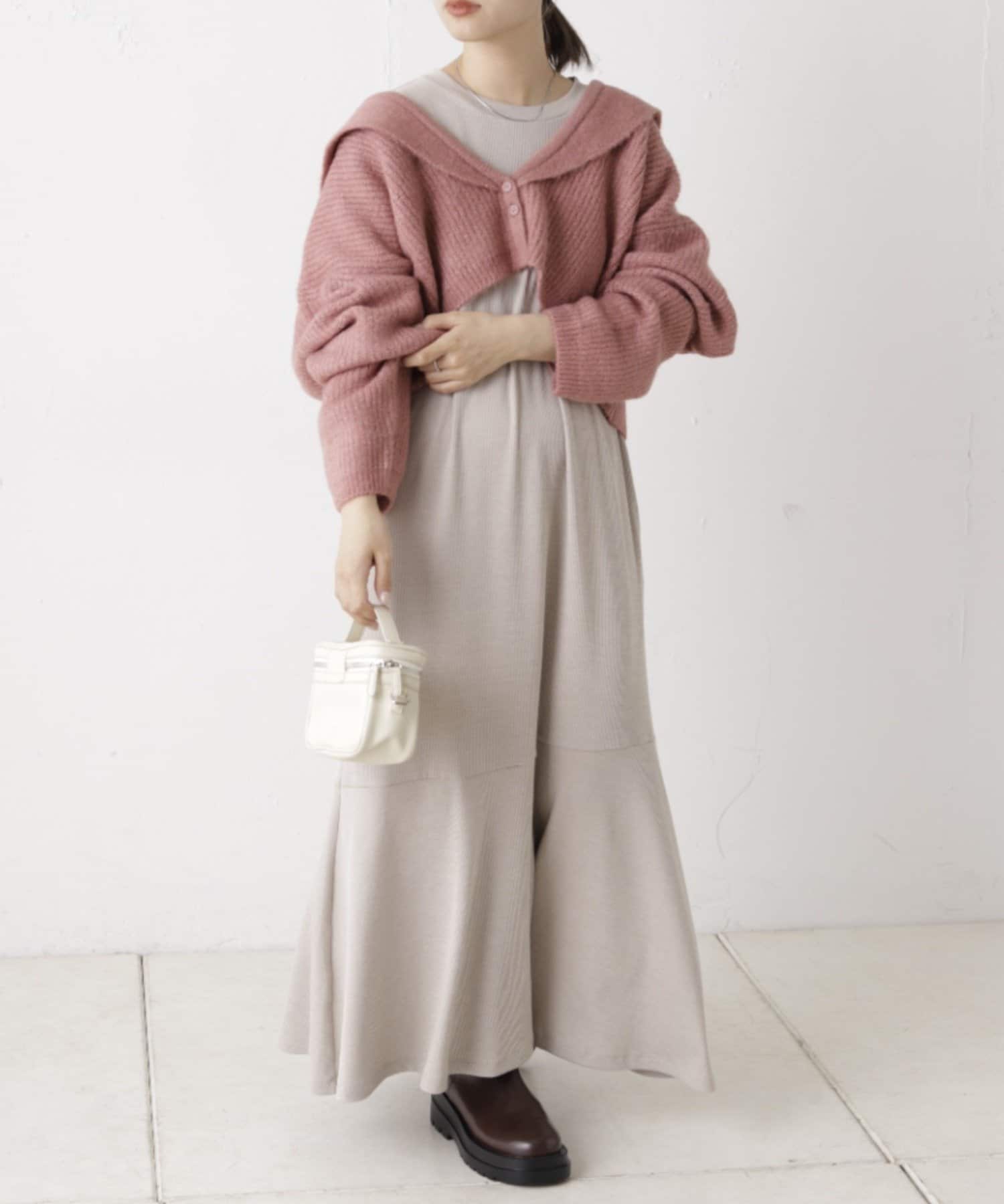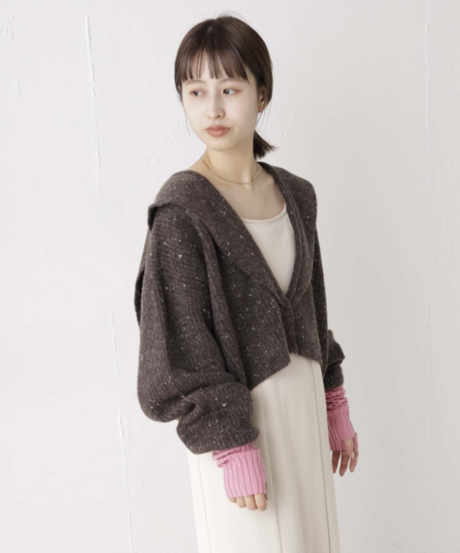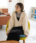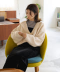すっきりした丈のカーディガンですので、ハイウエストのパンツと相性良く、足長効果を発揮します。