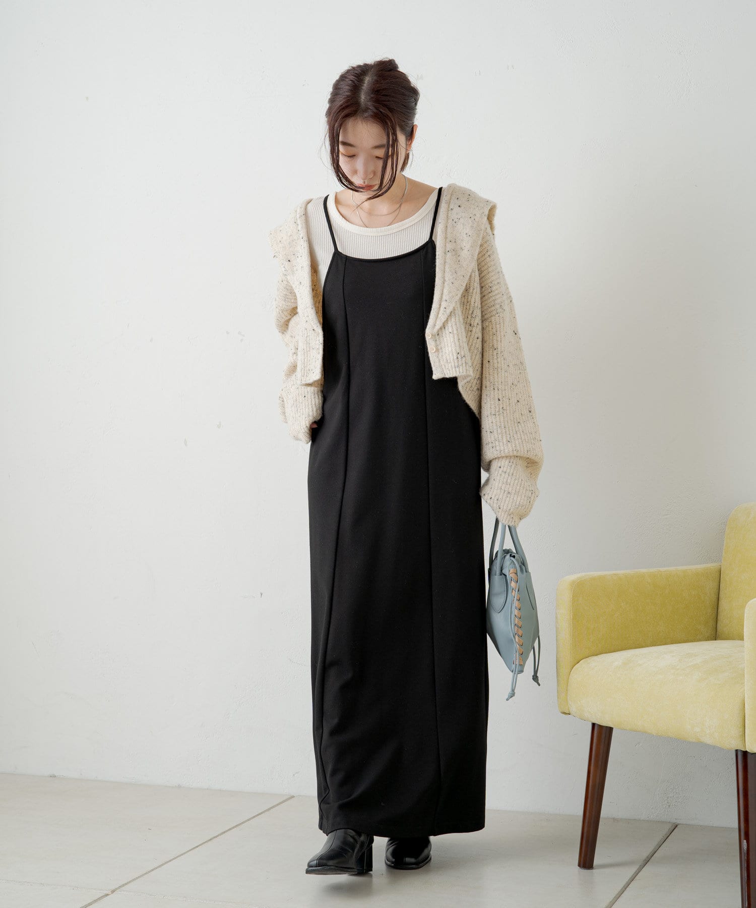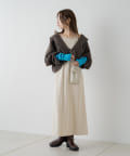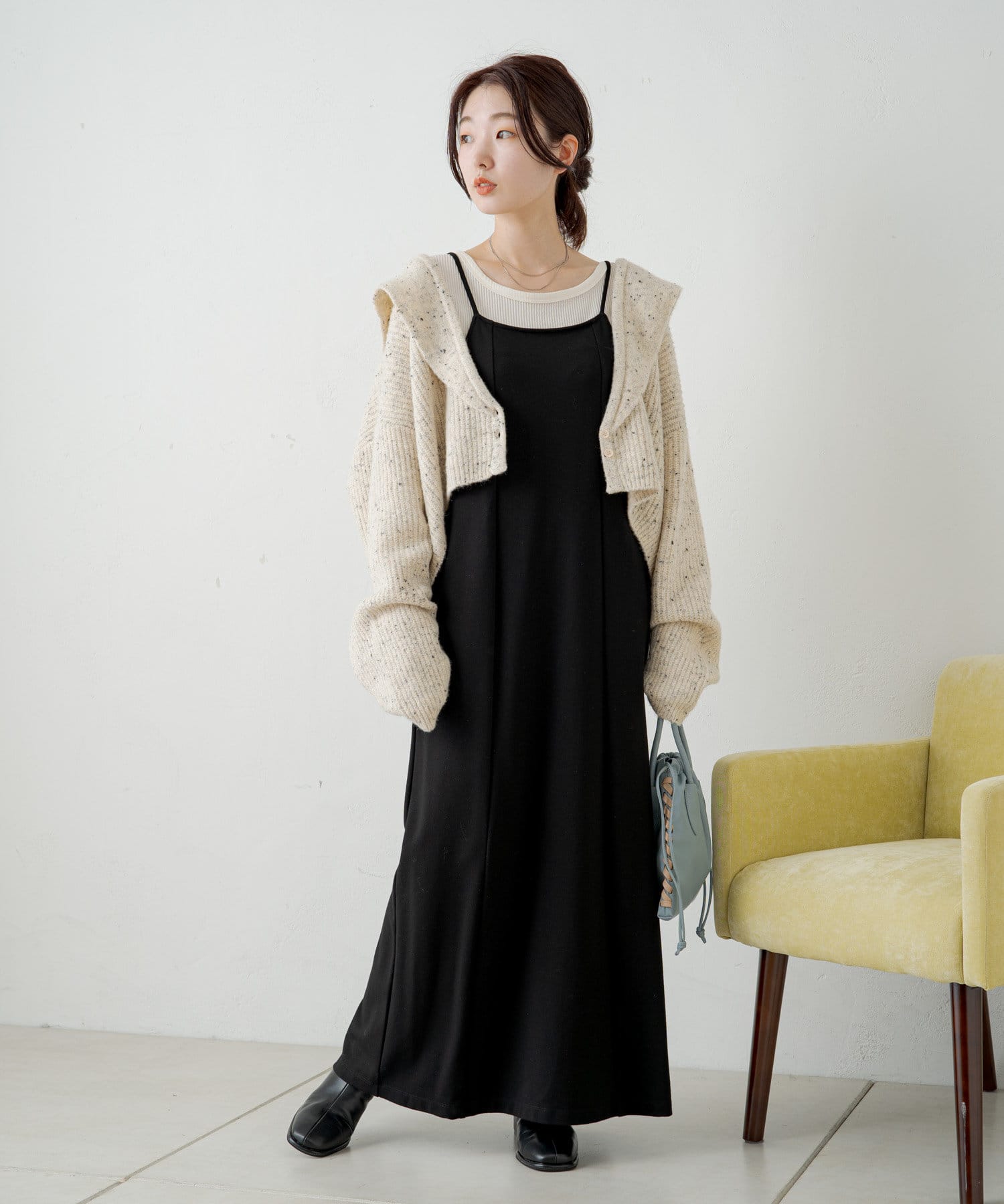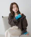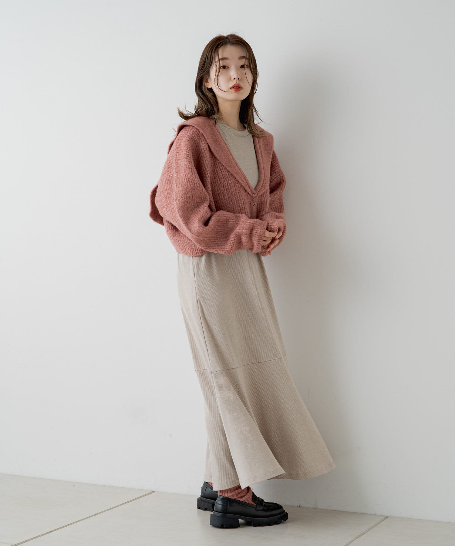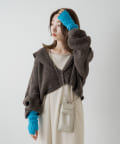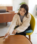 すっきりした丈のカーディガンですので、ハイウエストのパンツと相性良く、足長効果を発揮します。