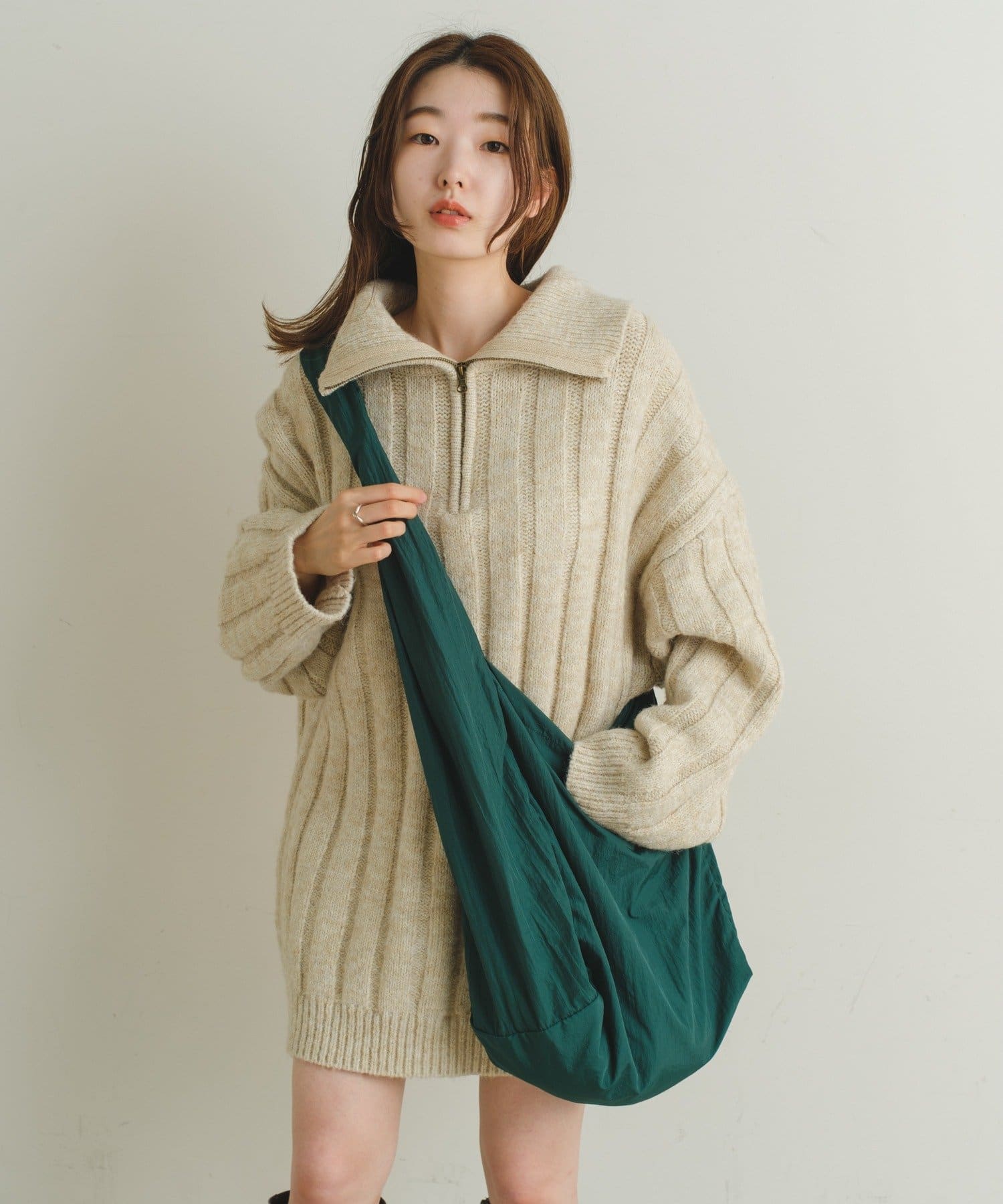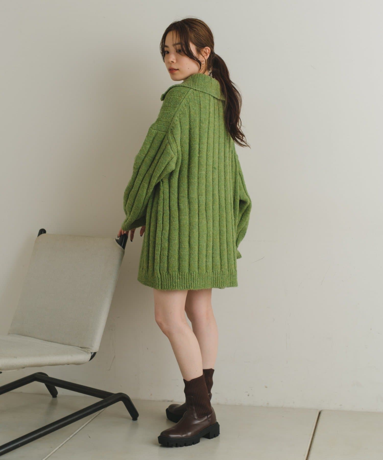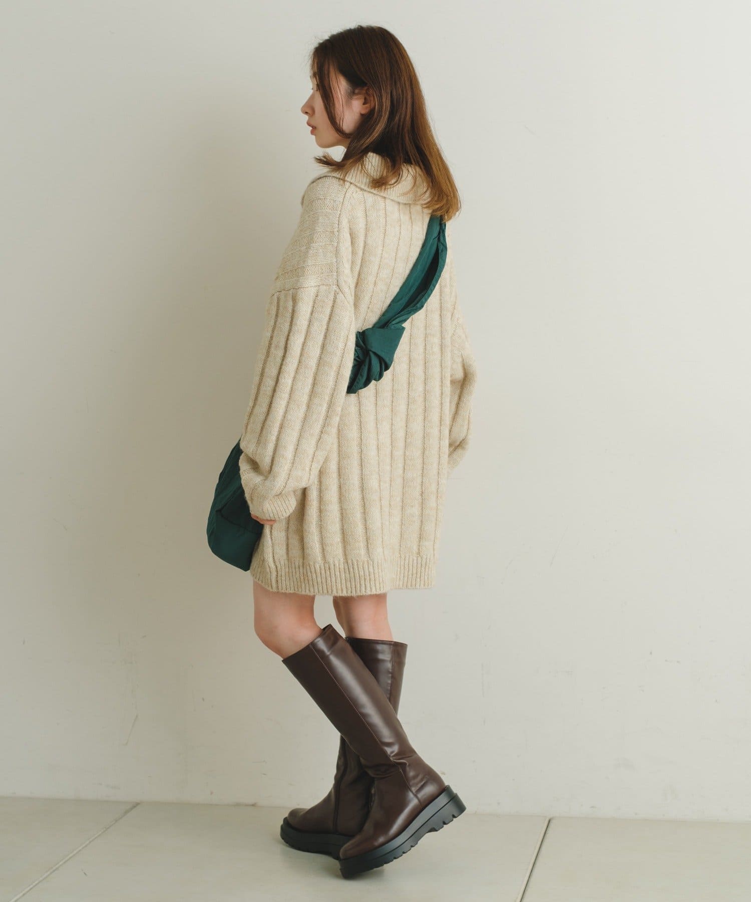 購入場所:パルクローゼットお尻がすっぽり隠れる丈感。ワンピとして着てブーツ合わせやスキニーやスカート何にでも合います。わたしはロングブーツと合わせるのが一番好きでした。ジップも開けても閉めてもどちらでも◎本当に可愛くて色違いも欲しいです。