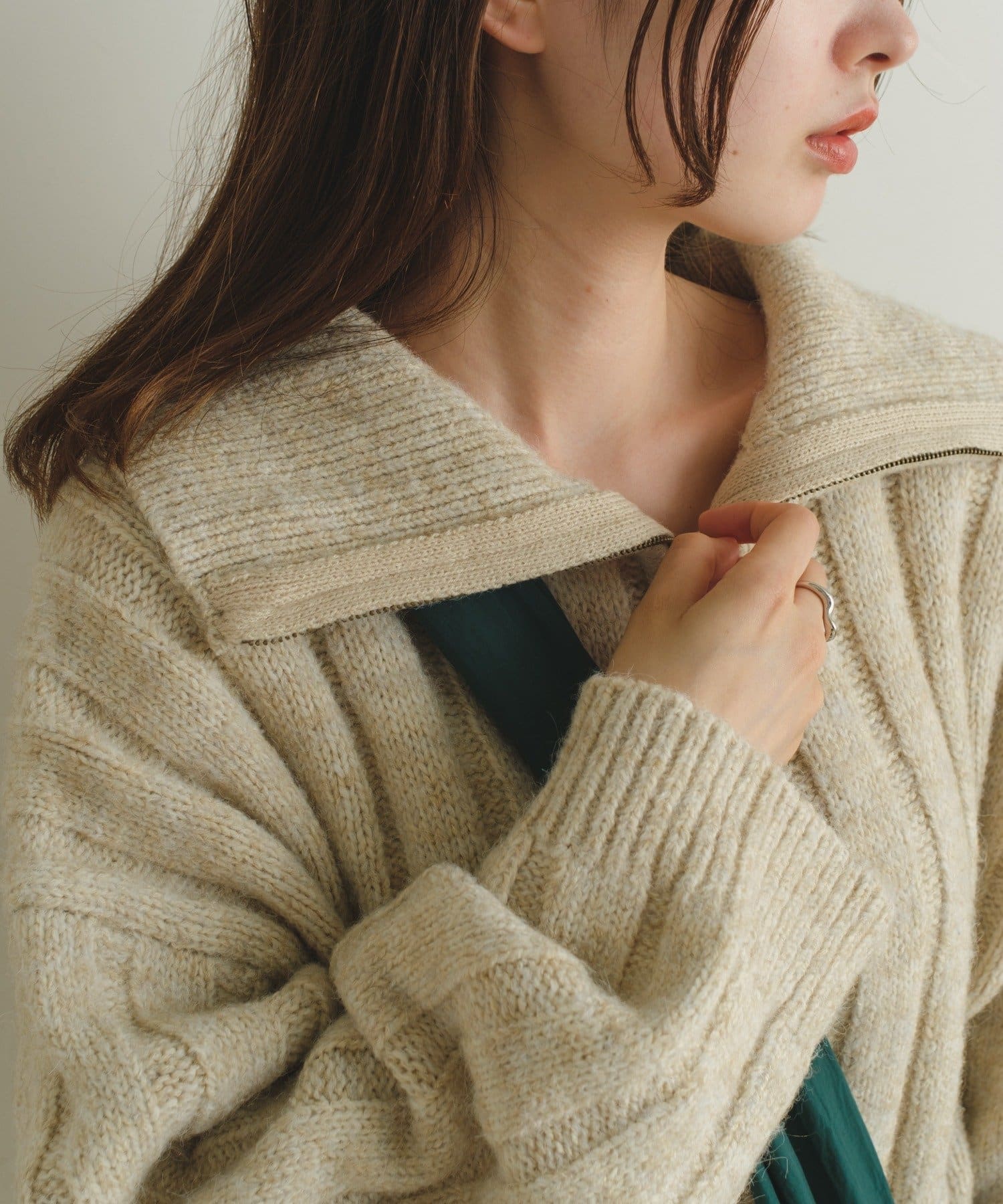 ジップを開けて衿のような着方の時は、インナーにハイネックを重ねてレイヤードもお楽しみ頂けます。