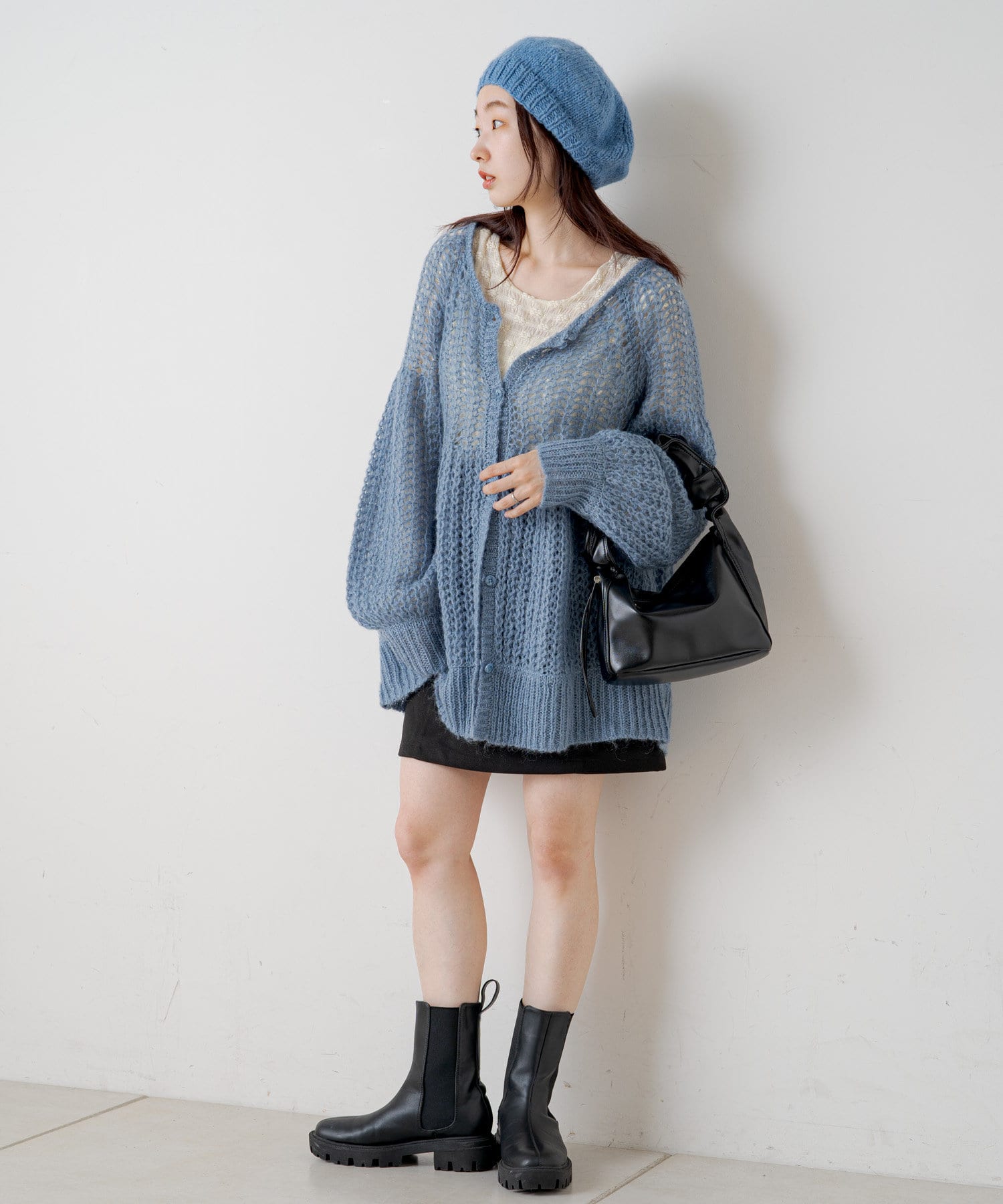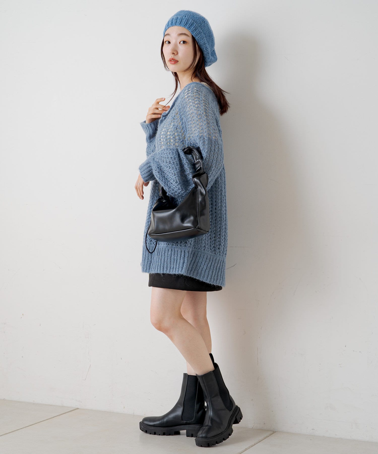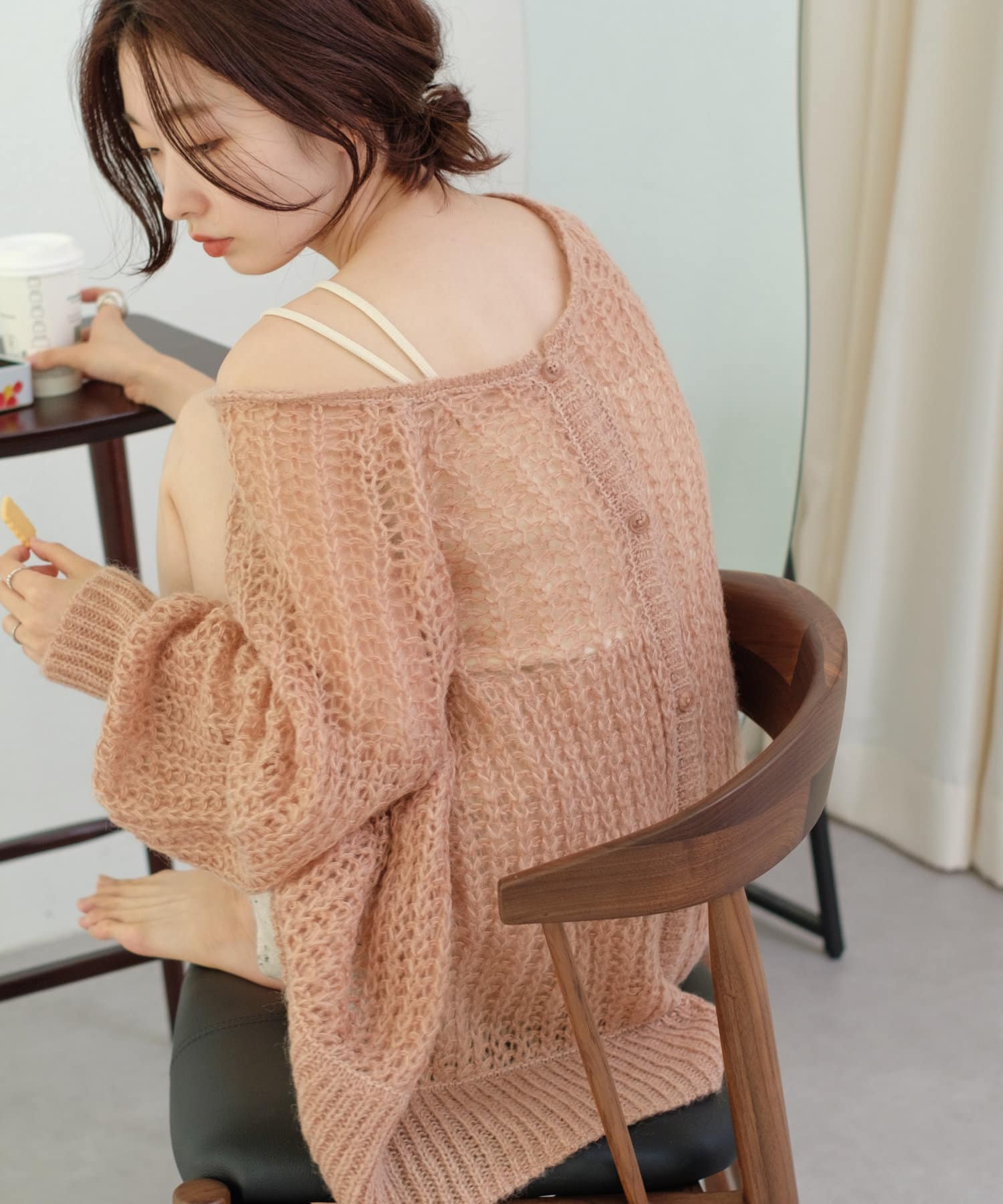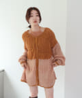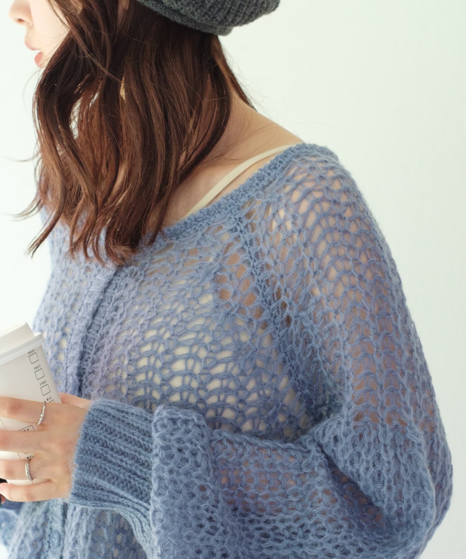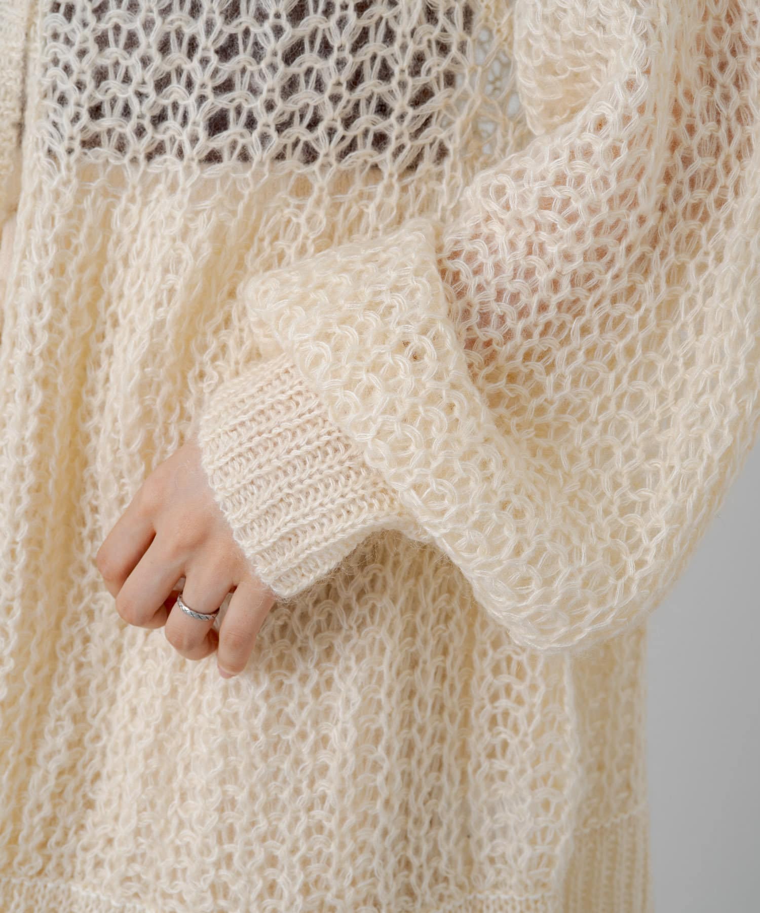 女性らしいふんわりとしたモヘヤ素材を使用したざっくり編みニット。