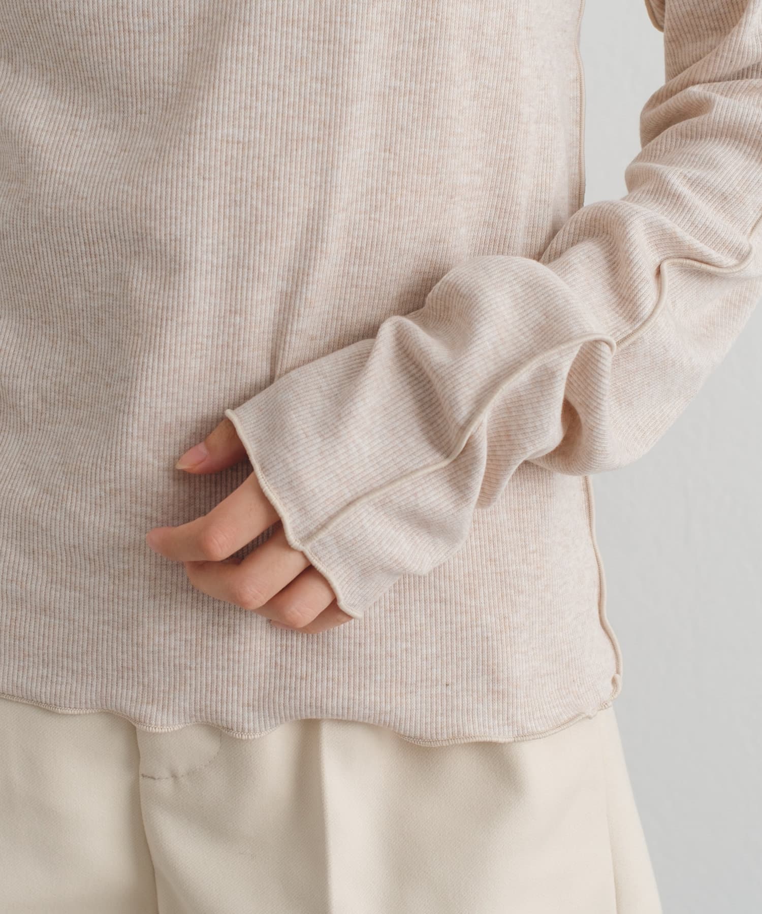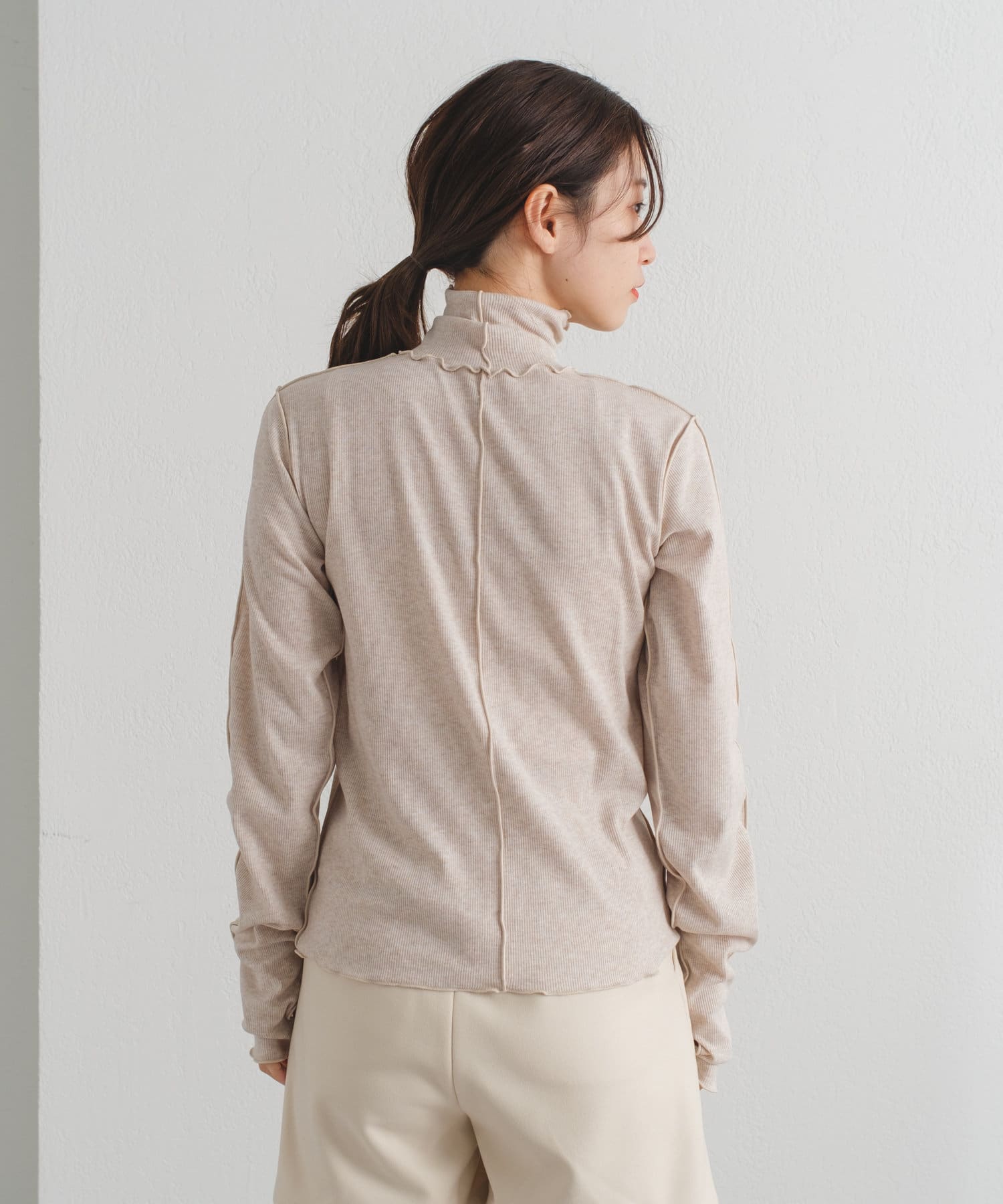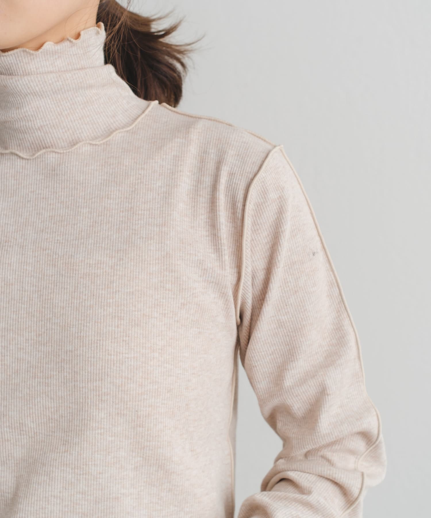 テレコメロウハイネックロンTと同様、テレコ素材で伸縮性が抜群なので、ハイネックの首まわりが窮屈に感じる方にもおすすめの一着。